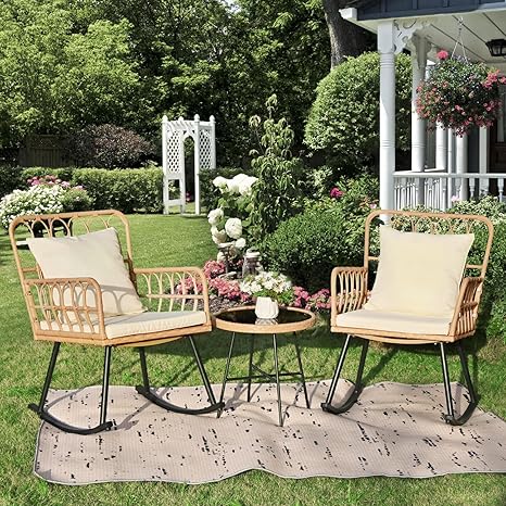 3 Pieces Patio Wicker Rocking Chairs Set, Boho Furniture Patio Bistro Sets, Rattan Woven Patio Conversation Sets with Washable Cushions and Glass Coffee Table for Balcony, Backyard, Outdoor