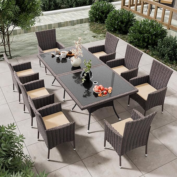 10 Pieces Dining Sets for 8 with Rattan Dining Set Chairs x8 and Square Table Glass Topx2 with Umbrella Cutout, Outdoor and Indoor Set-Brown