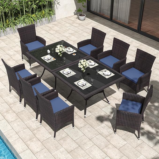10 Pieces Wicker Outdoor Furniture Dining Set Patio Dining Set for 8 with Tempered Glass Tabletop, Removable Cushions and Umbrella Cutout for Patio, Backyard, Garden, Poolside(Navy Blue)