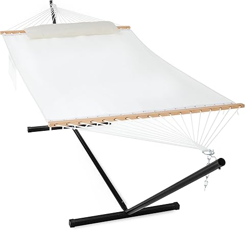 Waterproof Double Hammock with Stand for Outside Heavy Duty, 2 Person 55'' Large Quick Dry Textilene Hammocks with Hardwood Spreader Bar, Pillow, Side Pocket, 475lbs Capacity (Ivory)