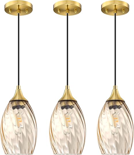 3 Pack 1 Light 5.3" Hanging Indoor Kitchen Island Pendant Ceiling Light Black Seeded Amber Glass Fixture, Black Finish Farmhouse Dinning Over Sink