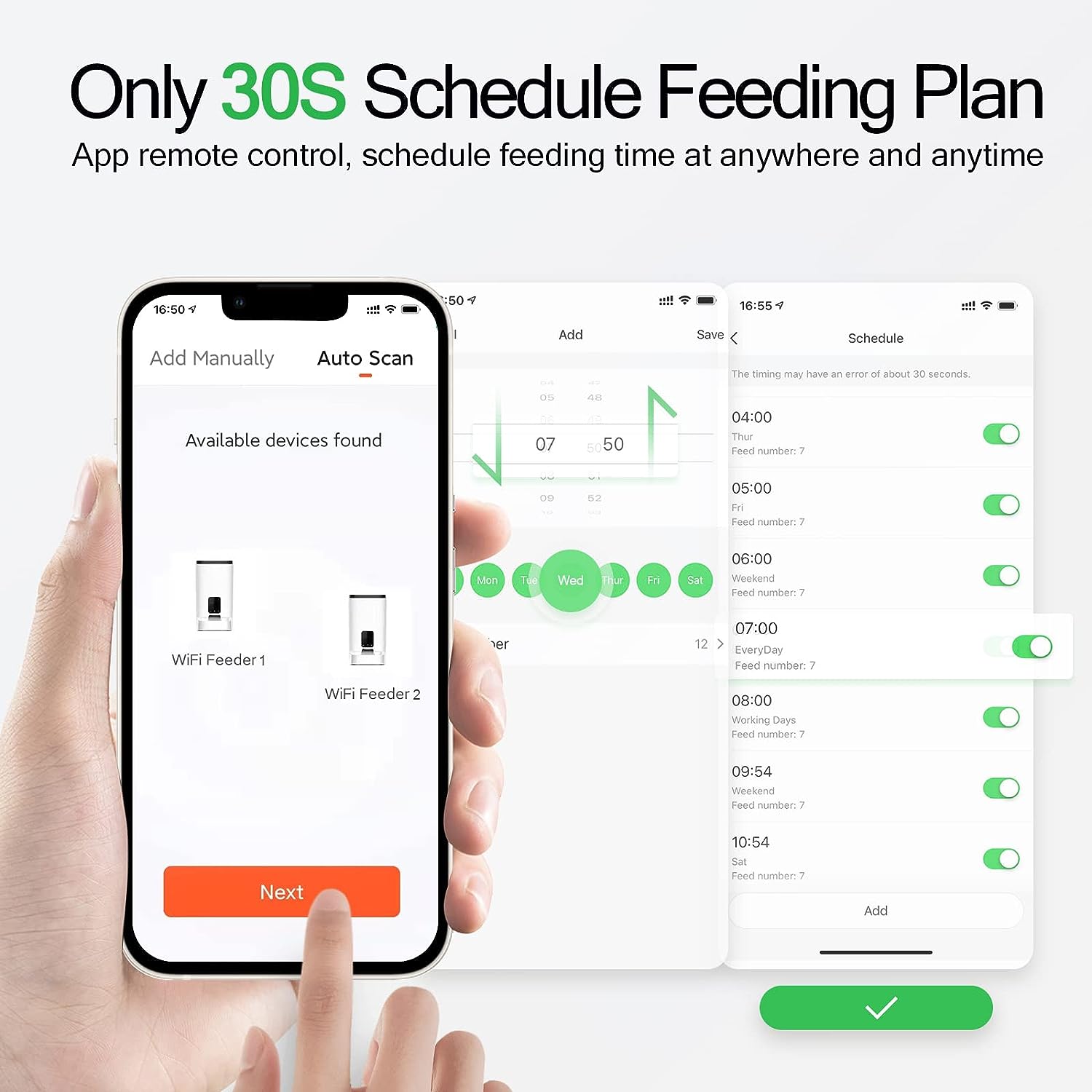 • 【Customizable 10s Personalized Meal Call】This automatic pet food dispenser has a built-in voice recorder and a speaker to call your pets to their meal with a 10-seconds-long message. Your voice let pets know you’re with him, enhancing the bond with your pet by keeping it fed regularly and feel safe & well cared.