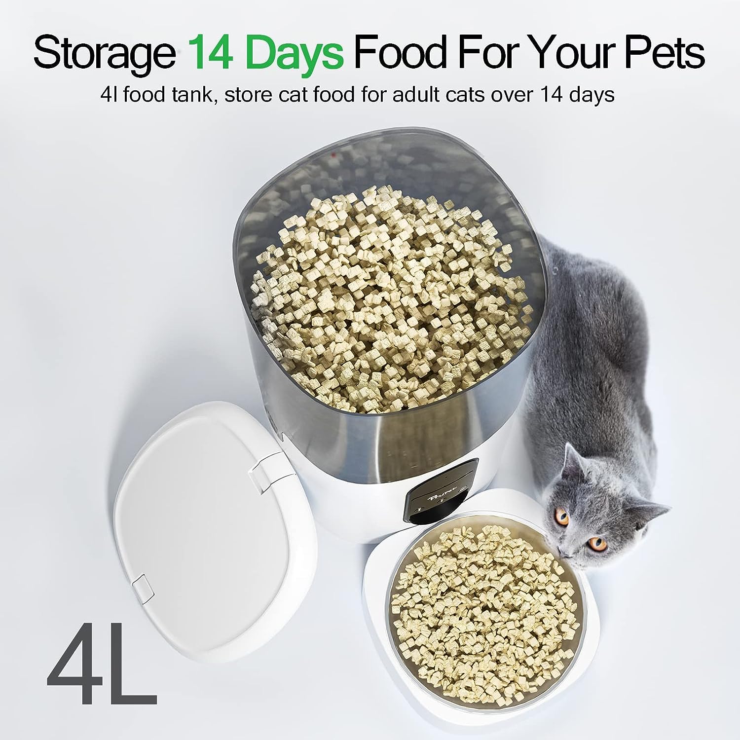• 【Large Capacity Smart Cat Feeder】-This 4L automatic cat food dispenser can schedule up to 1-10 meals with 1-12 servings each, it keeping you worry-free during short vacation or long working hours . Cat food dispenser holds the dry food in visible amount while avoiding opening of the cover frequently. Ensure Freshness of Dry Food with the Desiccant Bag. The removable stainless steel bowl is super easy to clean.