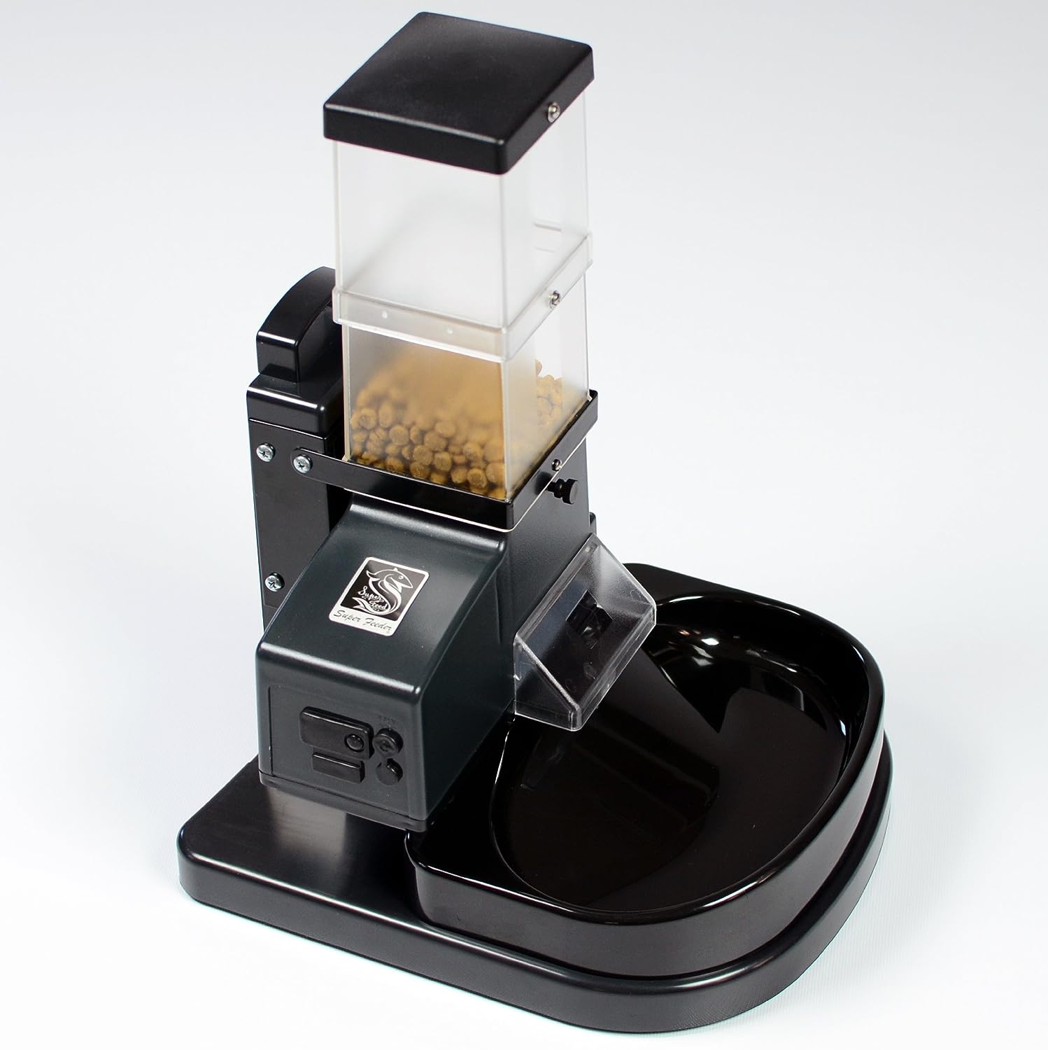 • Basic feeder holds 5 cups (volume) of food expendable with more extensions. Adjustable from very few kibbles to cups up to 8 times per day. Small snacks between main meals possible. Great for cats with vomiting issue when eating too much or for trimming weight.