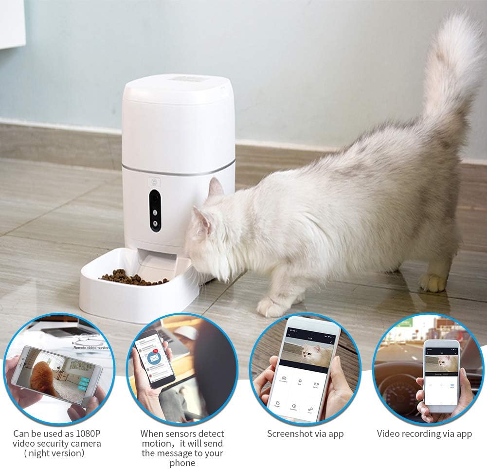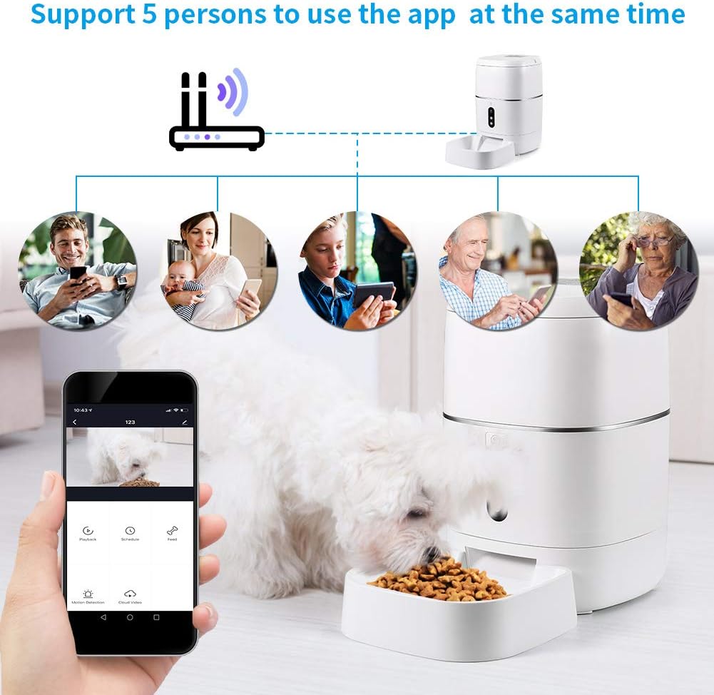 • APP Control & Multi-users & Motion Sensor Alarm:The auto cat feeder supports APP control( requires a wireless router 2.4GHz),compatible with iOS 7.5 or Android 4.0 and above,supporting 5 users to view simultaneously via app.The feeder is equipped with built-in motion sensor alarm,when motion is detected,it will send the message to your phone,making you know what is going on for your home instantly