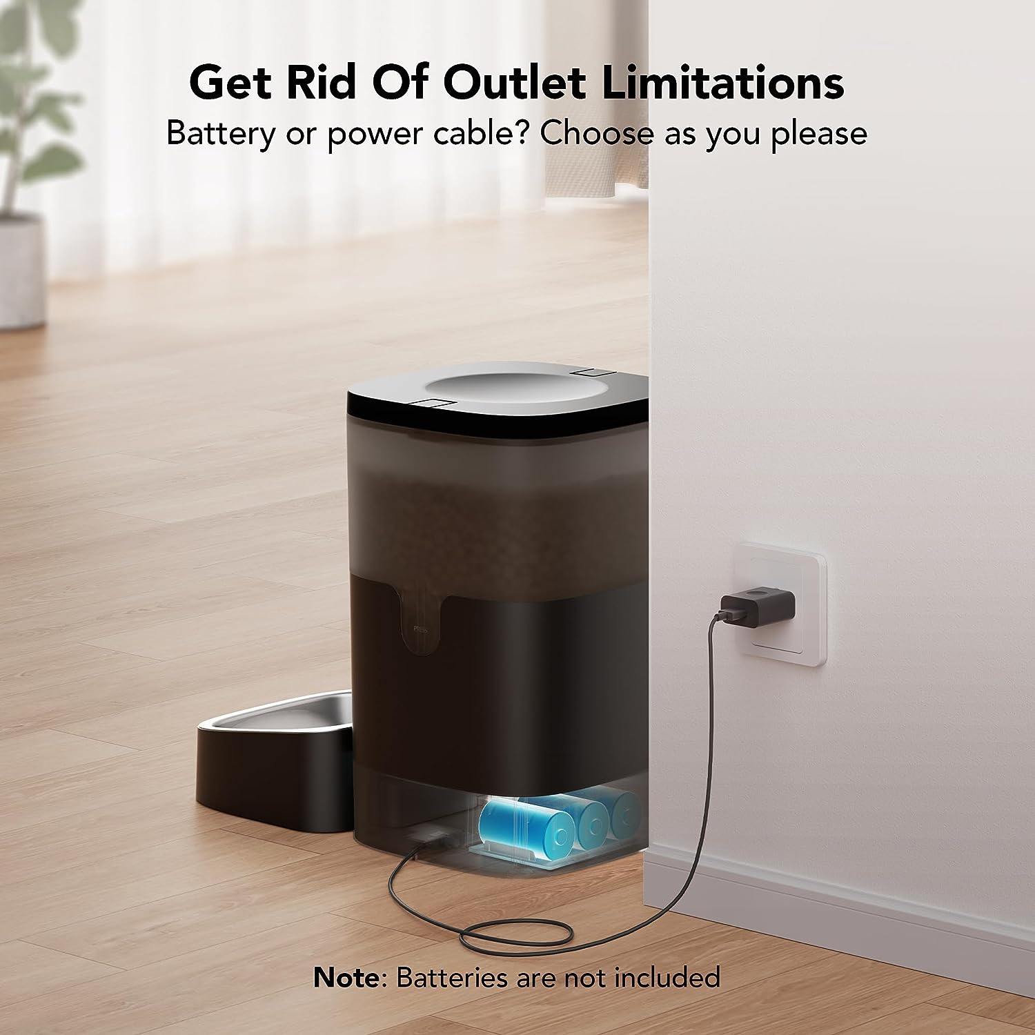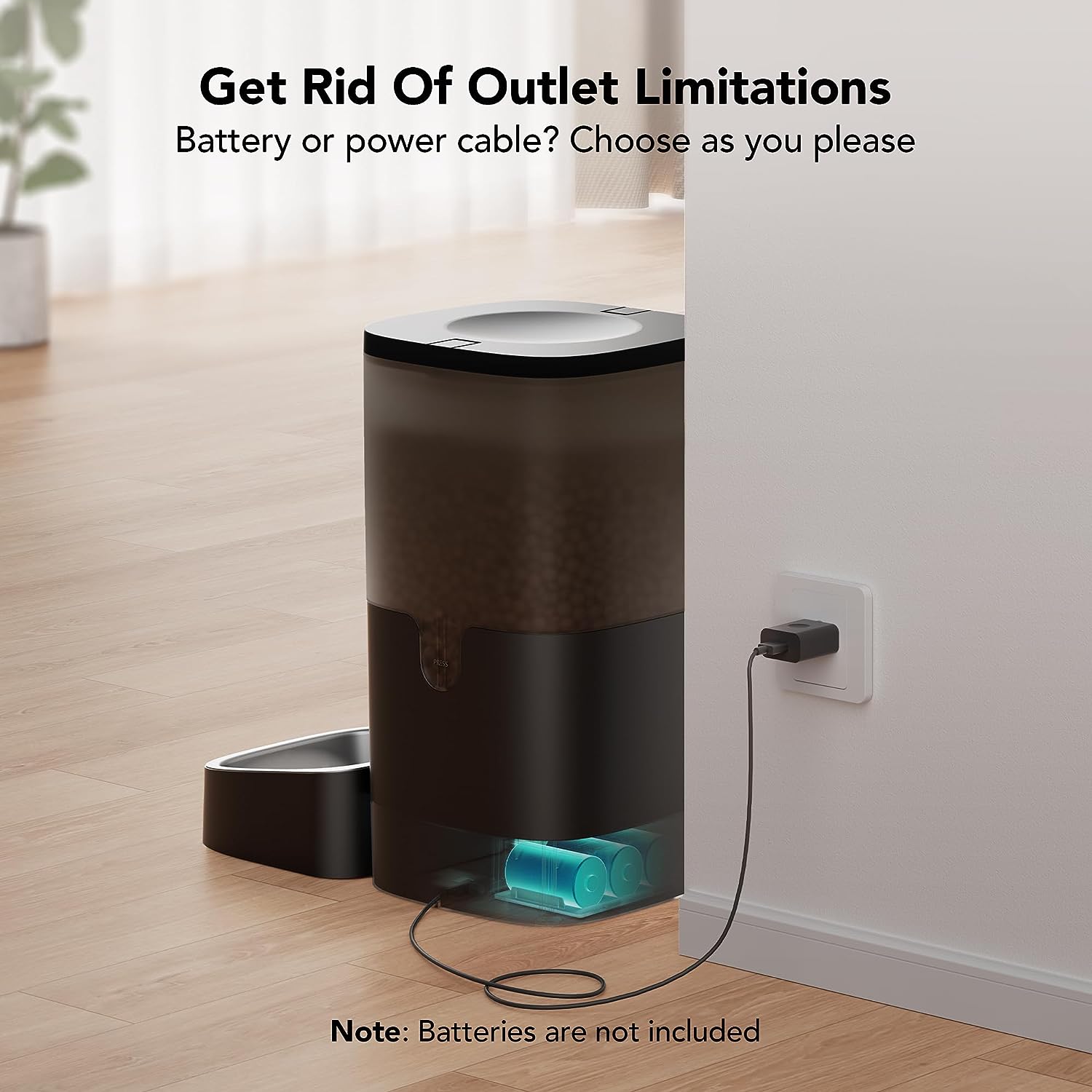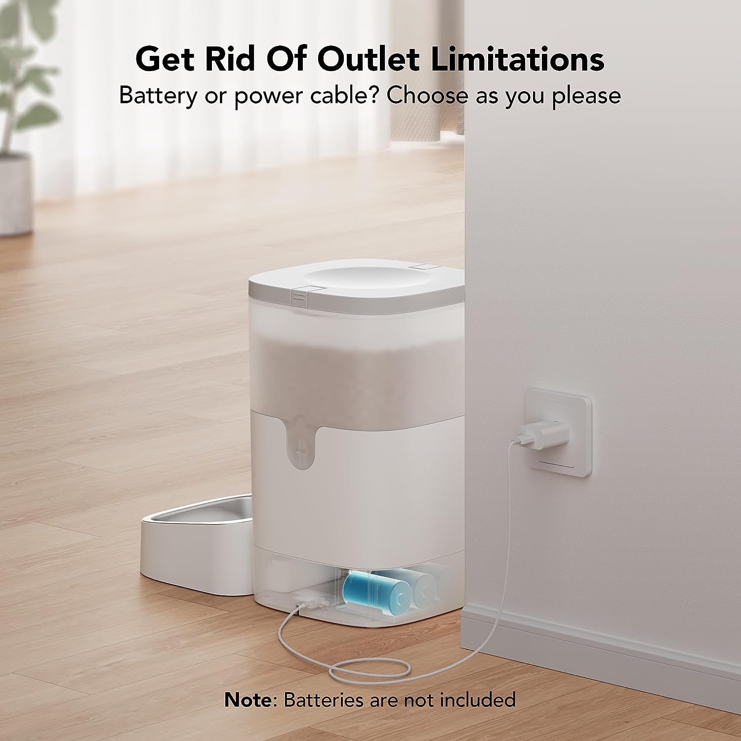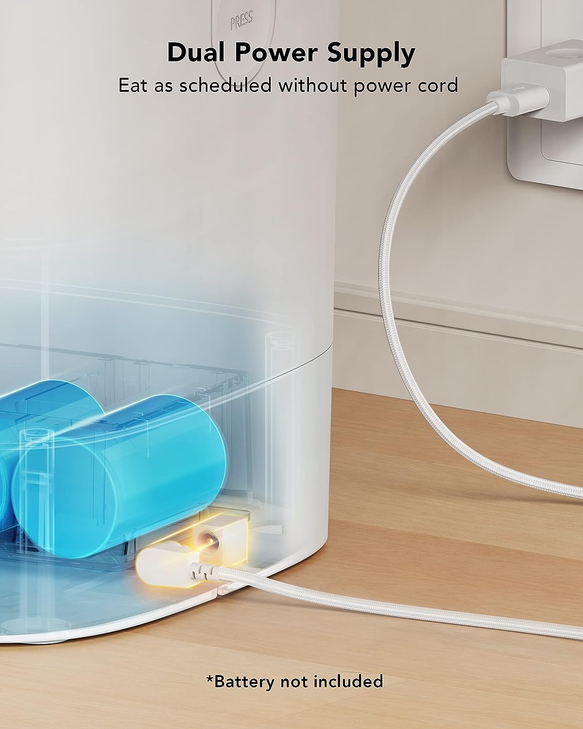 • Dual Power Choice-Use the 5V DC adapter while supply the automatic cat food dispenser via 3 alkaline D-cell batteries(not included) installed in case of power outages, ensure that your pet gets food consistently. (Equipped with setting memory to prevent sudden power failure)