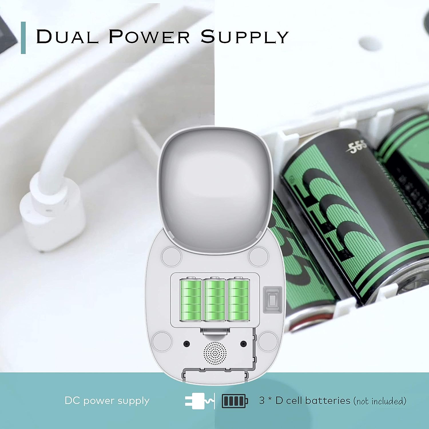 • ✅ SMART FEATURES: BATTERY BACK UP & LOW FOOD SENSOR: Our smart feeder can be connected to power outlet and battery operated (3 D-sized batteries are not included). When unplugged or power outage, the feeder will automatically divert to the battery powered supply for continuous operation. You will also receive an alert through the smart app features when food storage becomes less than 250g full.