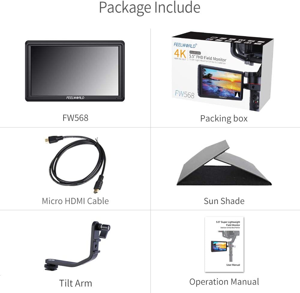 • 【Package Include】1× FW568 Monitor,1× Micro HDMI Cable, 1× Sunshade, 1× Tilt Arm, 1× Manual【Note: battery not include】. 【One year warranty】We are the FEELWORLD Official Store, if you have any question, just feel free to contact us, we will do our best to help you solve the problem.