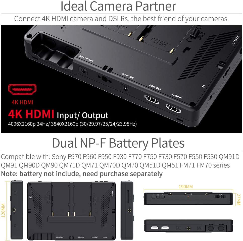 • 【Package Include】1× LUT7 Monitor, 1× Mini/ Micro HDMI to HDMI Cable, 1× Tilt Arm, 1× Manual【Note: battery not include】.【One year warranty】We are always do do our best to improve our product and better services, just feel free to contact us.