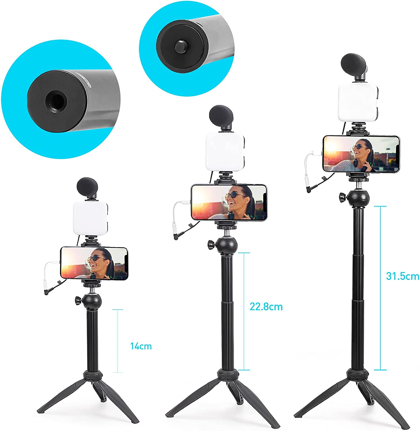 • 【Adjustable Tripod and Extension Rod】With the adjustable extension rod,the video kit is suitable for selfies,family photos and videography(length from 5.5"to 12.4":14cm-31.5cm).The handheld table tripod with a 360° swiveling ball head can help you capture from various angles,there are non-slip rubber mat on the bottom to keep the tripod stable.