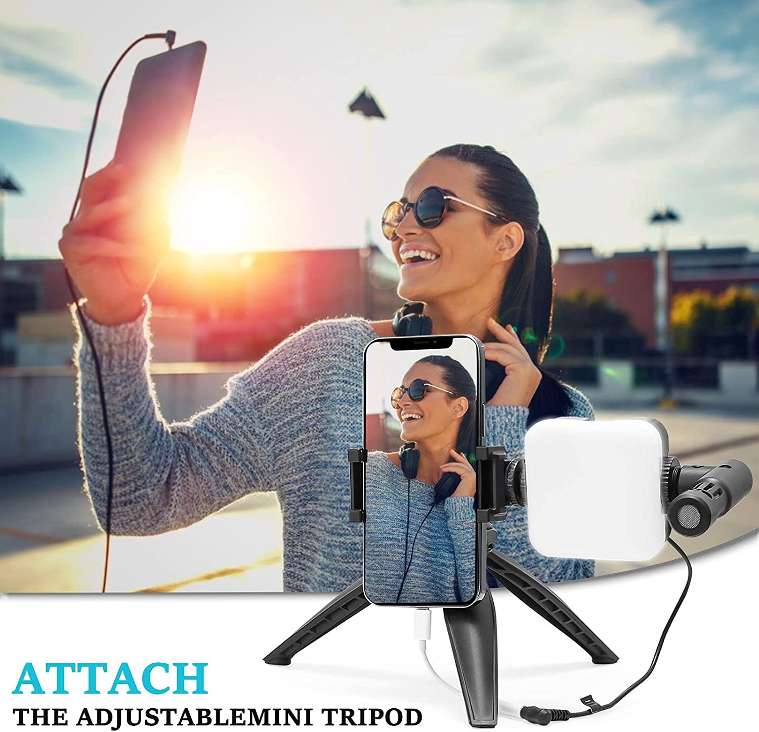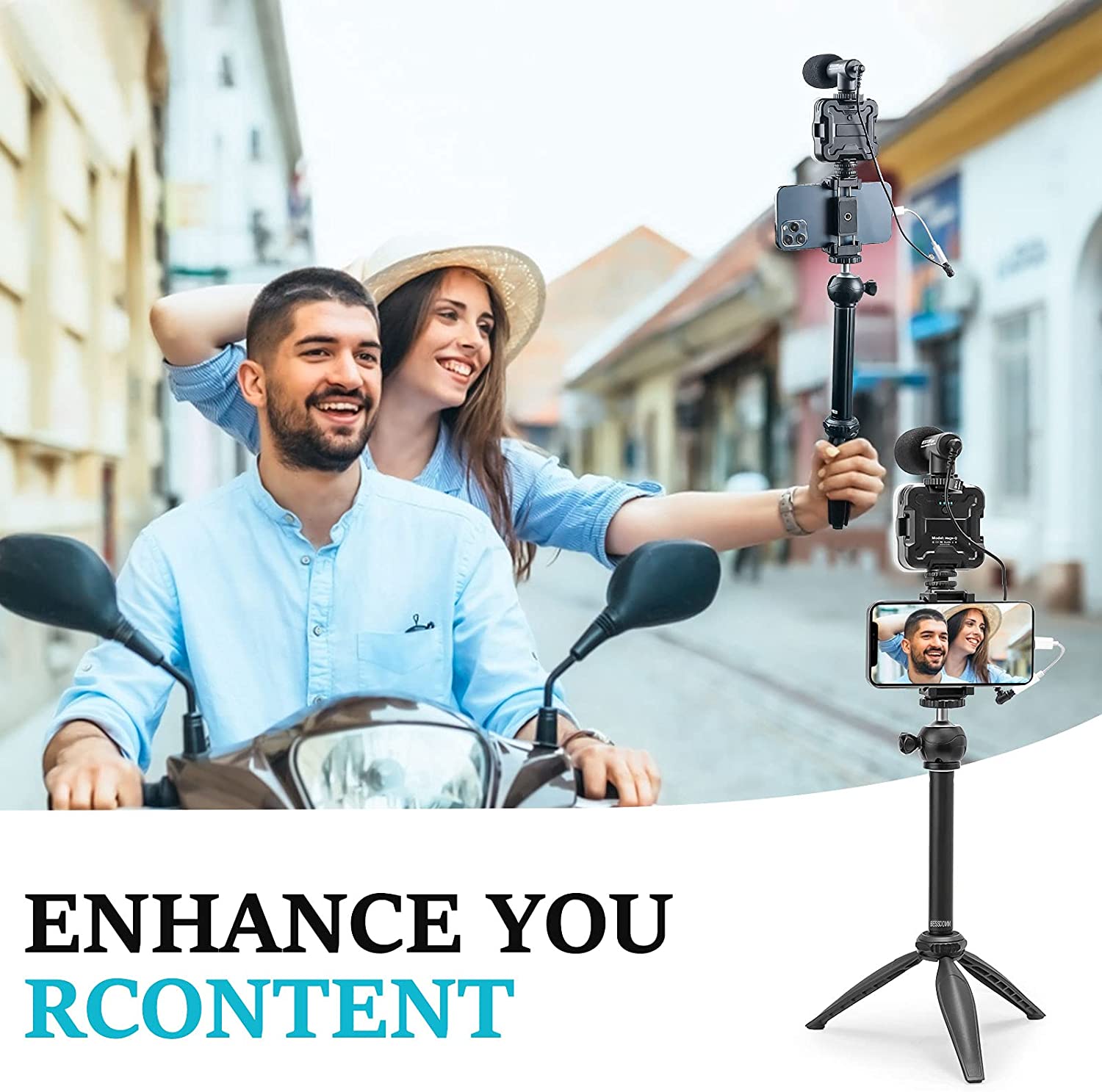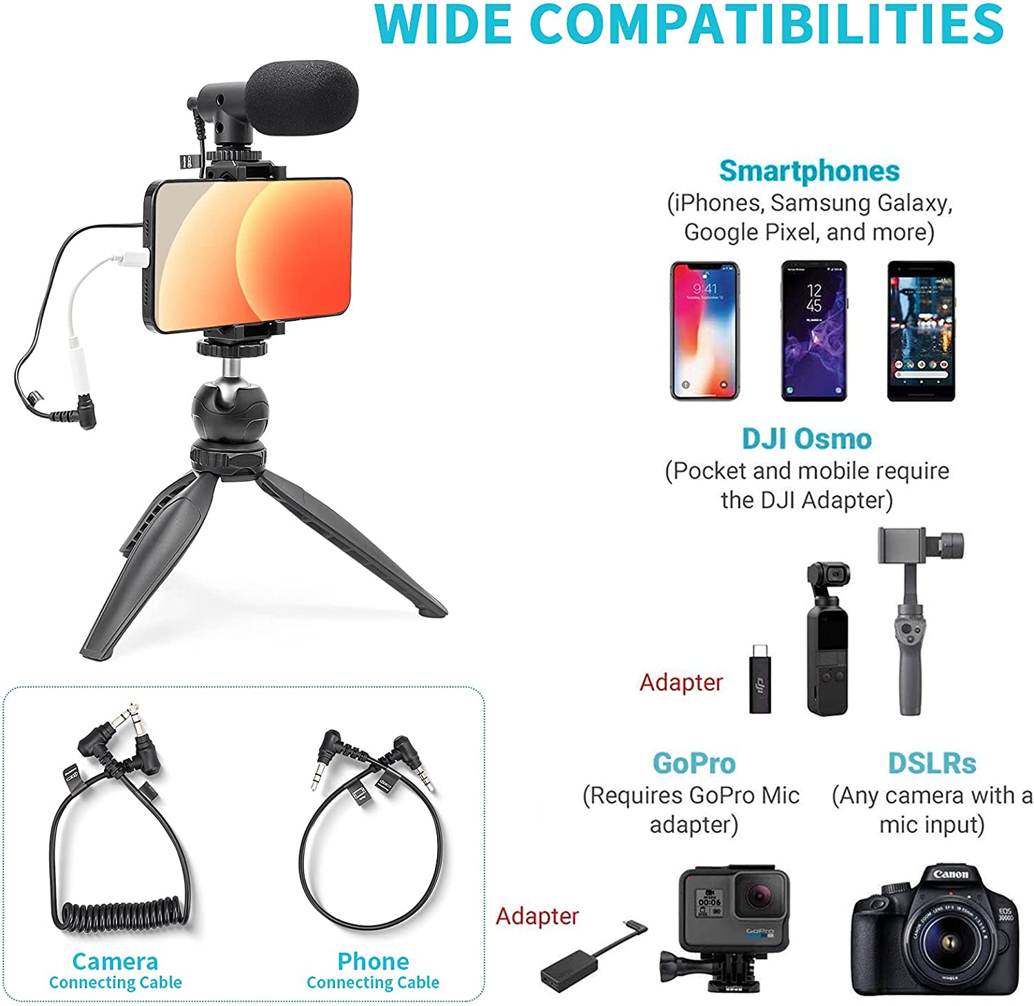 • 【Wide Compatibility of Phone Clip】The adjustable phone clamp of this vlogging kit can be extended from 2.2" to 3.6" width(55mm-91mm),which is compatible with iPhone 13/13 12 11 Pro Max/X/XS/8 Plus/5s/SE,Samsung,Galaxy Note and more.(NOTE:The 3.5mm Adapter Dongle Cables for Lightning,USB and USB-C are Not Included).
