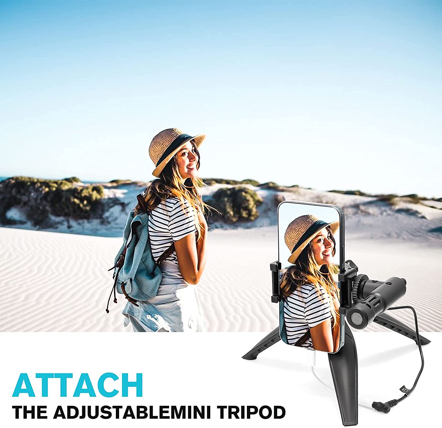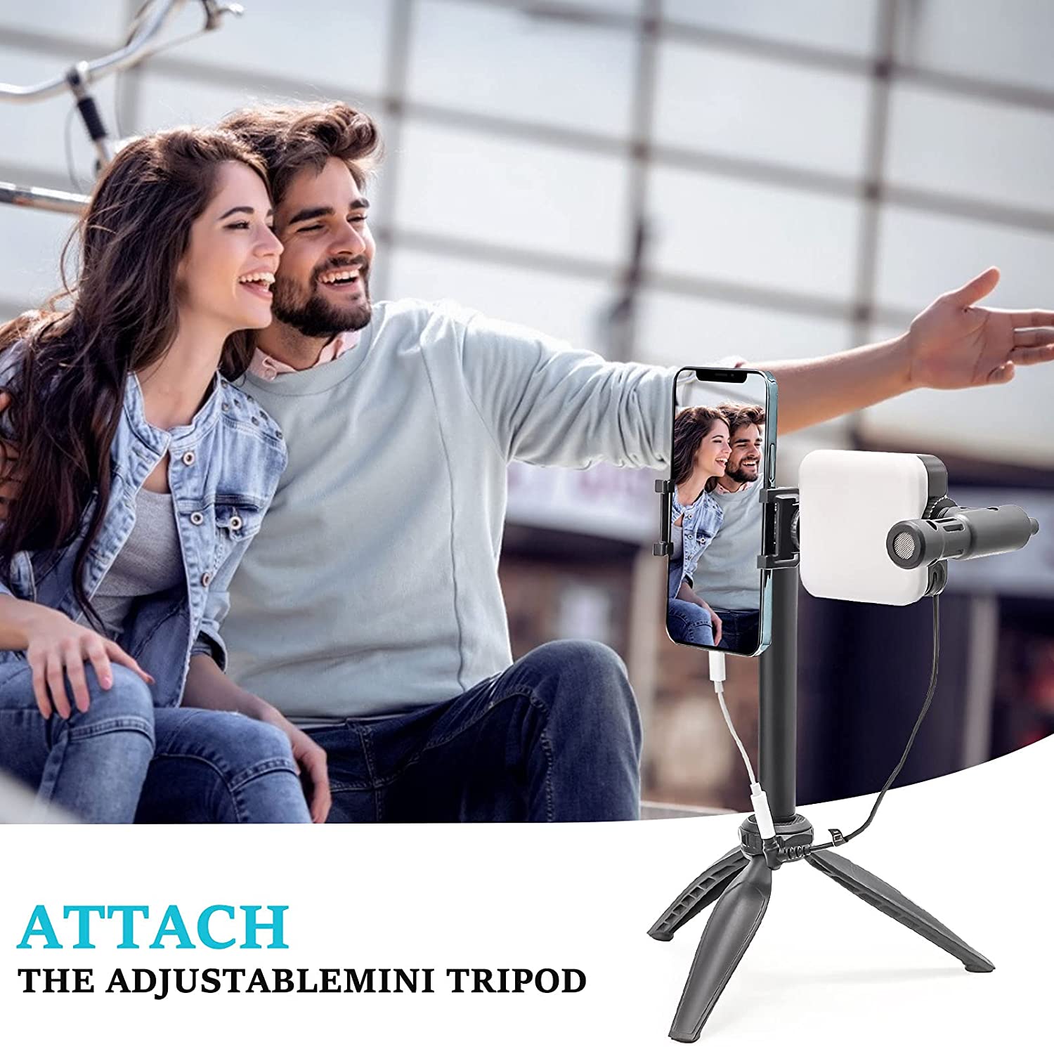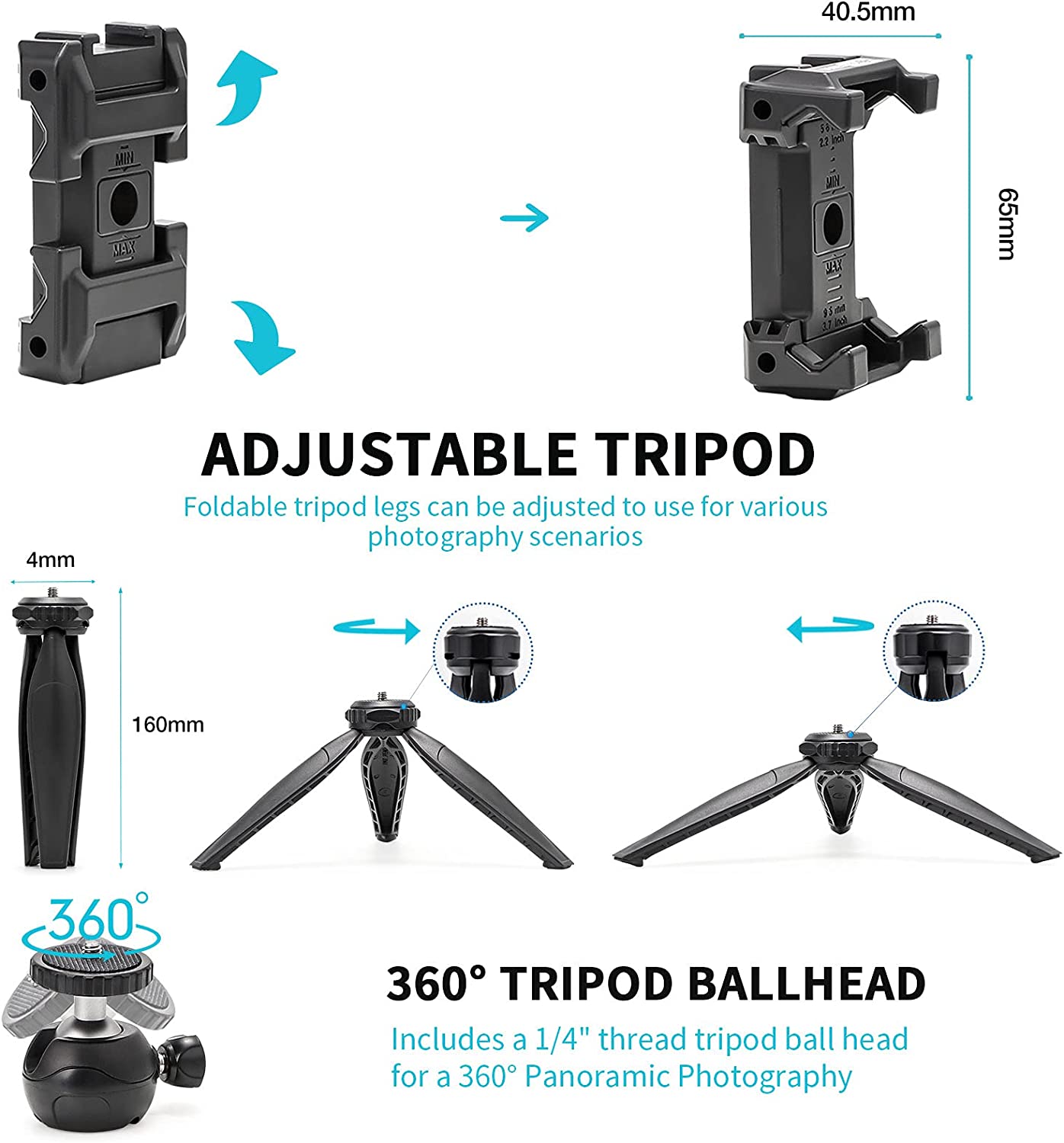 • 【Wide Compatibility of Phone Clip】The adjustable phone clamp of this vlogging kit can be extended from 2.2" to 3.6" width(55mm-91mm),which is compatible with iPhone 13/13 12 11 Pro Max/X/XS/8 Plus/5s/SE,Samsung,Galaxy Note and more.(NOTE:The 3.5mm Adapter Dongle Cables for Lightning,USB and USB-C are Not Included).