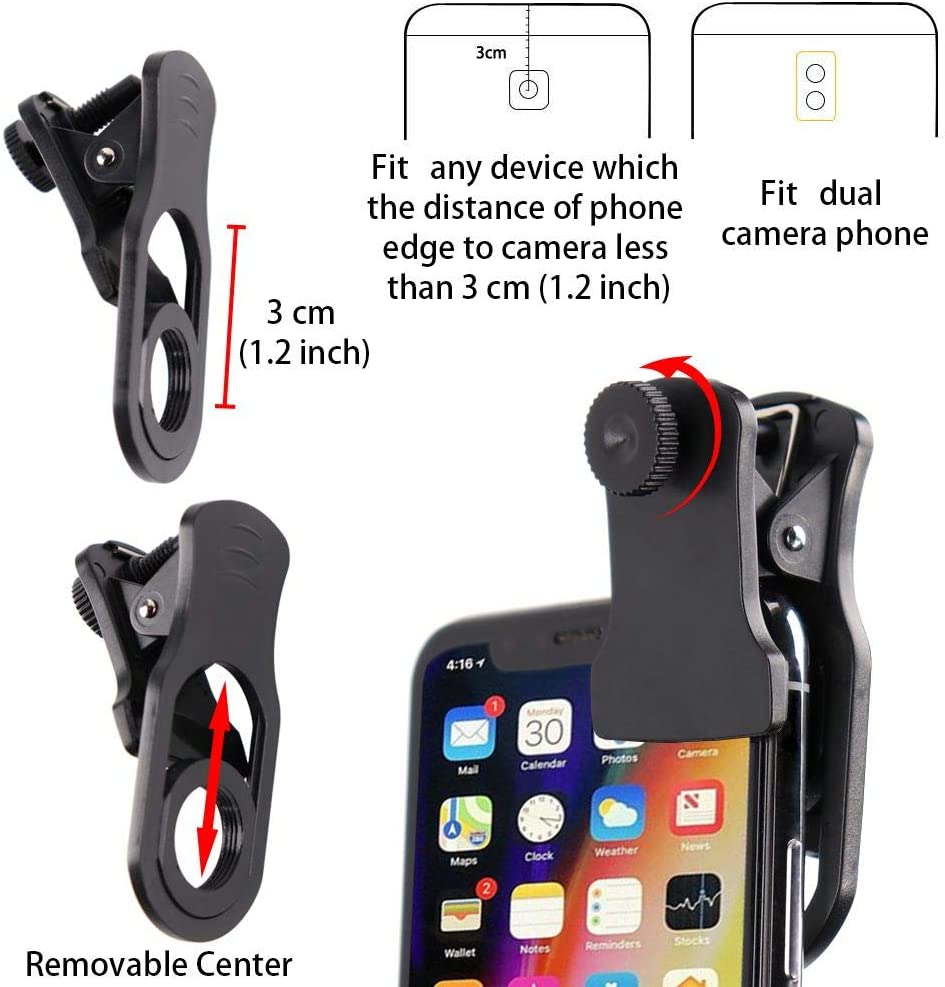 • Wide Compatibility: Universal detachable clamp design, fit any device which the distance of phone edge to camera less than 1.2 inch,including iPhone 12 11 Xs Max, X, 8, 7, 6s, 6s Plus, 6, 6 Plus, Samsung Note, Galaxy S8+, S8, S7, S7 Edge, iPad and more. Note: for dual or triple rear camera phone, attach the lenses to main camera, the clip might cover the other phone camera or flash, but it won't affact the function of the camera.