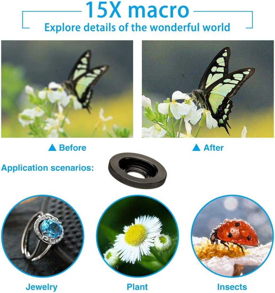 • 4K HD Super Wide Angle Lens& Macro Lens: The highlight of the iphone camera lens kit, it produces no distorted image, the picture quality is much better than others. The wide angle lens allow you to fit more into the frame. Macro lens focus much closer than your phone camera, capture small objects at very close distances (1-2 inch) for details,it can not focus beyond 2 inches.