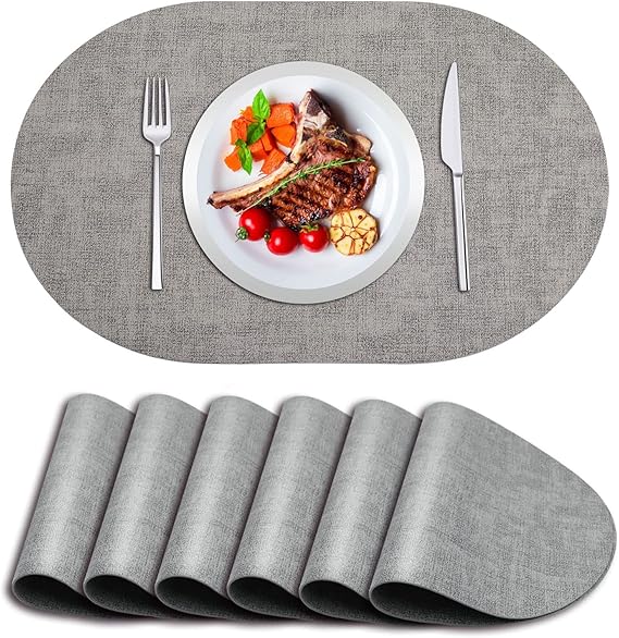 ANUNU Placemats Set of 6 - Double-Sided Faux Leather Design Oval Placemats for Dining Table Mats Heat Resistant Waterproof Wipeable Washable Non-Slip Kitchen Table Placemats (Set of 6, Grey)