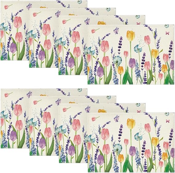 Artoid Mode Lavender Tulip Flowers Floral Spring Placemats Set of 8, 12x18 Inch Seasonal Table Mats for Party Kitchen Dining Decoration