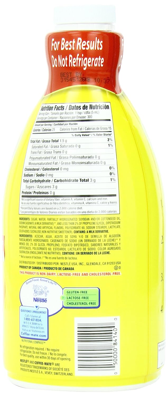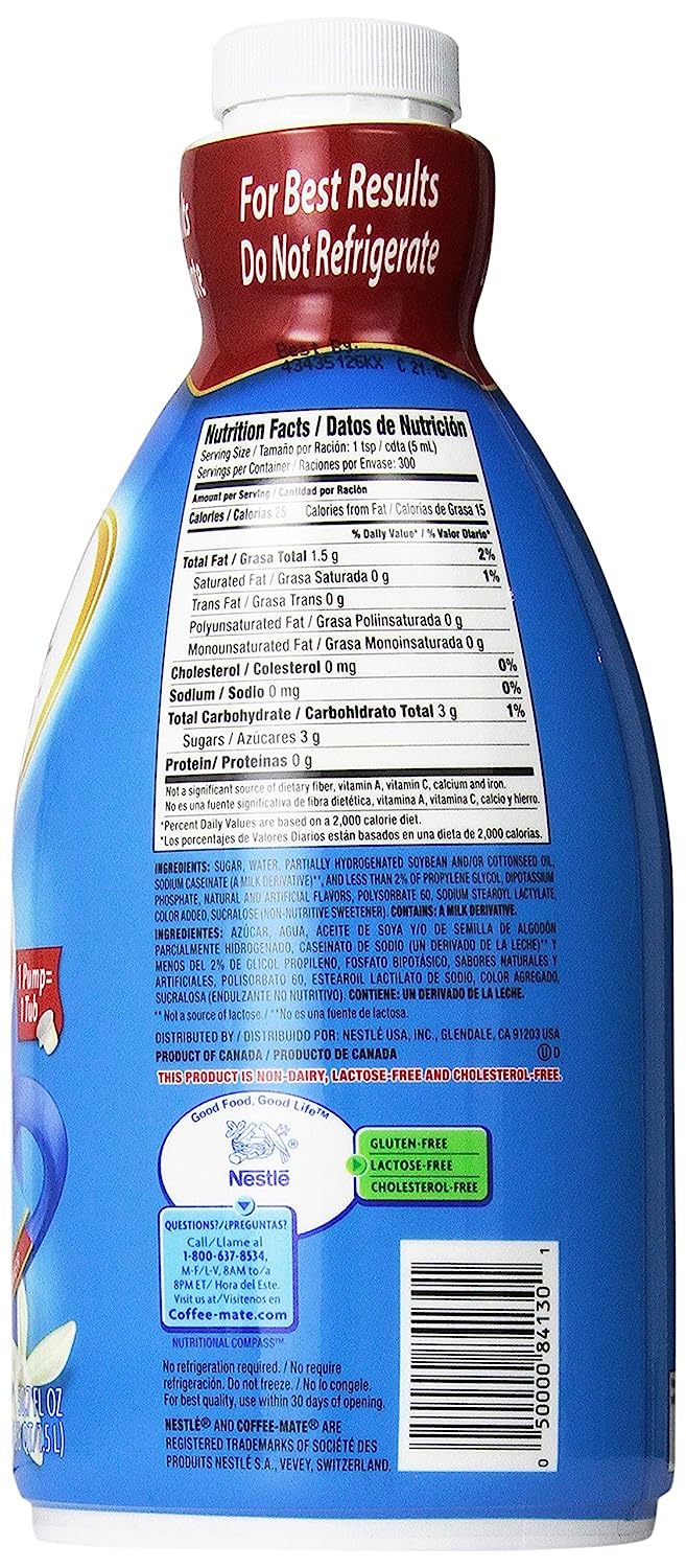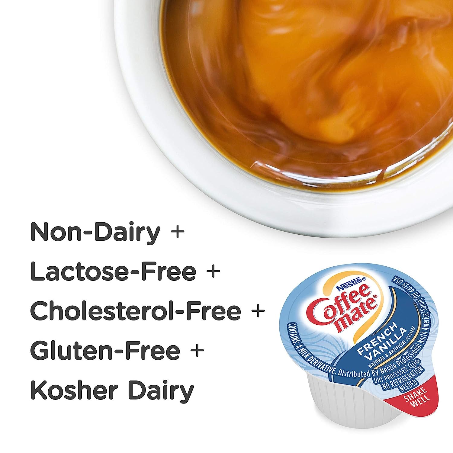 Nestle Coffee mate French Vanilla flavored liquid creamer singles are irresistible. Within each cup is a harmonious blend between a deliciously rich, velvety smooth classic and bright French Vanilla notes that will enhance and enrich your coffee offering. Packaged in a 180-count box, these are the perfect solution for a delicious and convenient option to customize your favorite beverage. Our coffee creamer singles don’t need to be refrigerated and can retain their irresistible flavor at room temperature for up to 9 months. Easy to use - just shake, open and pour. Non-Dairy + Lactose-Free + Cholesterol-Free + Gluten-Free + Kosher Dairy. Coffee mate is America's #1 coffee creamer. With a variety of flavors and formats, Coffee mate has your coffee creamer needs covered. Delight your employees, customers and guests by offering Coffee mate liquid creamer in your workplace, break room or kitchen.