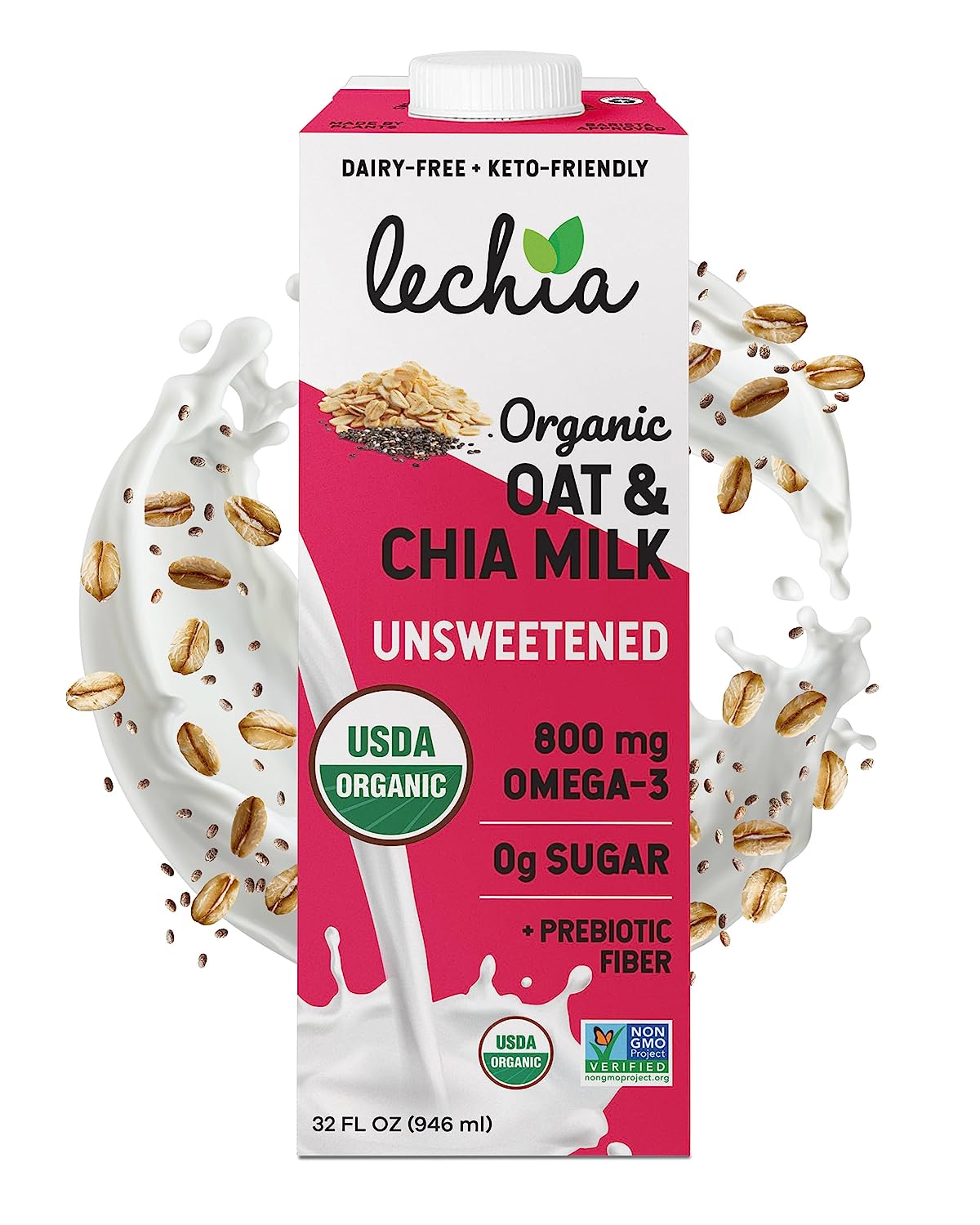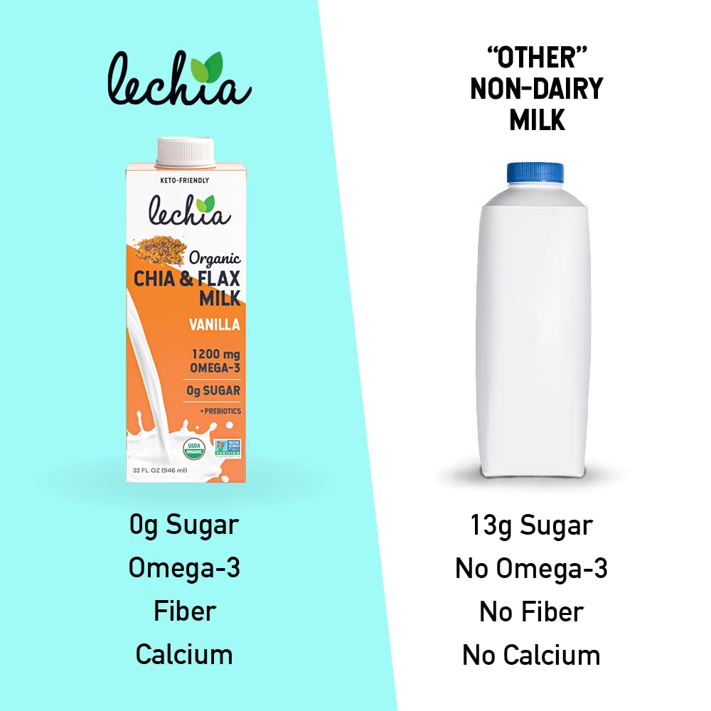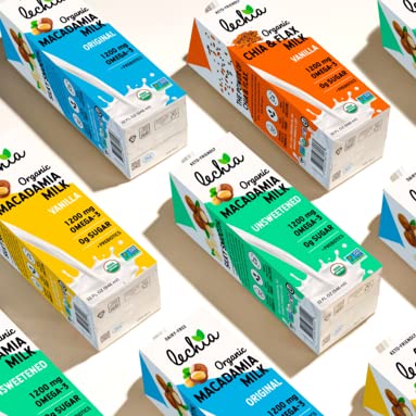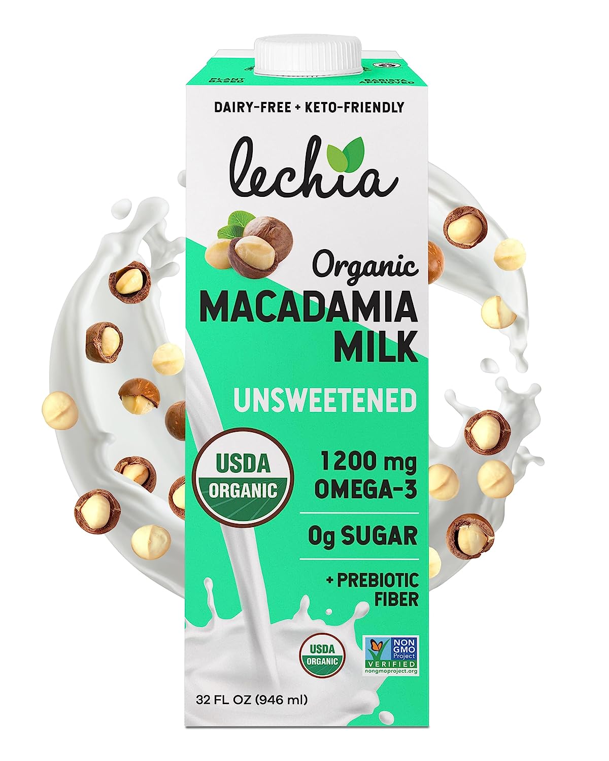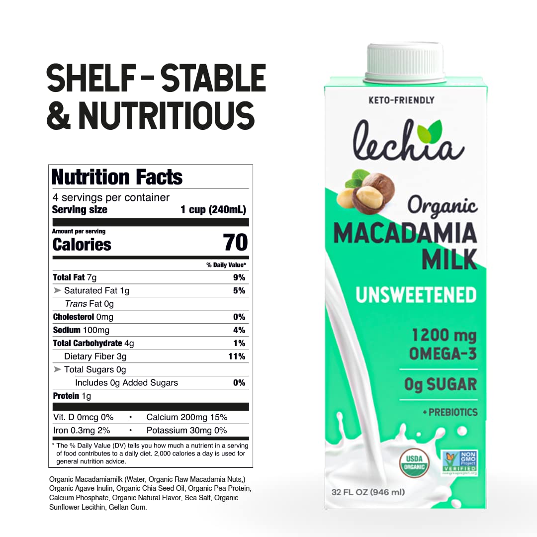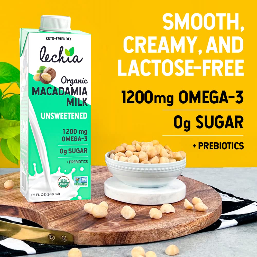 Lechia Organic Macadamia Milk Unsweetened, 1200mg Omega-3 + Prebiotics, Sugar Free, Whole30 Approved, Keto, Low Carb, Non Dairy, Lactose Free, Vegan, Plant Based, Gluten Free, Soy Free, Kosher, Non-GMO, Shelf-Stable, 32oz (6 Pack)