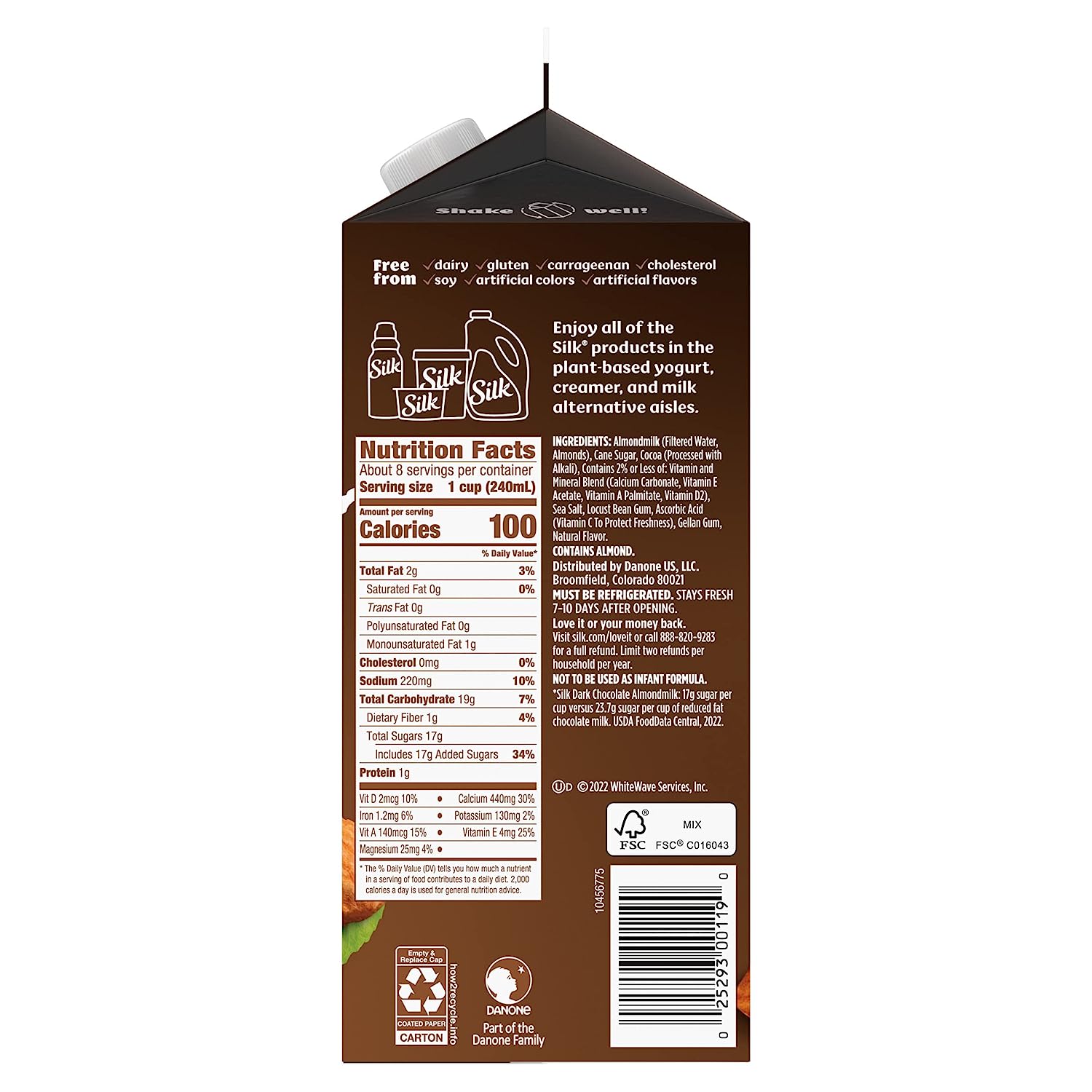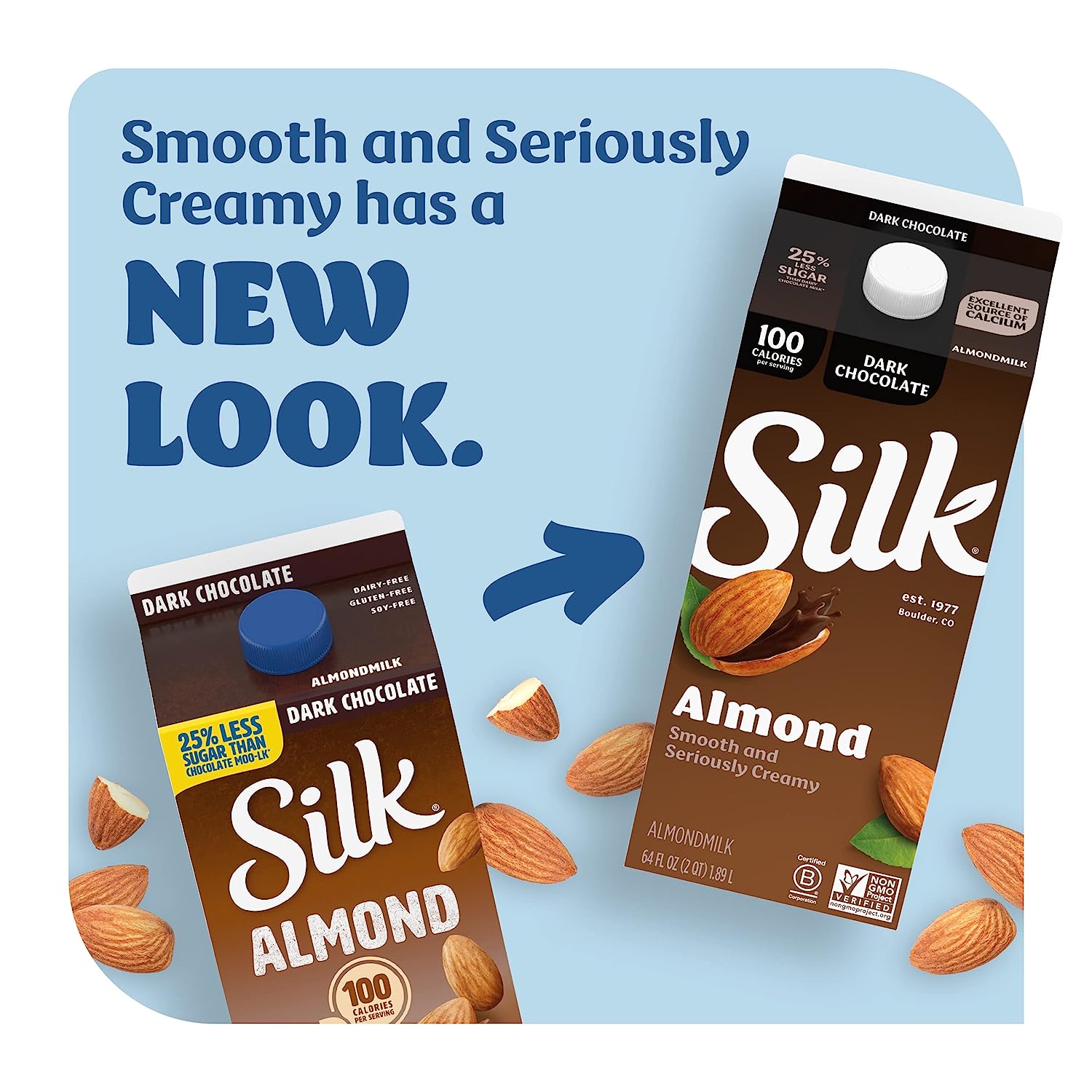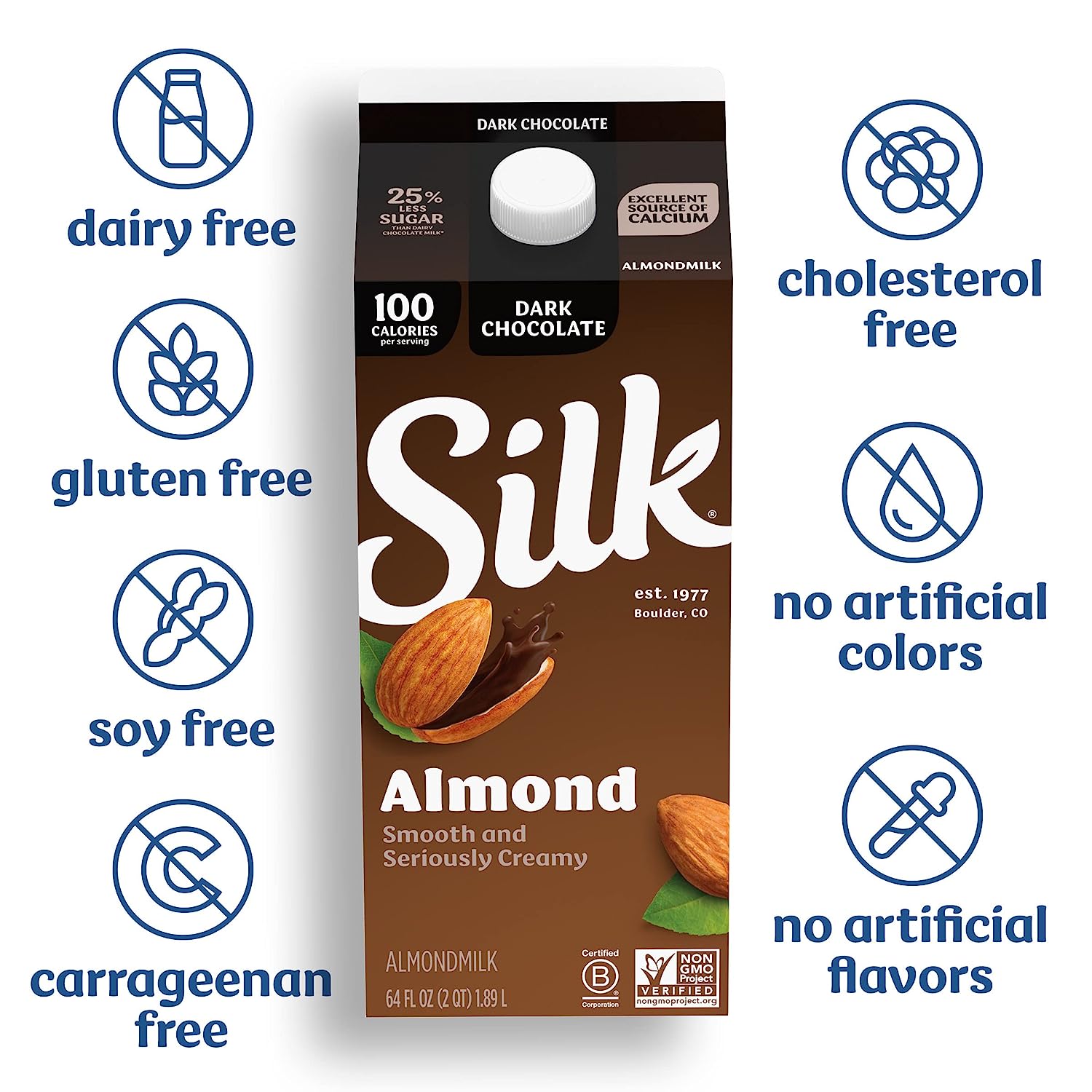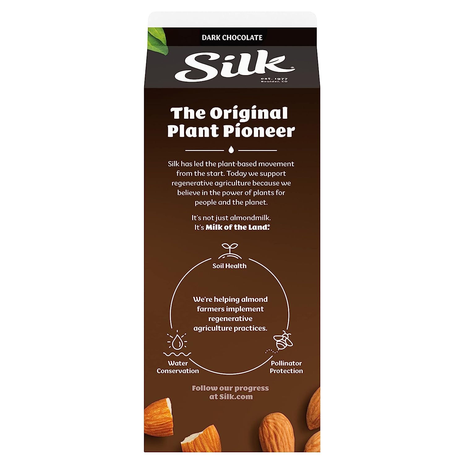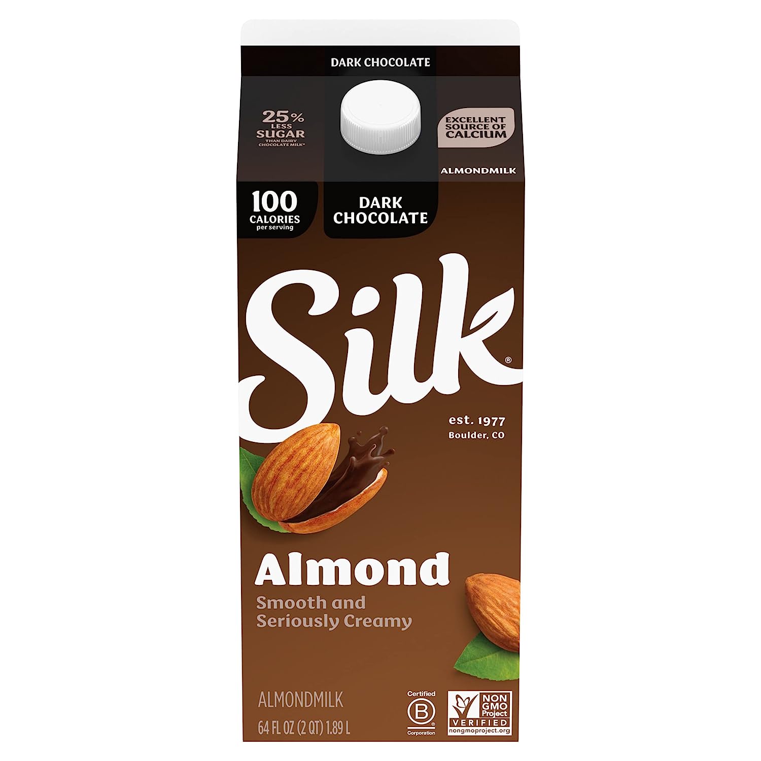 Treat yourself to this smooth and seriously creamy Silk Dark Chocolate Almondmilk. Enjoy all of the taste with 25% less sugar than dairy chocolate milk*. Made with three kinds of almonds grown by Mother Nature and picked at the peak of ripeness, this almondmilk has a perfect mix of quality and flavor. Plus, its smooth flavor makes it an extraordinary tasting, plant based milk that you can use throughout your day. It tastes great in a glass and smoothies. Every serving of this non dairy milk is an excellent source of calcium and has Vitamin D to help support strong bones. Silk Almondmilk is totally free of dairy, soy, lactose, gluten, casein, egg, carrageenan, and MSG. Trust Silk — the Original Plant Pioneer. It’s not just almondmilk, it’s Milk of the Land**. Read more about our story on our packaging. Enjoy all of the Silk products, including gluten free vegan milk, non dairy creamer and dairy free yogurt varieties. *See Nutrition Facts for sugar and calorie content. **From plants, not cows. Not nutritionally equivalent to dairy milk.