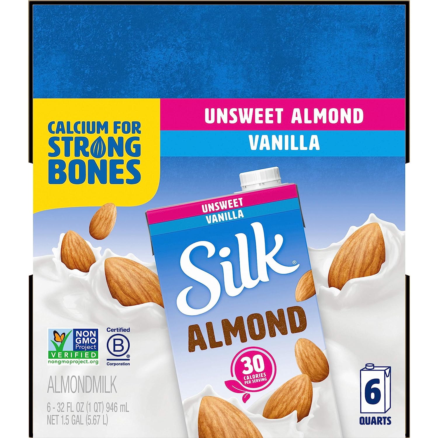 Bring the creamy goodness of almondmilk to your pantry with Silk Shelf-Stable Unsweetened Vanilla Almondmilk. Featuring a delicate vanilla taste and just 30 calories per serving, this unsweetened almondmilk is delicious whether it’s poured over cereal, added to your favorite recipes, or enjoyed straight out of the glass. It makes a perfect non-dairy alternative to milk, and is totally free of dairy, soy, lactose, gluten, casein, egg, and MSG. Silk Almondmilk provides vitamin E and contains 50% more calcium than dairy milk.* And since it comes in special, shelf-stable packaging, this unsweetened vanilla nutmilk will keep fresh at room temperature, unopened, until the date code: no refrigeration necessary! *Silk Unsweetened Vanilla Almondmilk: 450mg of calcium per cup; reduced fat dairy milk: 293mg of calcium per cup. USDA National Nutrient Database for Standard Reference. Data consistent with typical reduced fat dairy milk.
