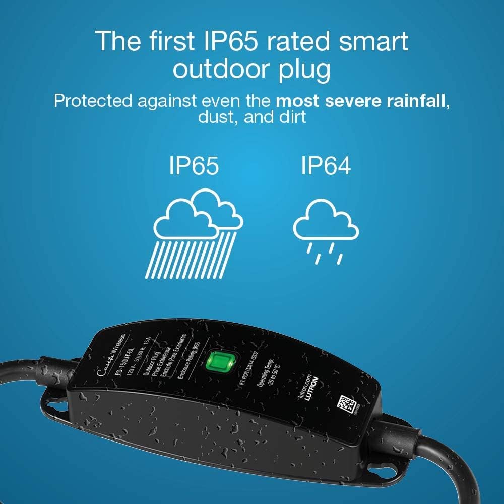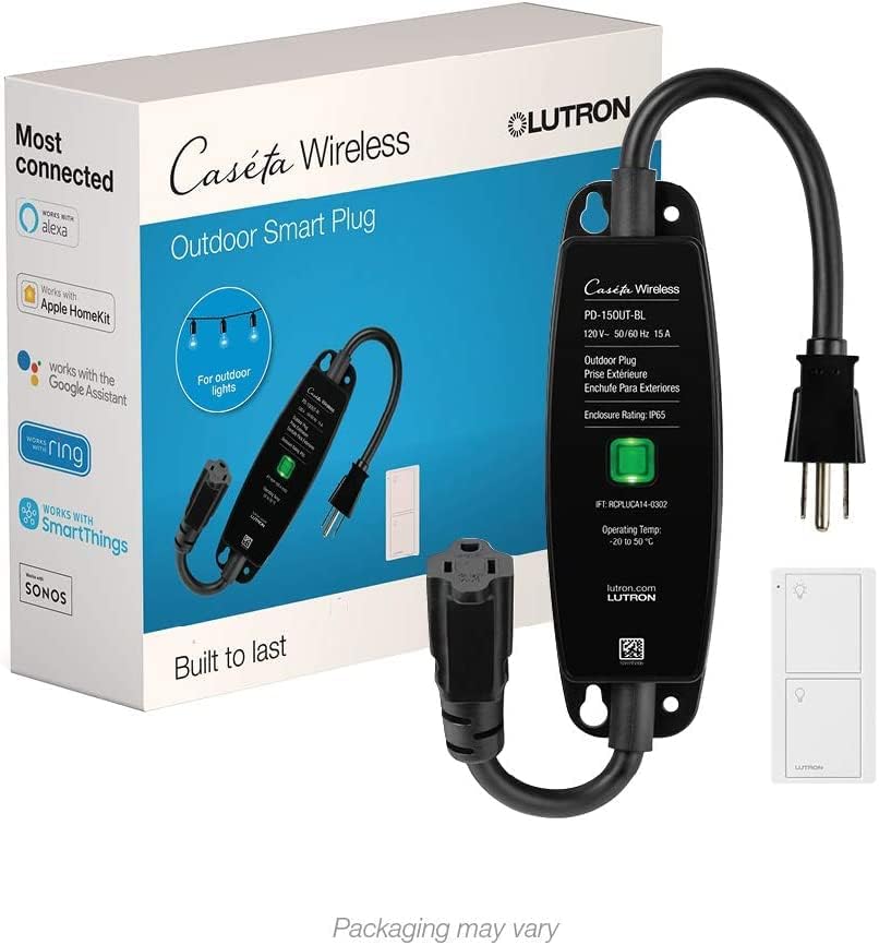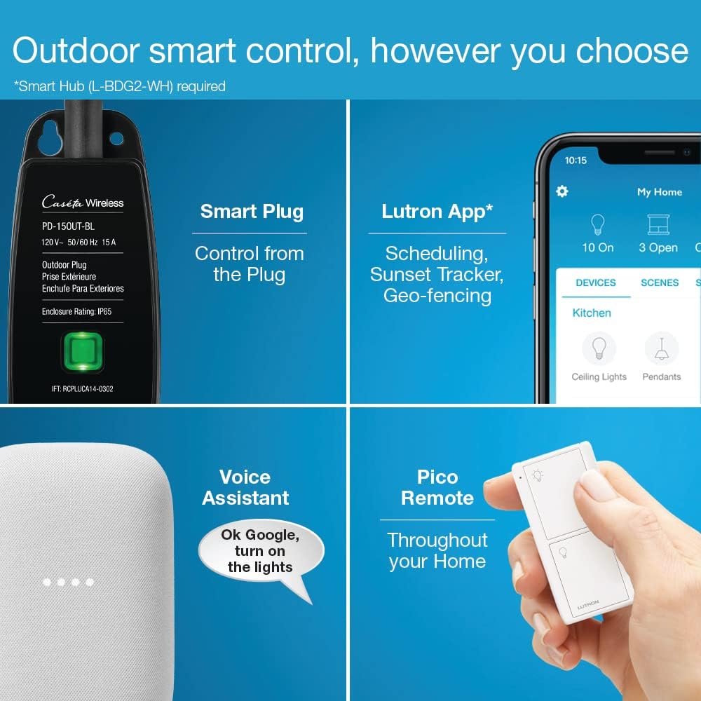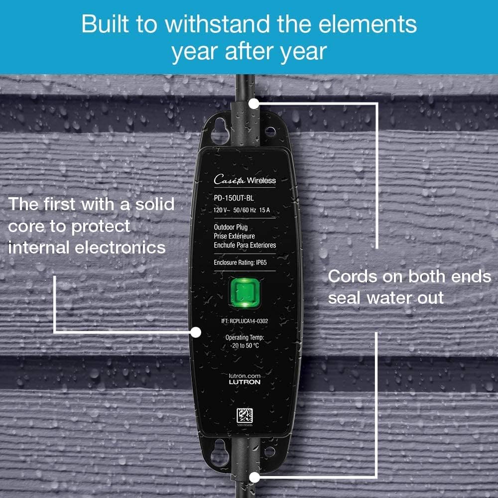 Introducing the Caseta Weatherproof+ Outdoor Smart Plug. The Caseta Outdoor Smart Plug is IP65-rated, which means it is protected against dust, dirt, and severe rainfall. It is built to last, rated to withstand temperatures from -4 to 122 F, and its black, polycarbonate body delivers long-term durability, UV resistance, and full protection of its internal electronics. Smart home - meet your smart yard. With the Lutron Caseta Smart Hub (L-BDG2-WH, sold separately), you can toss your traditional timer - effortlessly schedule and control your outdoor lights year-round, without any need for manual adjustments. The plug will not lose its place as the sun rises and sets, as the seasons change, and as you gain or lose an hour with Daylight Savings. The plug is perfect for landscape lighting, patio string lighting/holiday lights (1,000s of ft of LED and 100s of ft of incandescent), as well as inflatables, and small pumps and motors (up to ВЅ HP). You can also add a Lutron Caseta Smart Hub (sold separately) to unlock smart control of your Outdoor Smart Plug. The Plug works with Alexa, the Google Assistant, Apple Home, Ring, and more. Control the plug in a variety of ways, via your preferred voice assistant, the Lutron app, or a Pico remote (sold separately).