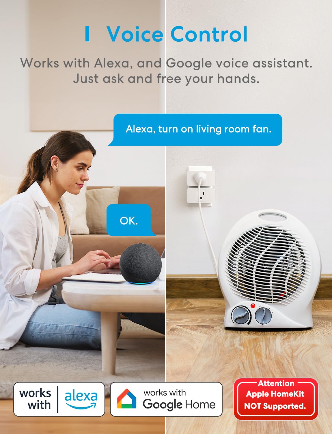 • App Remote Control & Scene: The smart plug turn electronics on/off from anywhere anytime with Meross app. You can check to see the status of connected devices from anywhere anytime. A scene allows you to group your smart devices as you wish and control them simply by one tap. Create your ideal scene, to turn on/off fan, lamp, humidifier, coffee maker or any lights. Rated: 15A, 120V, 1800W (New Packaging).
