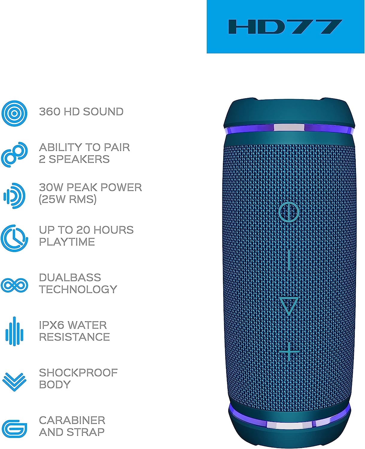 Built as an all-around water proof speaker for the outdoorsman, home kitchen connoisseur, and pool party extraordinaire, the HD77 is a suitable choice for nearly any occasion. With up to 20 hours of playtime before needing to be recharged.With waterproof speakers, shock/dustproof body, and impact resistant frame, each unit is more than capable of defying Mother Nature.