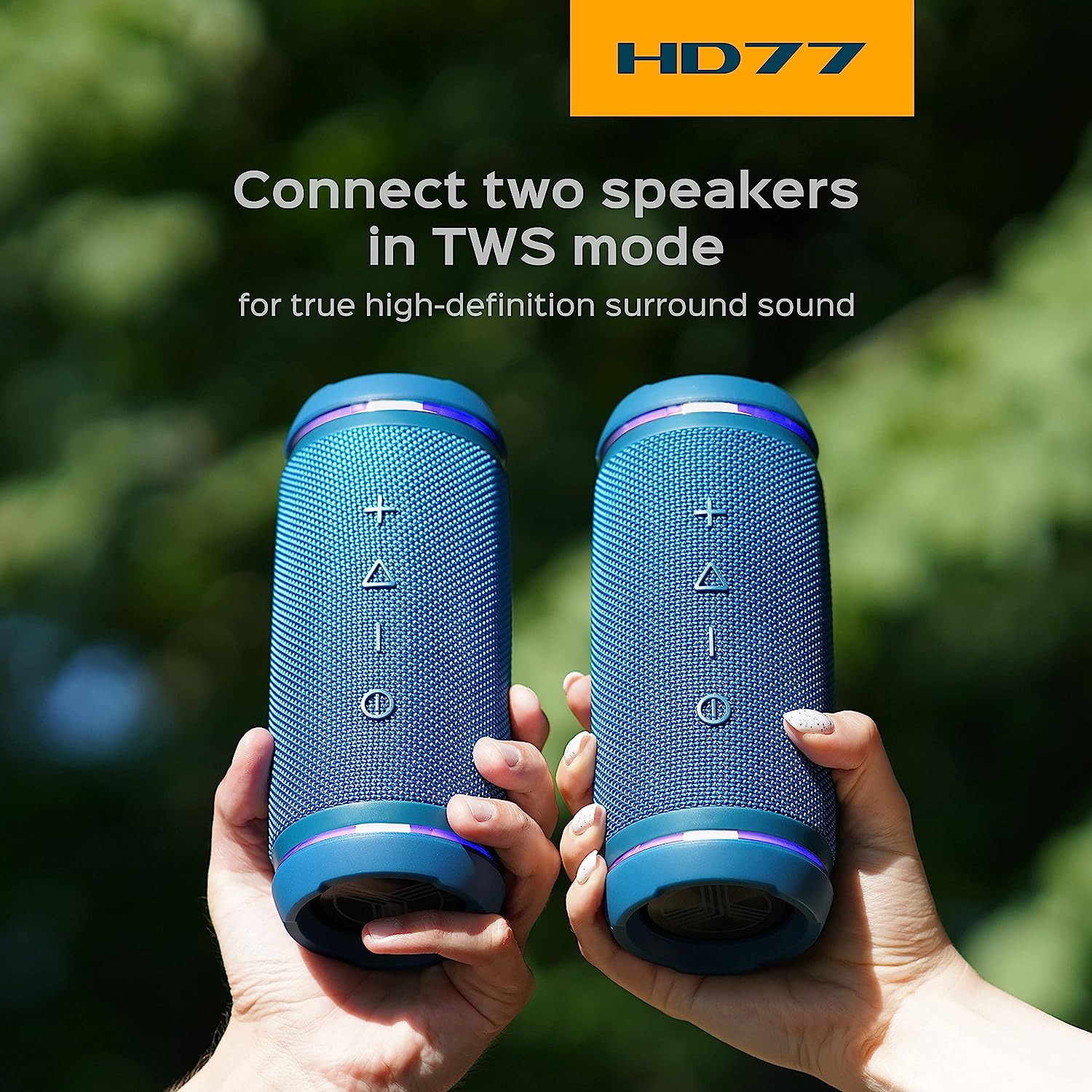 Experience crystal-clear and rich sounds in any environment with TREBLAB’s HD77 outdoor Bluetooth speakers.