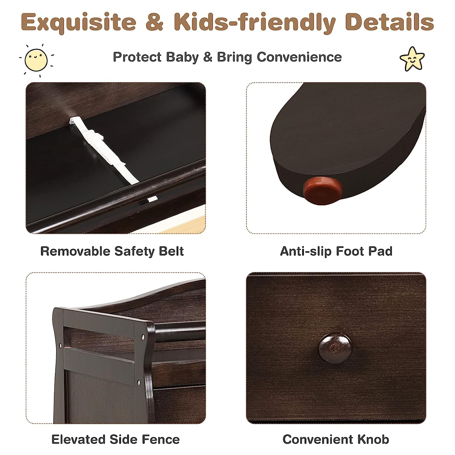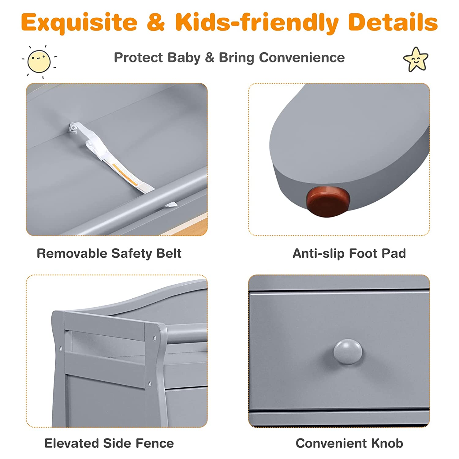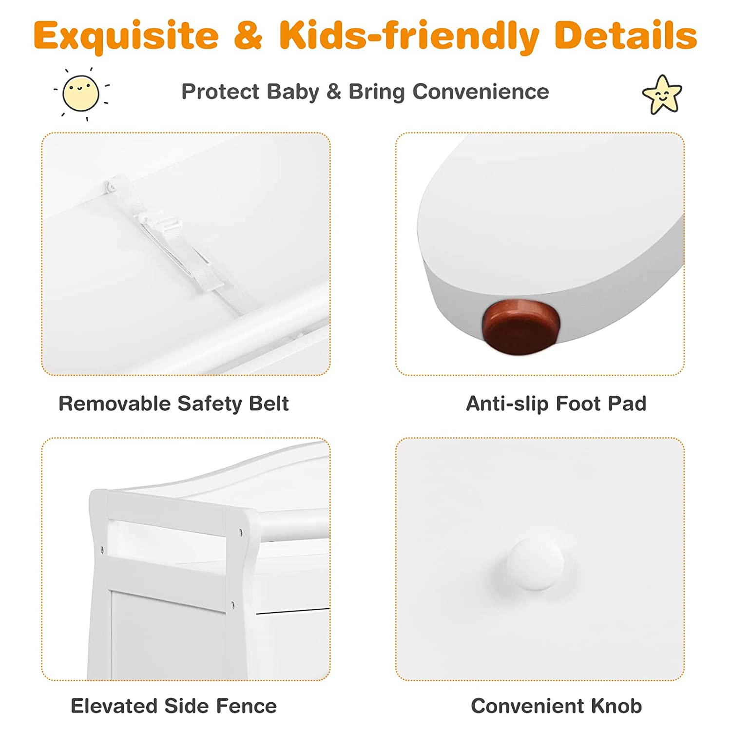 • Safe & Stable Construction: The changing table dresser is strongly supported by four sturdy legs and the changing top can hold up to 176 lbs. Each leg is equipped with anti-slip foot pad to avoid slipping and wobbling. Plus, safety belt and raised rails will help protect your baby from falling.