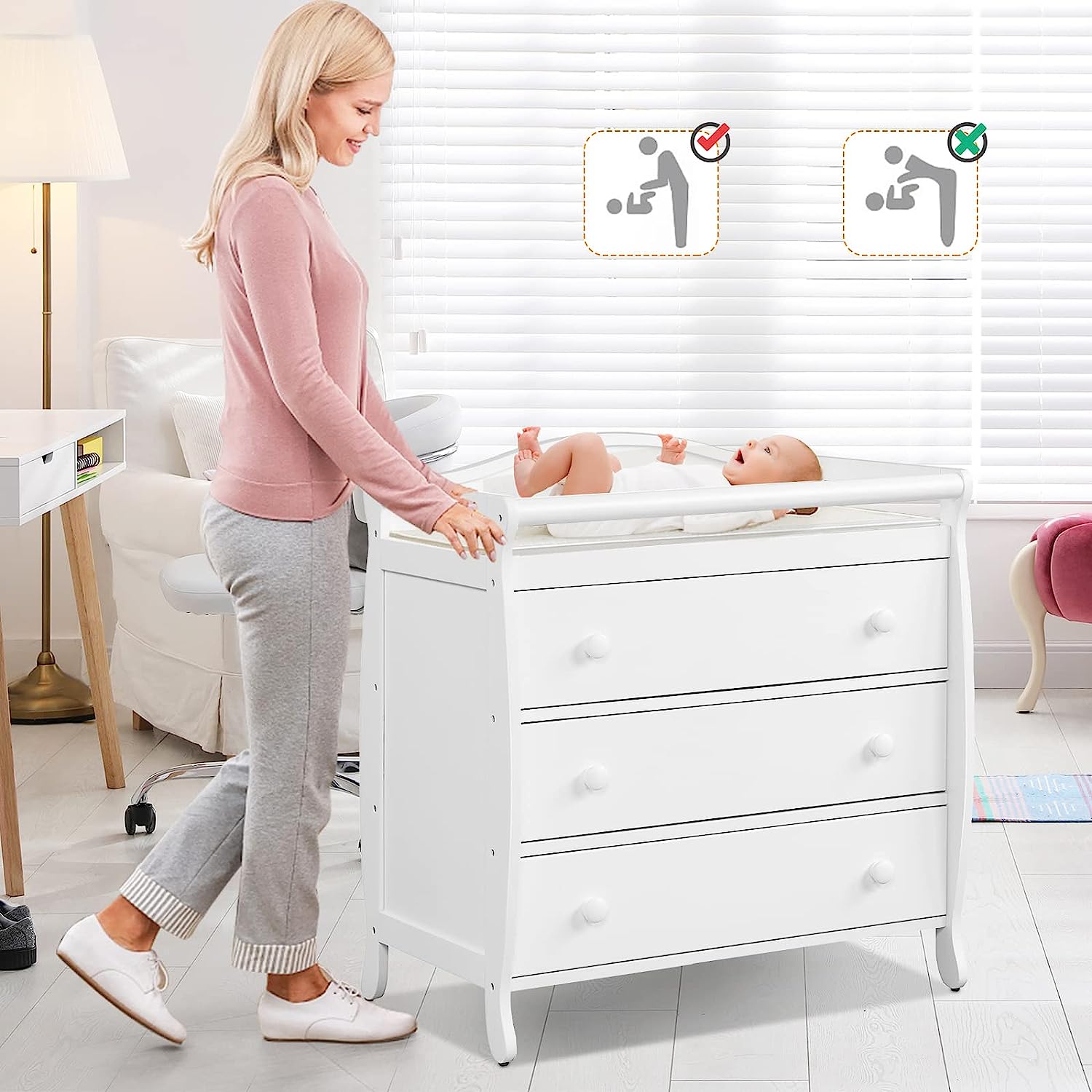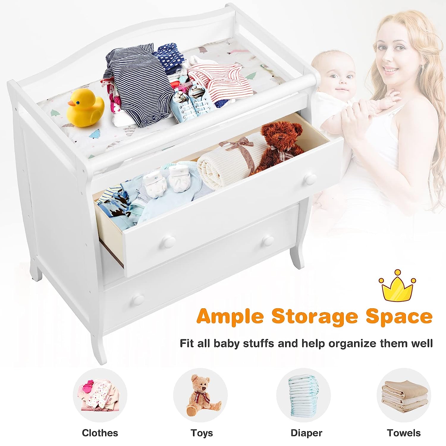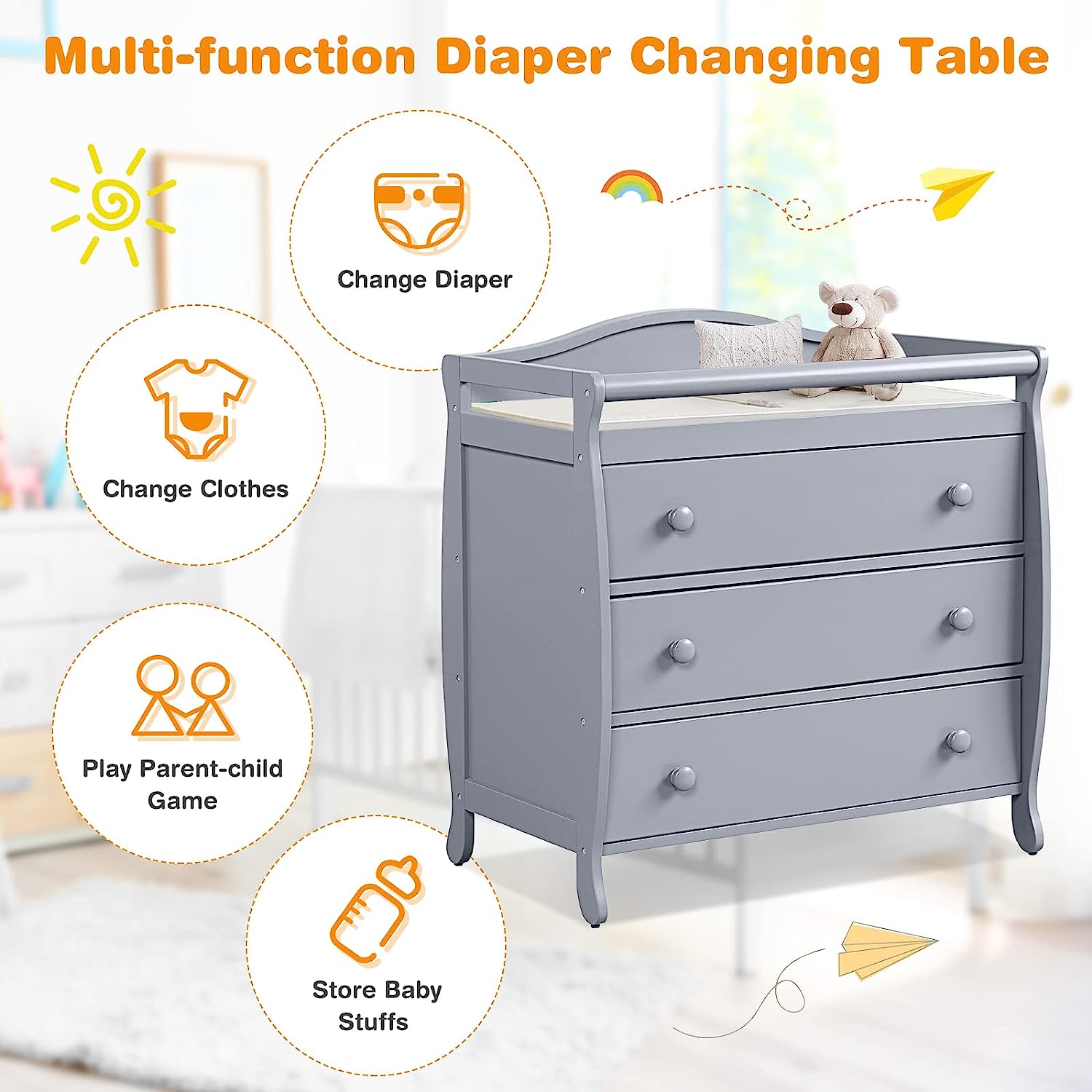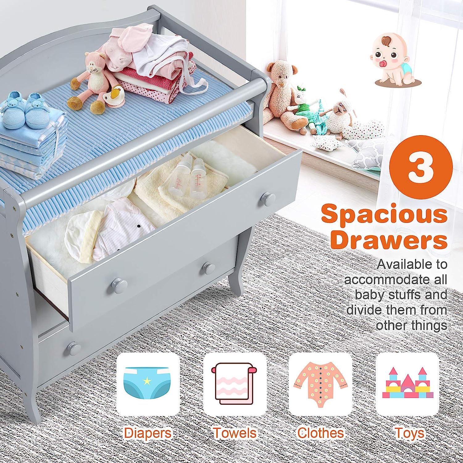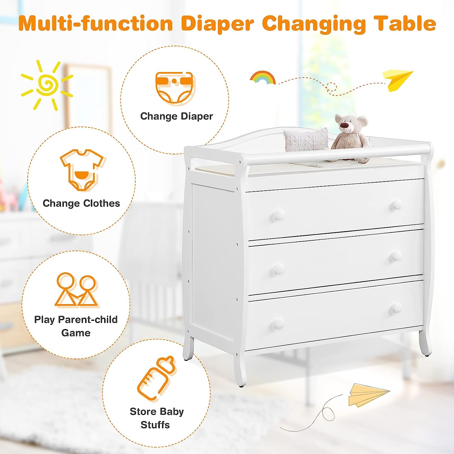 • Multi-function Changing Table: Parents will find it convenient to change clothes and diapers for their little ones on the changing top. Meanwhile, three large drawers provide you with sufficient space to store a variety of baby products and keep them clean, tidy and away from dust.