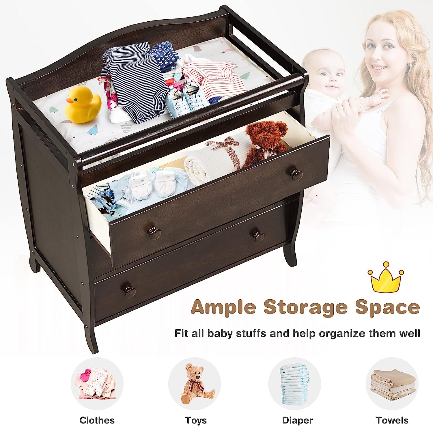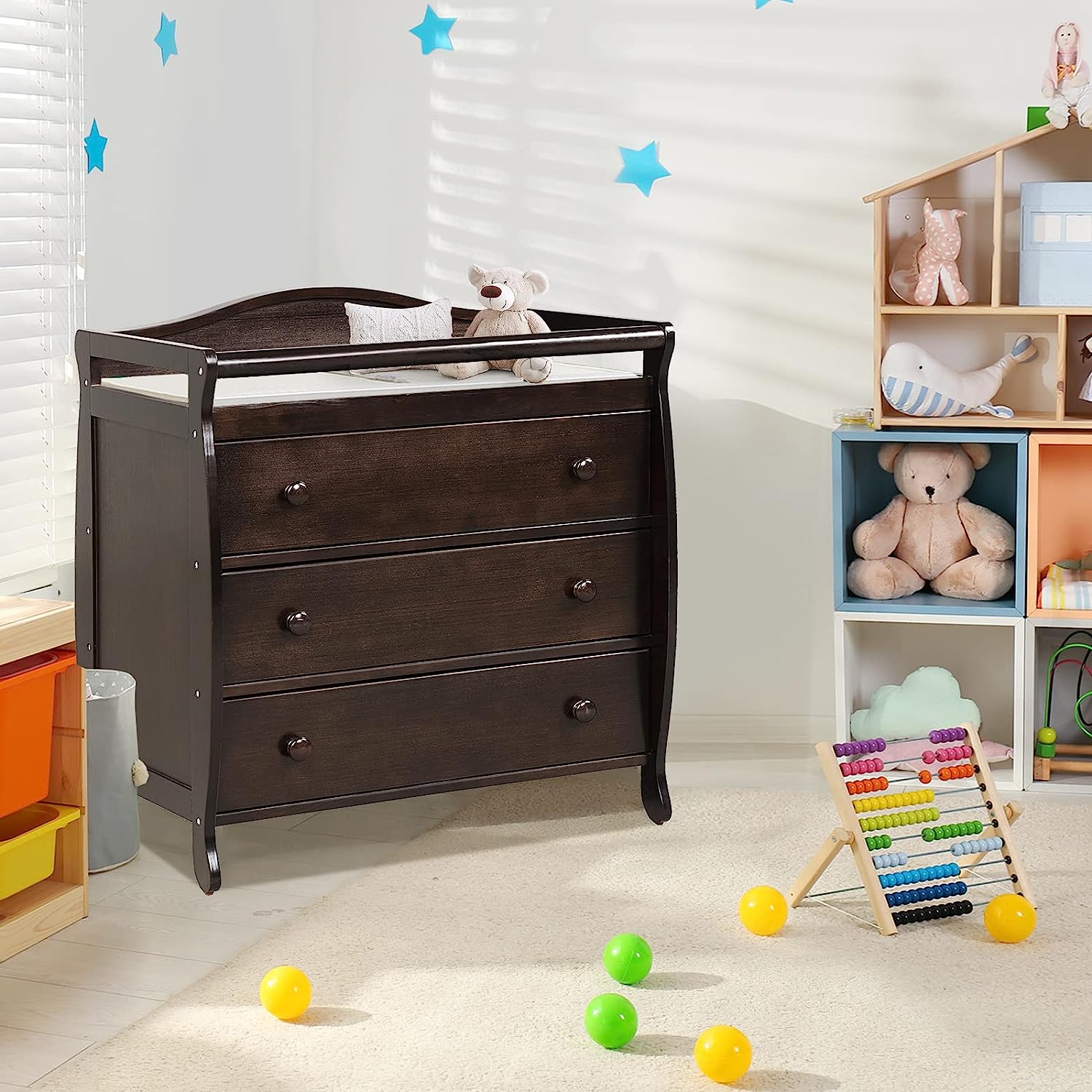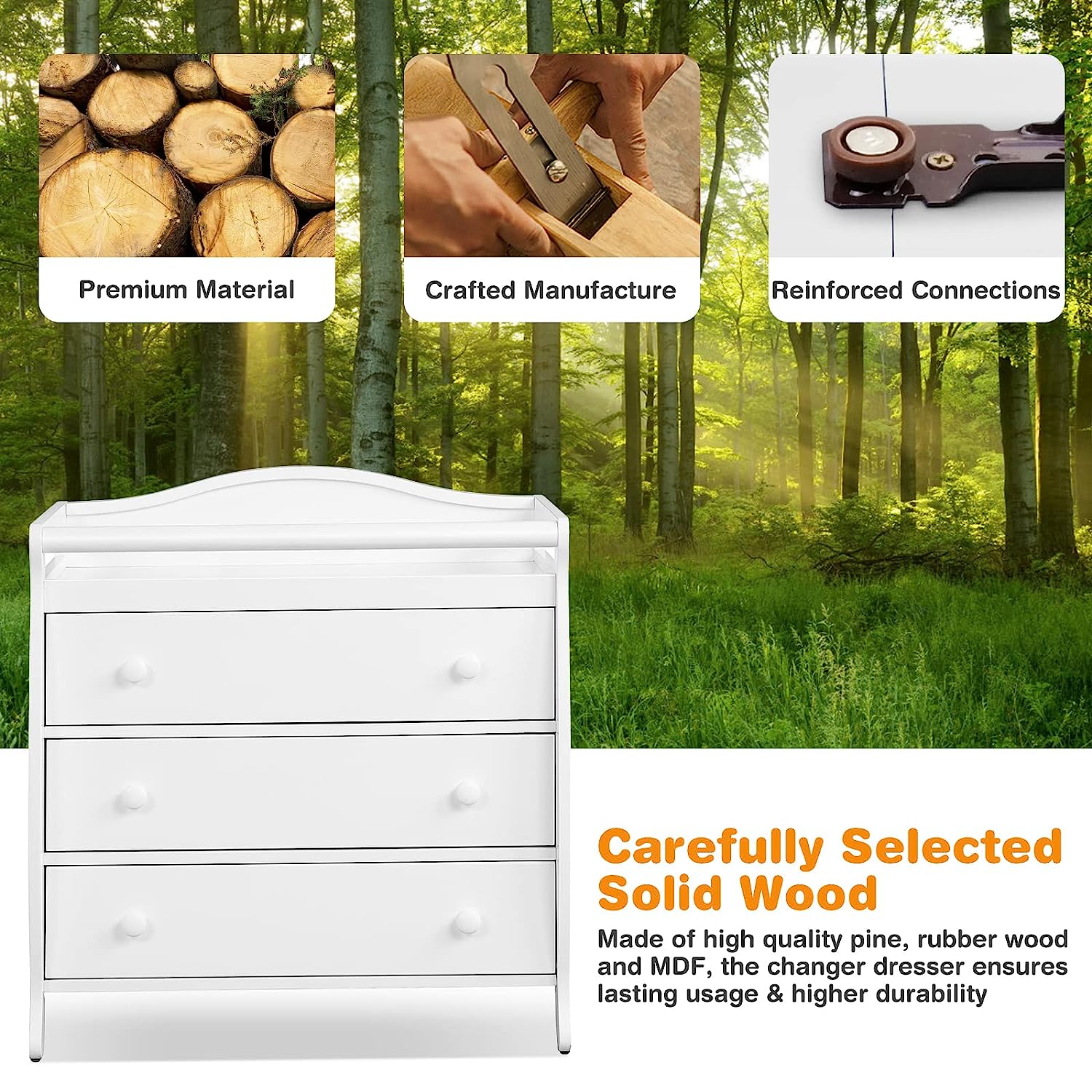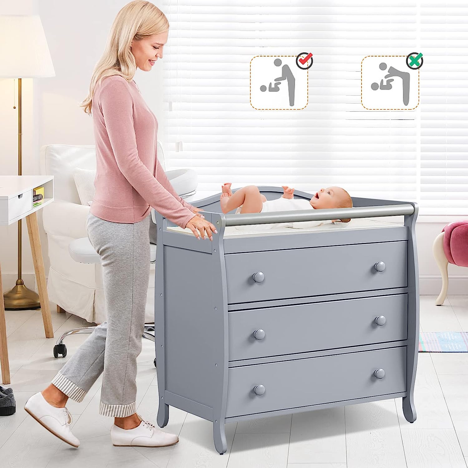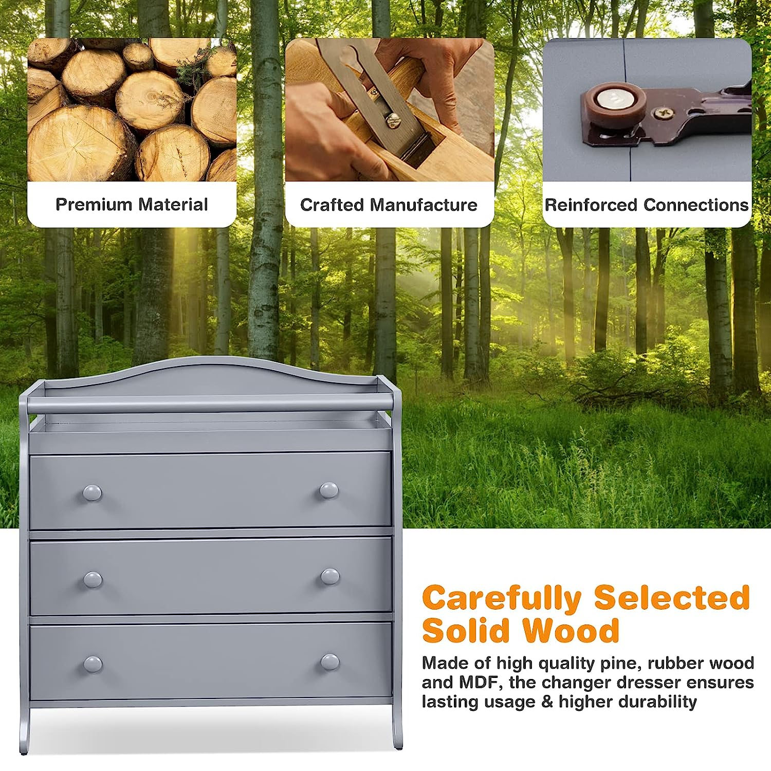 • Multi-function Changing Table: Parents will find it convenient to change clothes and diapers for their little ones on the changing top. Meanwhile, three large drawers provide you with sufficient space to store a variety of baby products and keep them clean, tidy and away from dust.