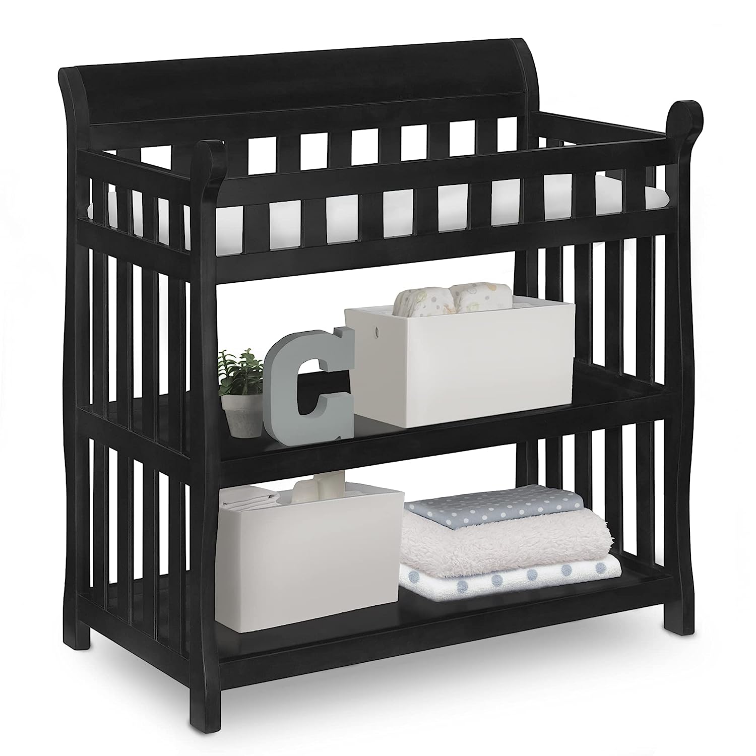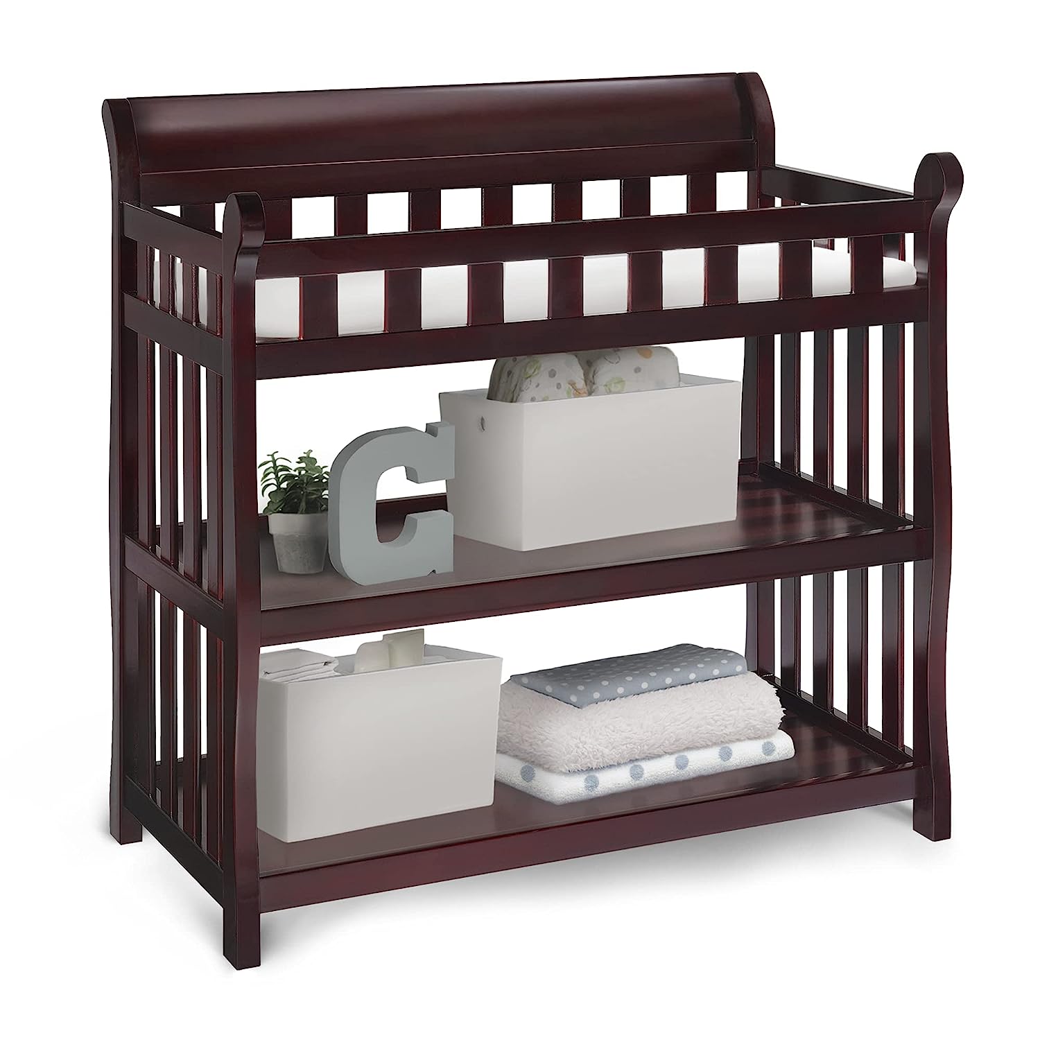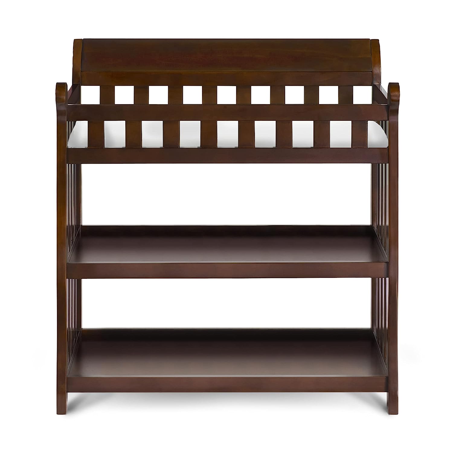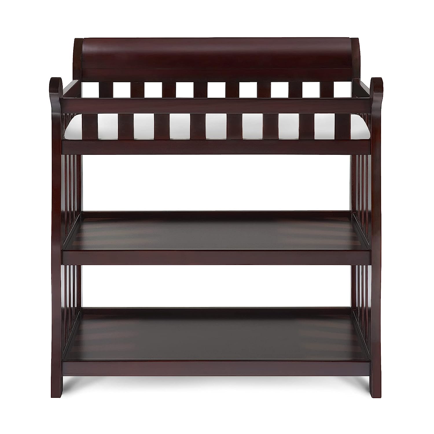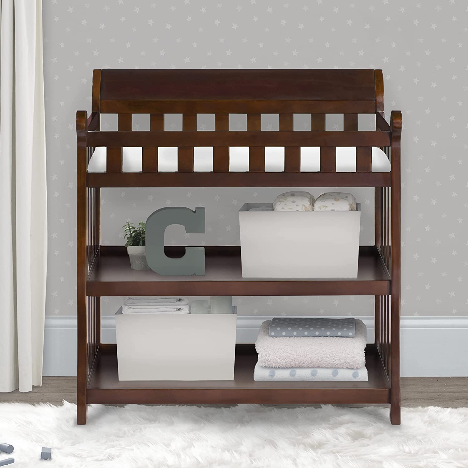 The Eclipse Changing Table combines function with style and craftsmanship. Its chic design, coupled with a gorgeous finish, makes it a must-have for your little one’s nursery. It features ample changing space with side rails to keep your baby safe. Comes with a waterproof mattress and safety strap. Two shelves provide easy to reach storage space for all things baby. Some assembly required. JPMA certified.