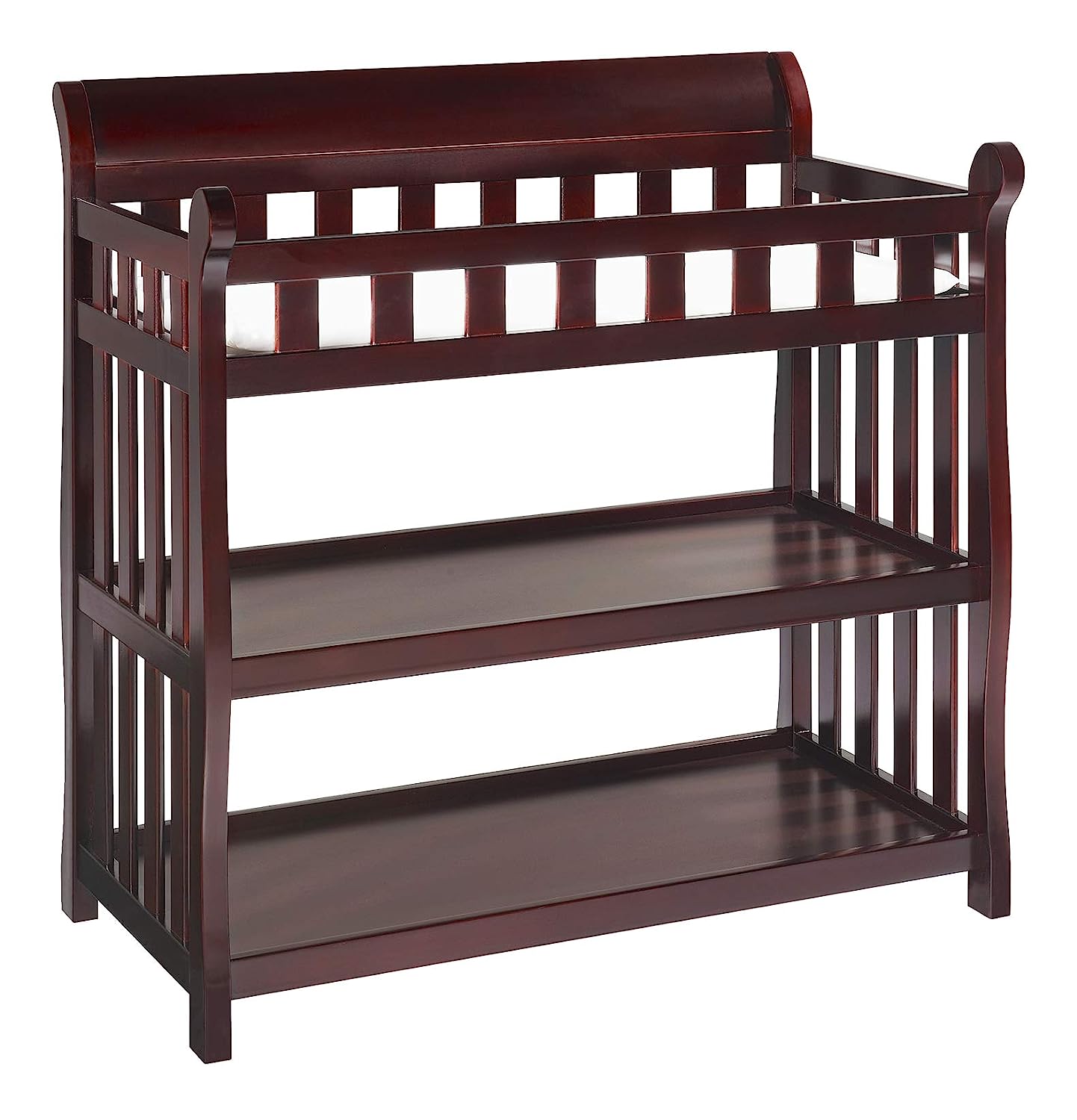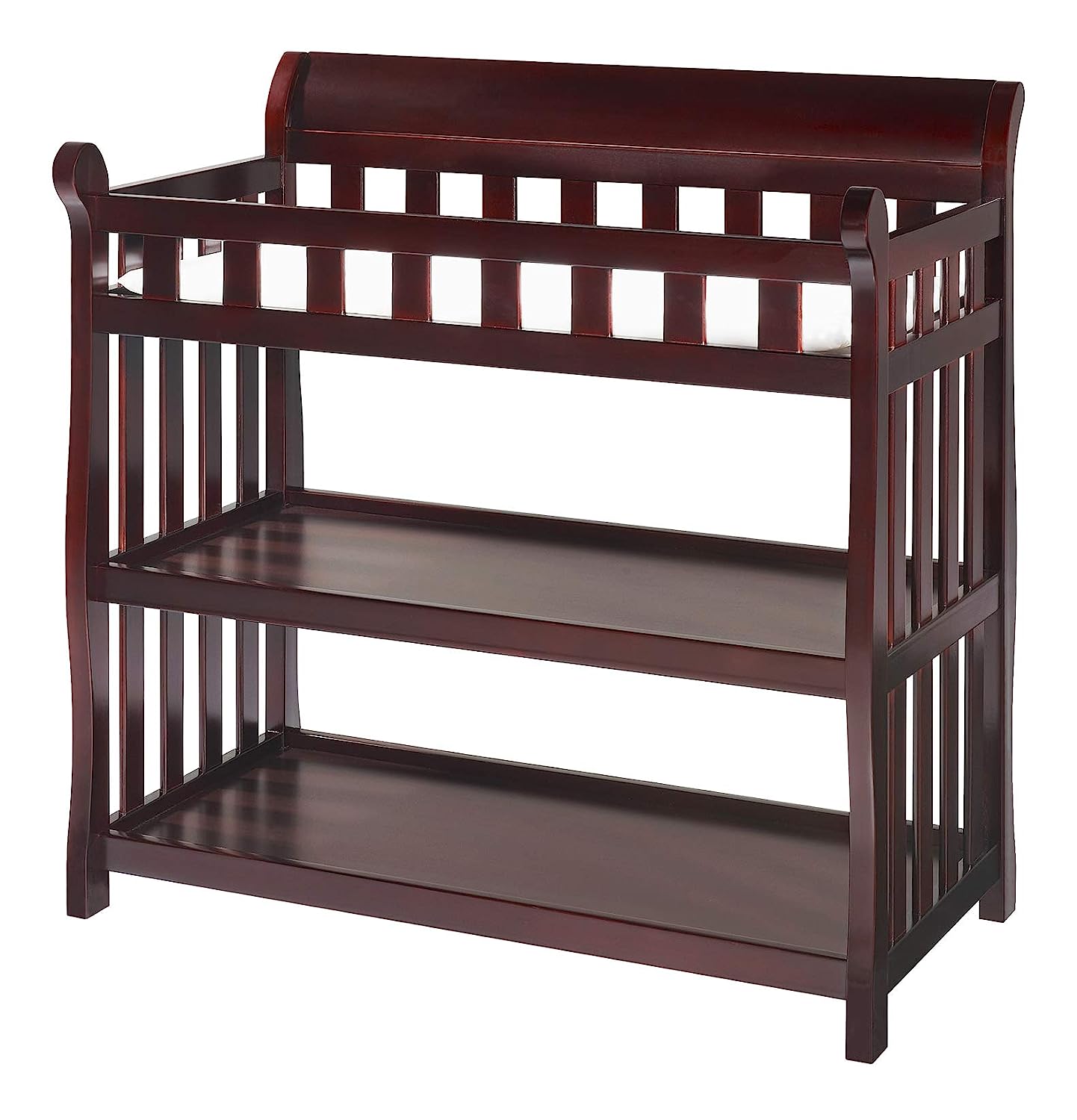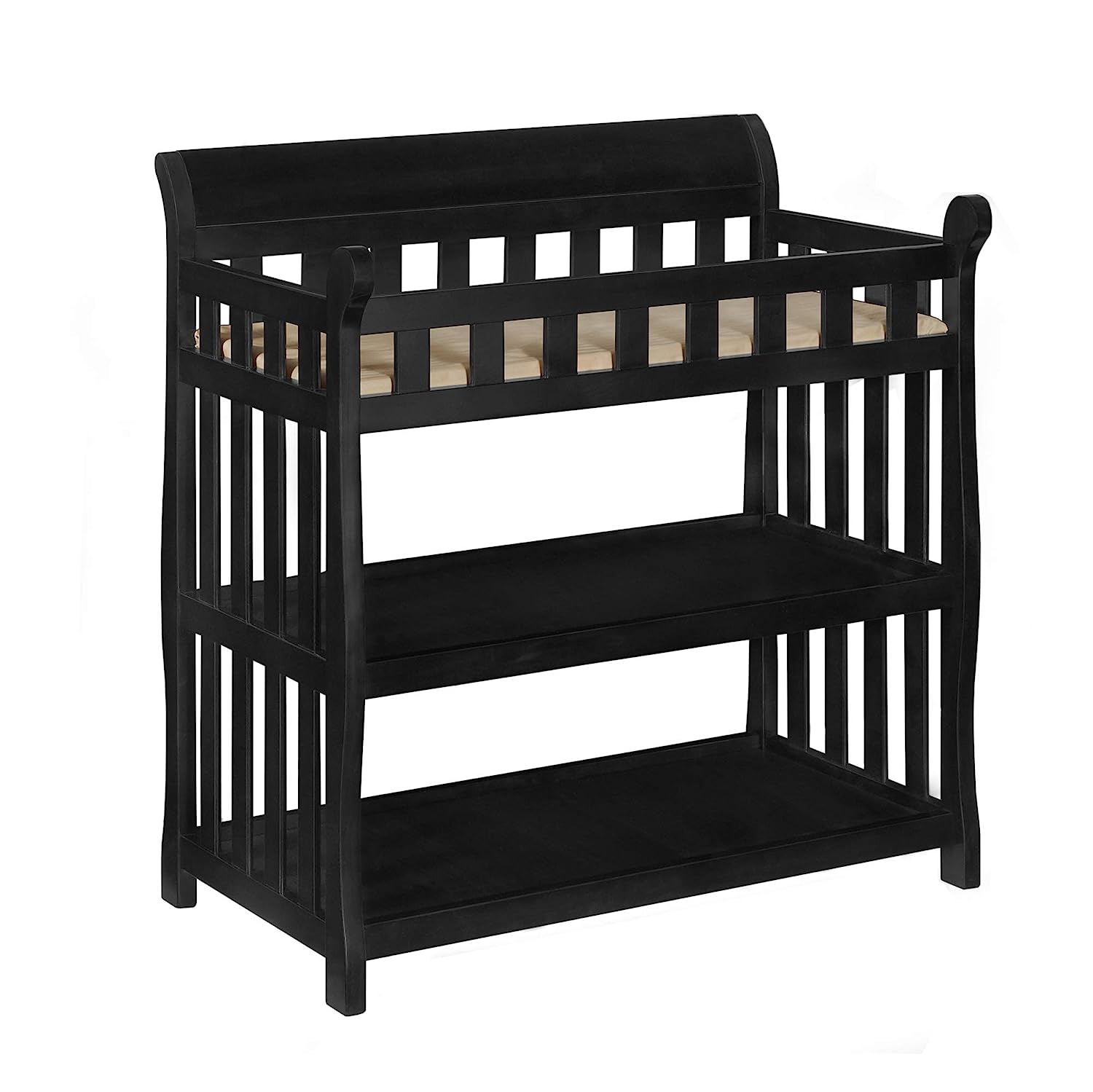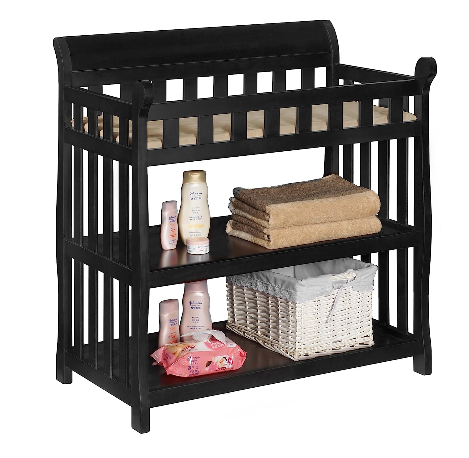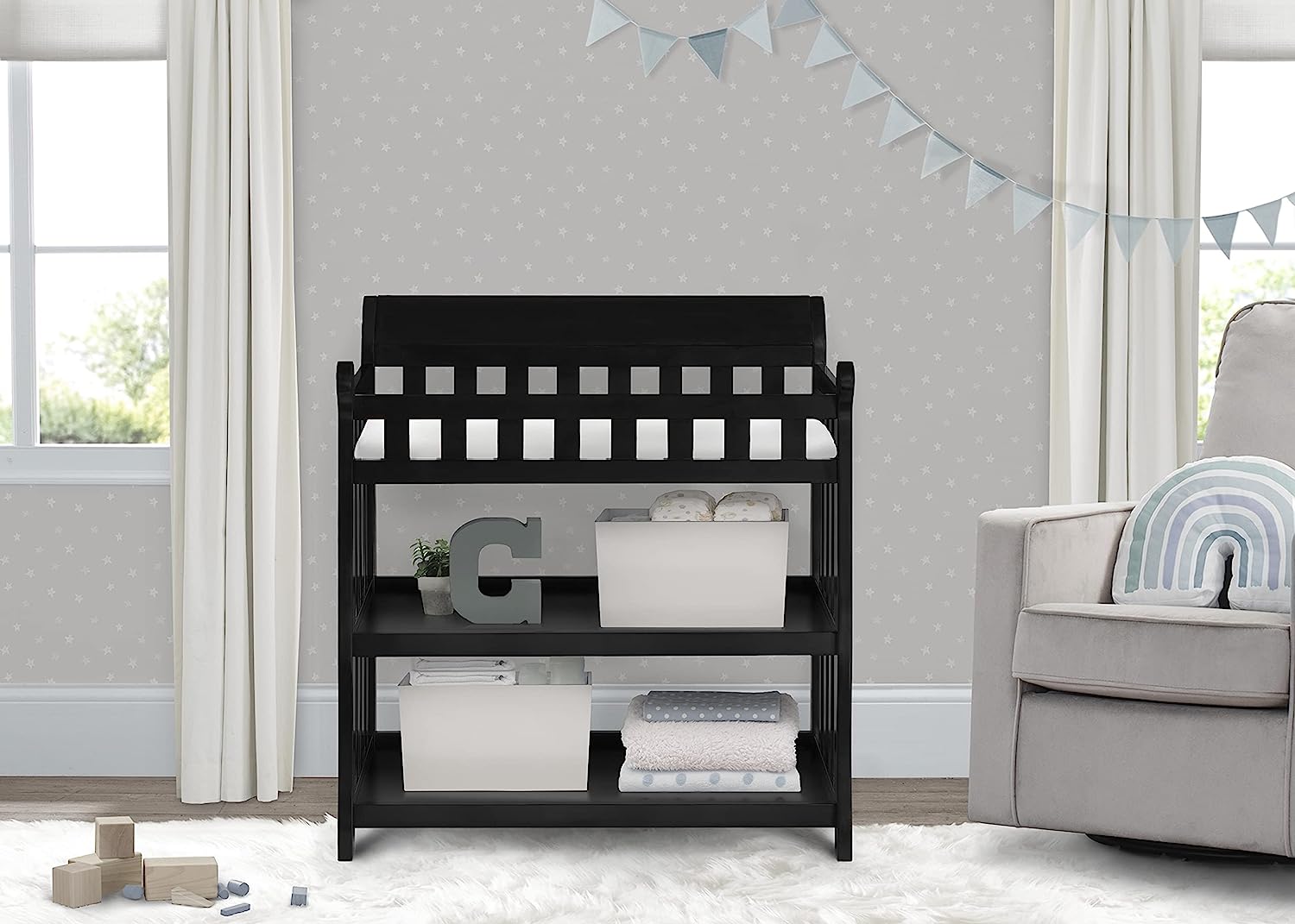 The Eclipse Changing Table combines function with style and craftsmanship. Its chic design, coupled with a gorgeous finish, makes it a must-have for your little one’s nursery. It features ample changing space with side rails to keep your baby safe. Comes with a waterproof mattress and safety strap. Two shelves provide easy to reach storage space for all things baby. Some assembly required. JPMA certified.