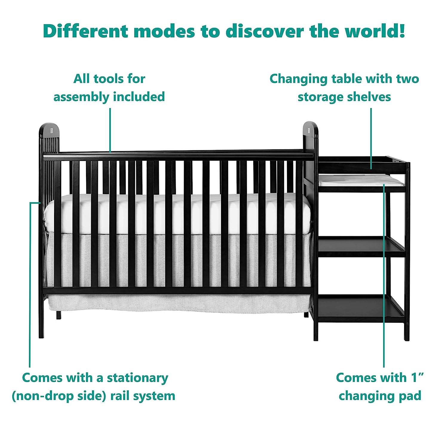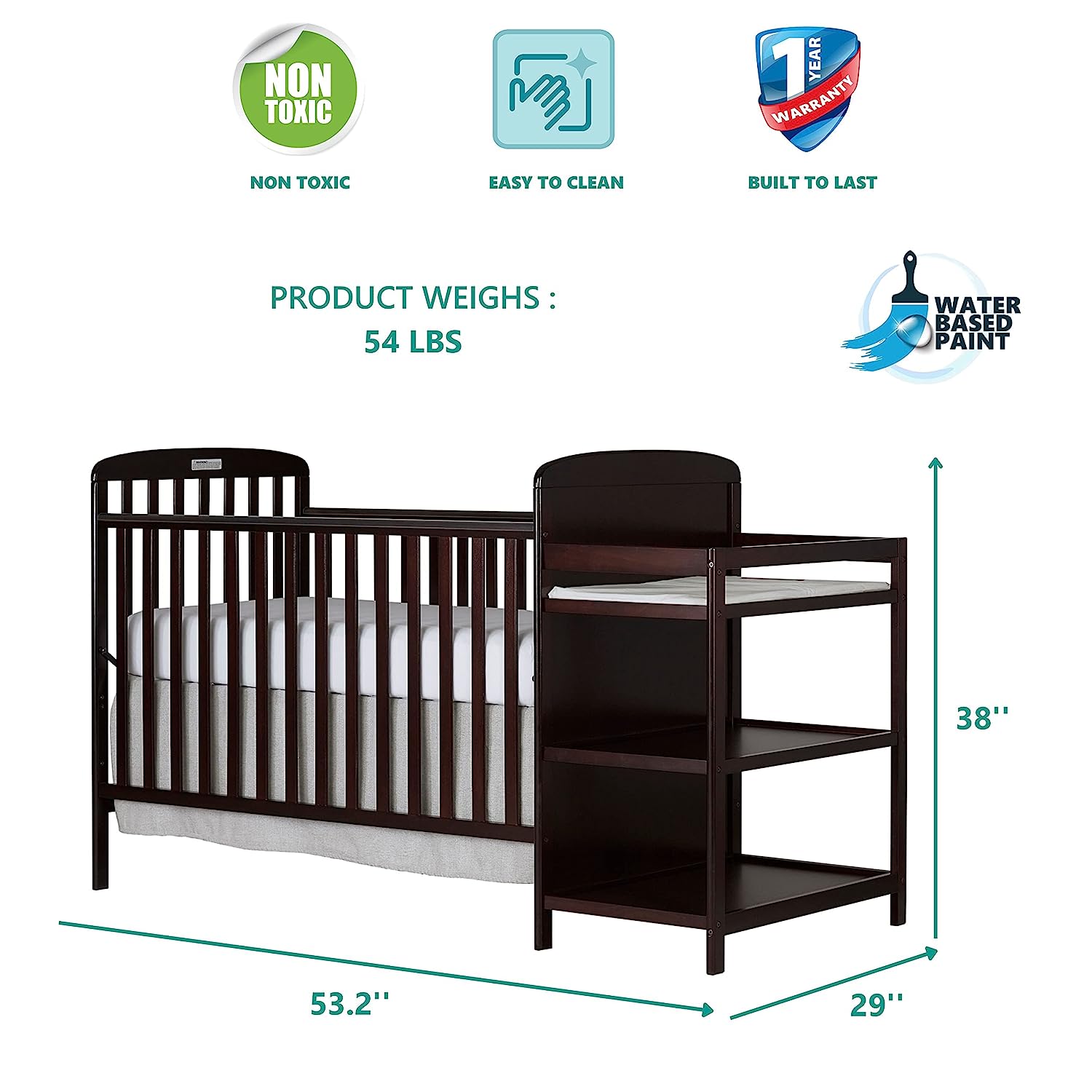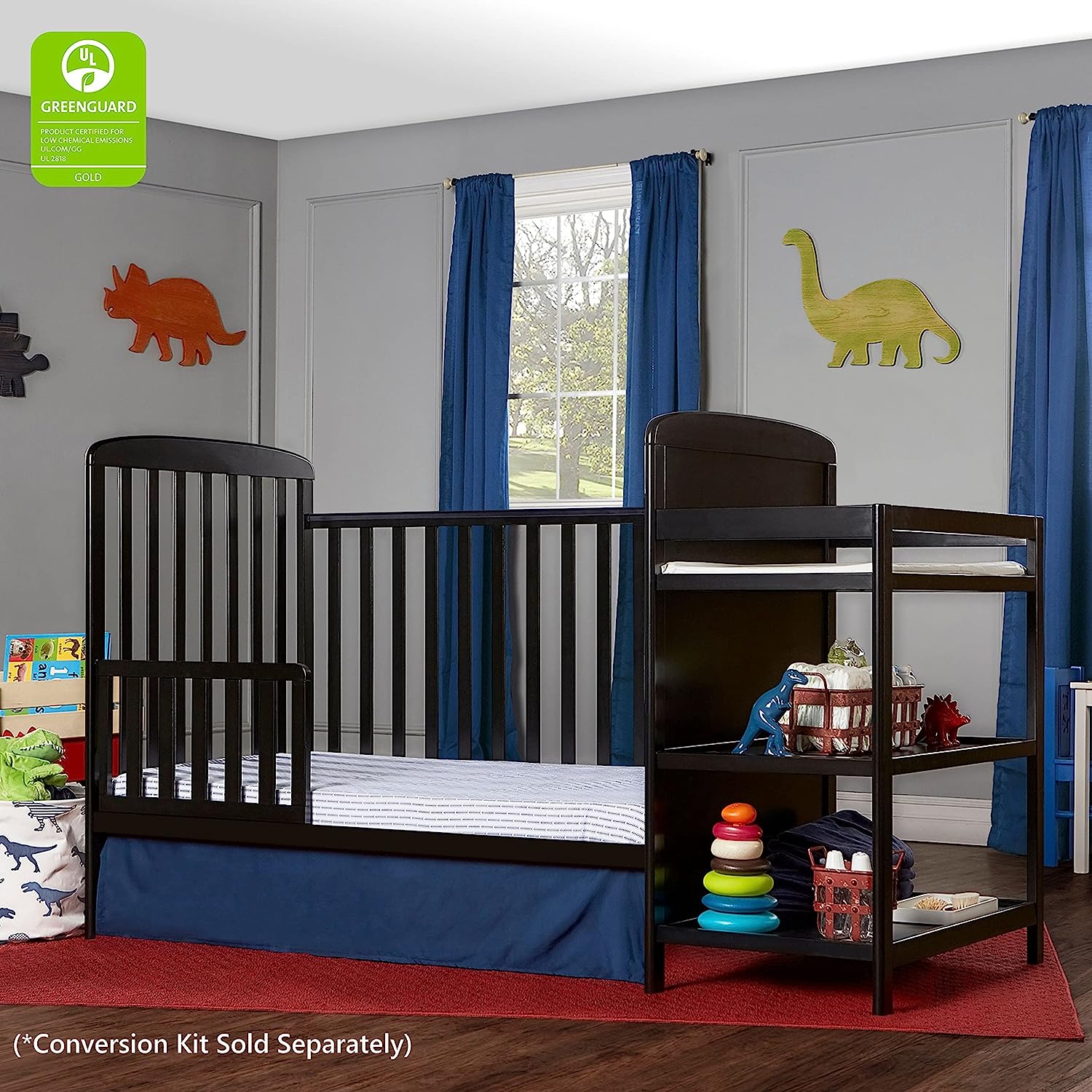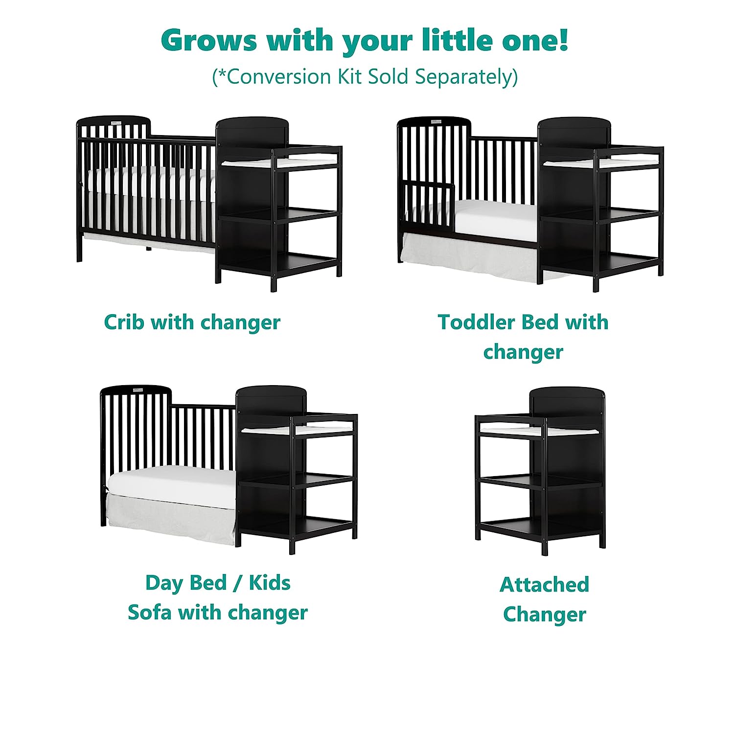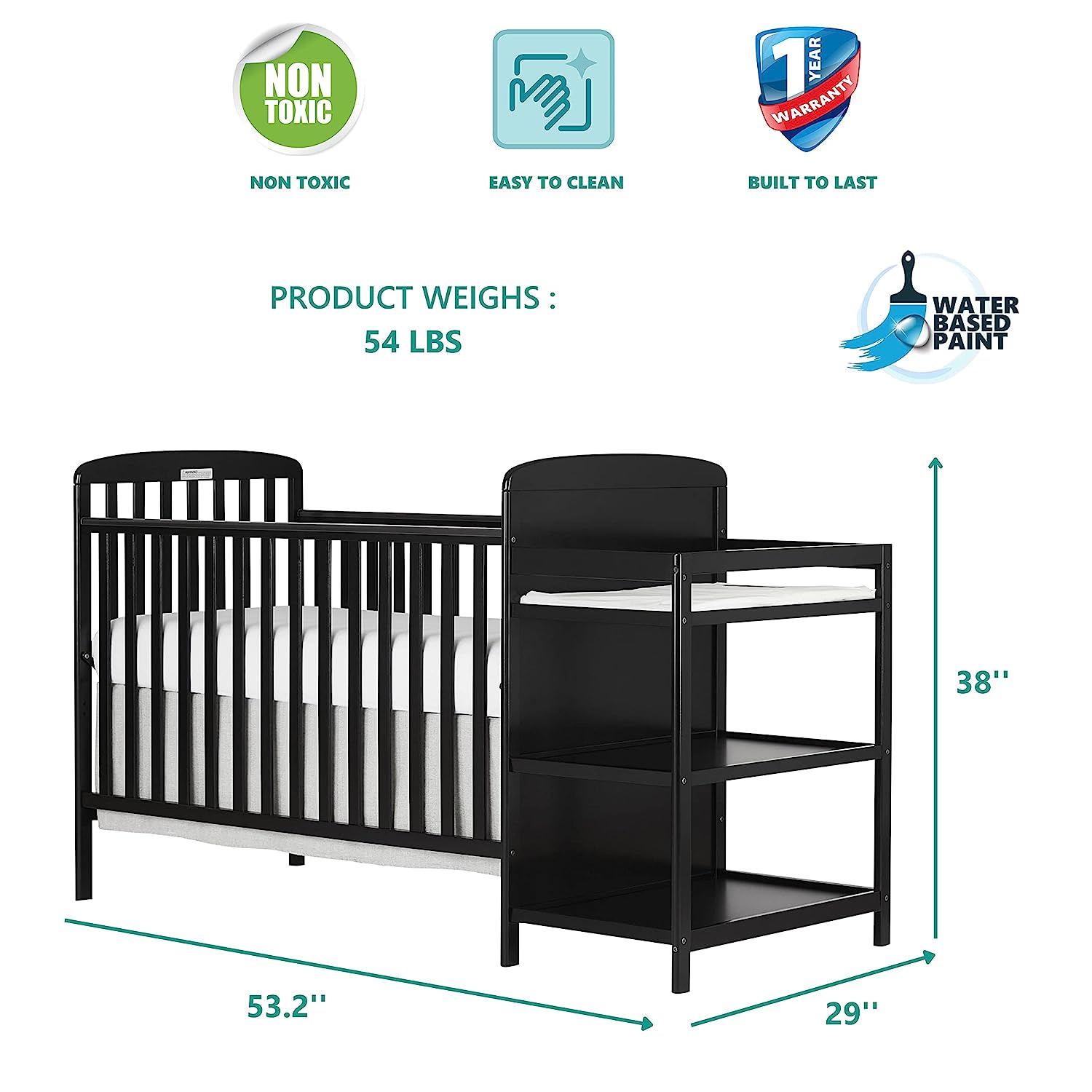 The Anna 4-In-1 Full Size Crib & Changing Table Combo is a stylish and functional investment that keeps pace with your child’s changing needs. Convert it from a crib to a toddler bed, and then a daybed (Toddler Guardrail/Stabilizer/Full Size Rail sold separately) as your child grows.The changing table with two storage shelves adds to the utility. The changing table is equipped with a custom fit 1” changing pad. There are two open storage shelves beneath the table, allowing you to keep baby essentials handy.The Anna features a sleek and modern design with clean lines. You can choose from six elegant finishes- Black, Cherry, Espresso, Natural, White & Storm Grey and match it effortlessly with any nursery theme! All Dream On Me cribs are tested to ensure all applicable ASTM, JPMA & CPSC standards are met. This Anna comes with a stationary (non-drop side) rail system for added safety. All tools for assembly are included, conversion kit sold separately. Choose any Dream On Me non-toxic, Greenguard certified standard crib mattress for the perfect fit. Maximum weight limit is 50 lbs.