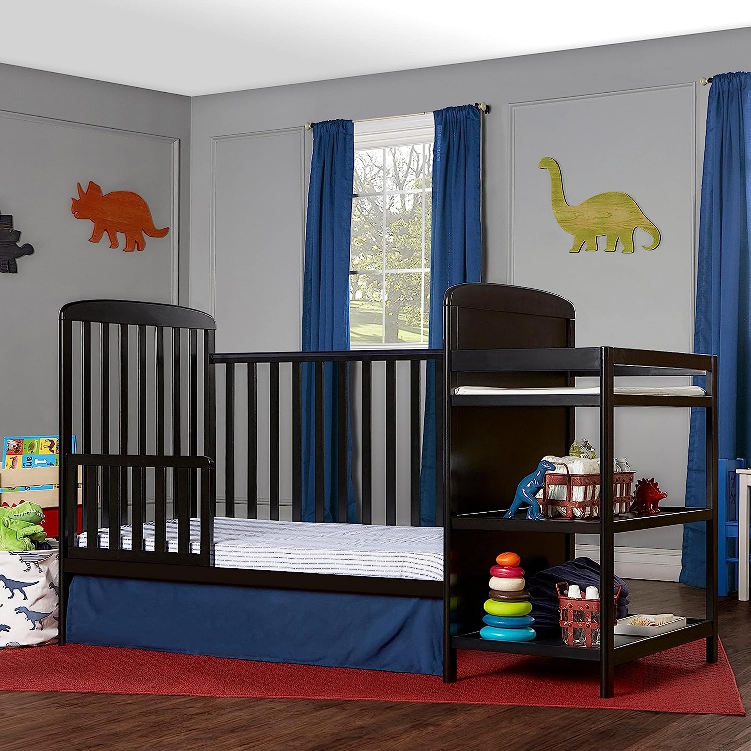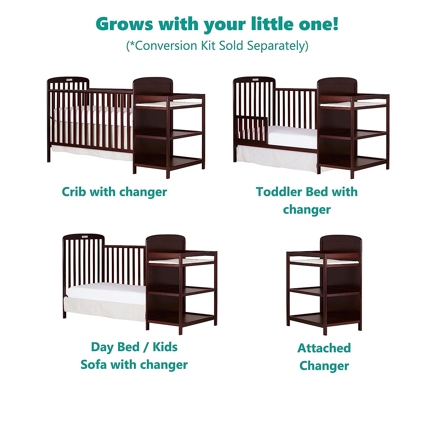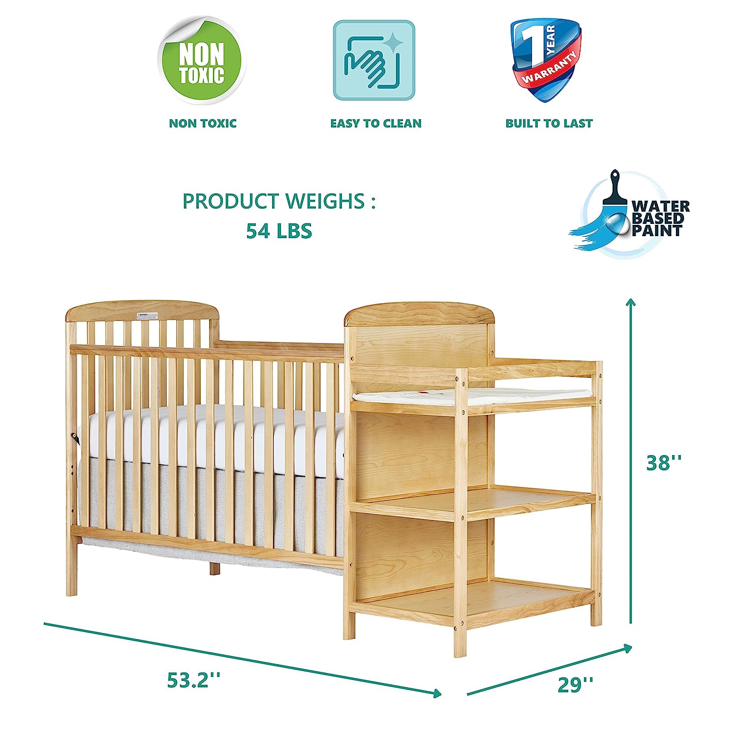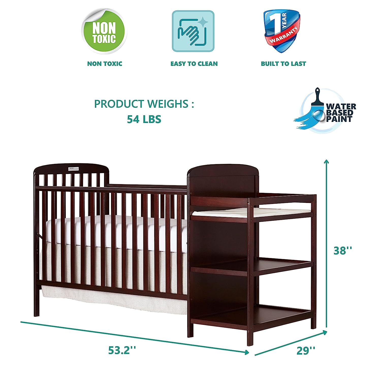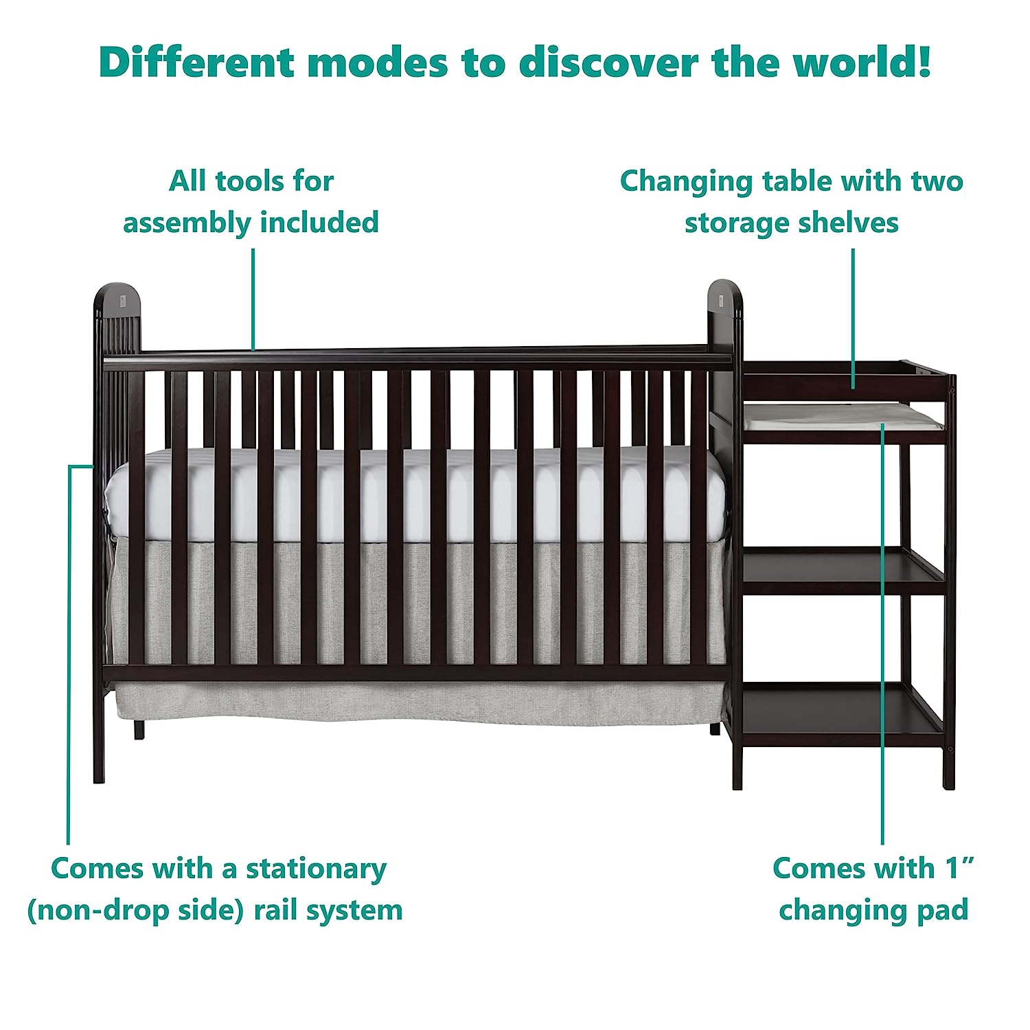 The Anna 4-In-1 Full Size Crib & Changing Table Combo is a stylish and functional investment that keeps pace with your child’s changing needs. Convert it from a crib to a toddler bed, and then a daybed (Toddler Guardrail/Stabilizer/Full Size Rail sold separately) as your child grows.The changing table with two storage shelves adds to the utility. The changing table is equipped with a custom fit 1” changing pad. There are two open storage shelves beneath the table, allowing you to keep baby essentials handy.The Anna features a sleek and modern design with clean lines. You can choose from six elegant finishes- Black, Cherry, Espresso, Natural, White & Storm Grey and match it effortlessly with any nursery theme! All Dream On Me cribs are tested to ensure all applicable ASTM, JPMA & CPSC standards are met. This Anna comes with a stationary (non-drop side) rail system for added safety. All tools for assembly are included, conversion kit sold separately. Choose any Dream On Me non-toxic, Greenguard certified standard crib mattress for the perfect fit. Maximum weight limit is 50 lbs.