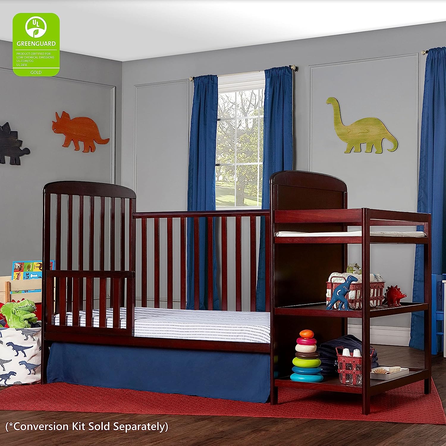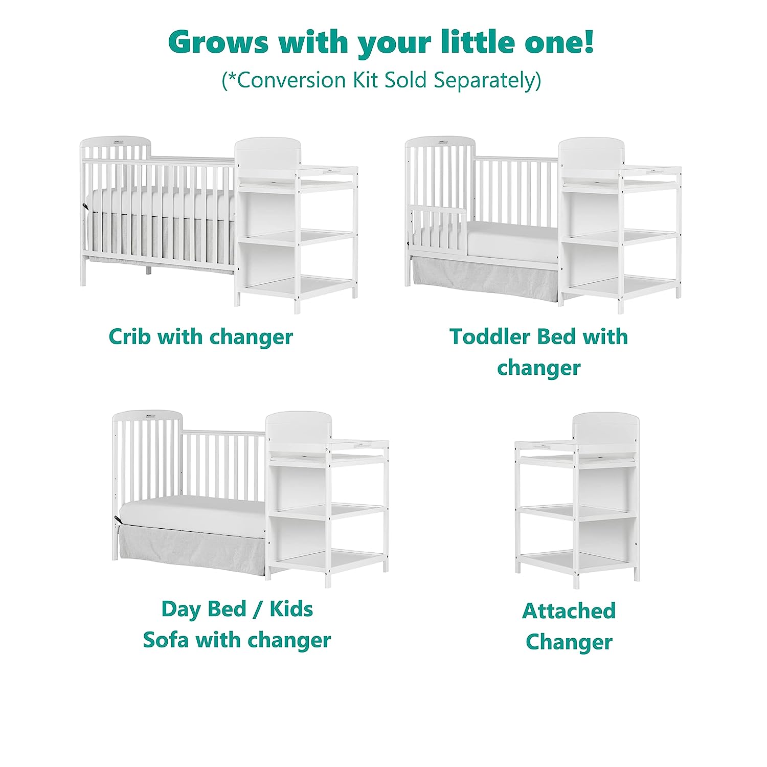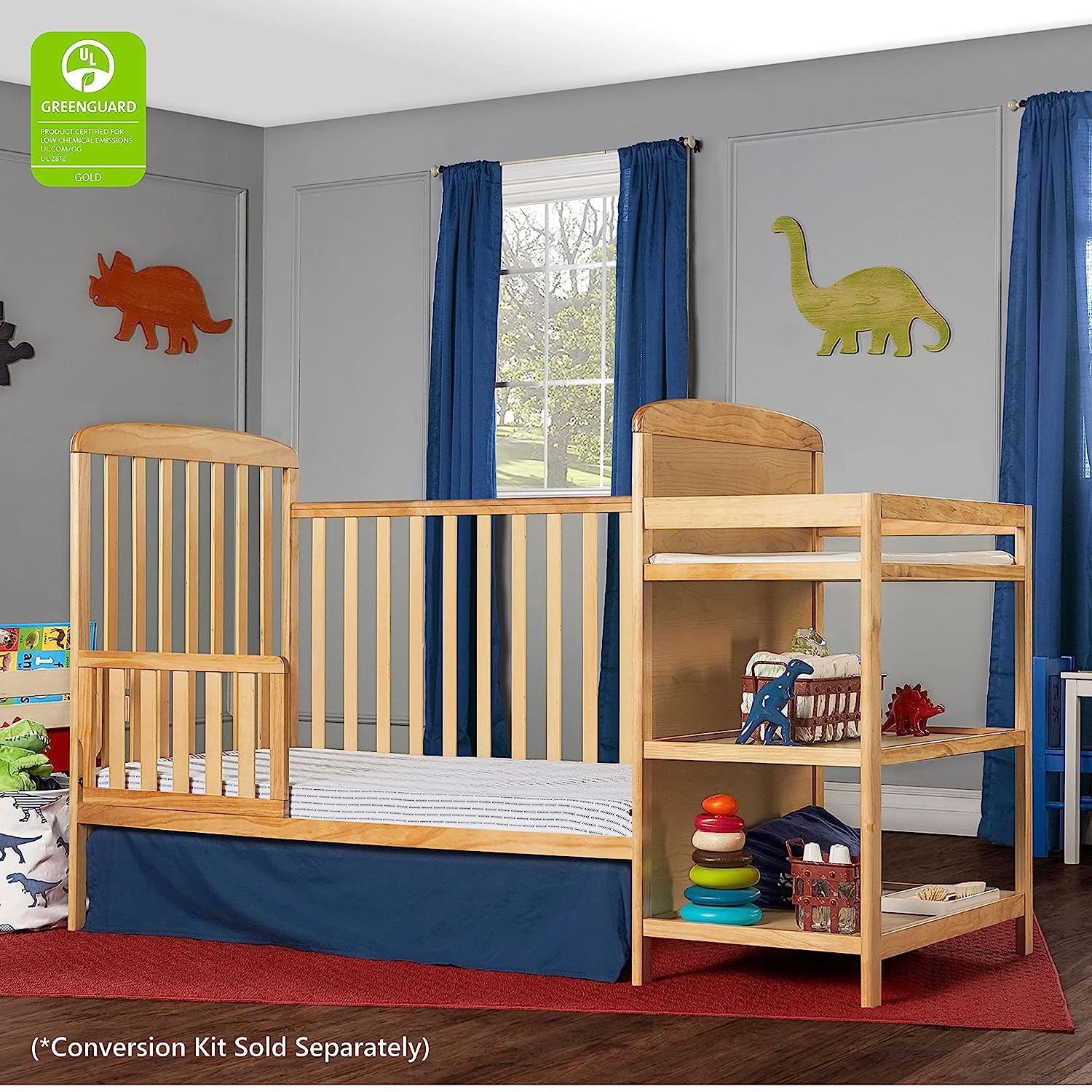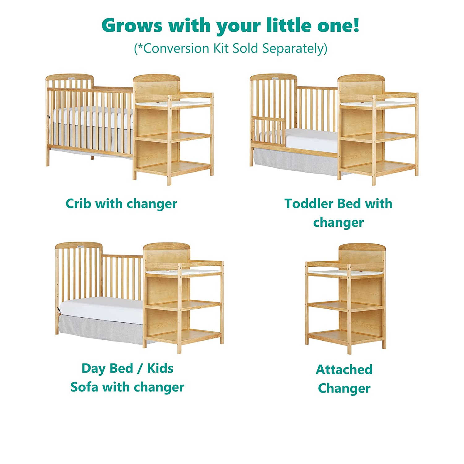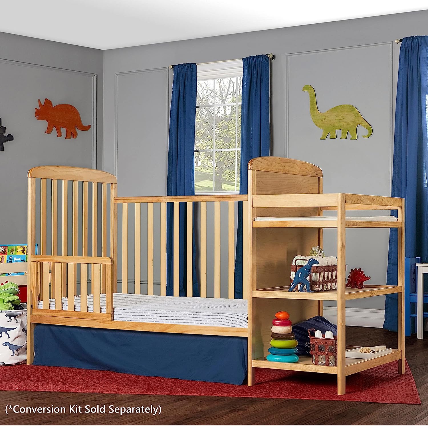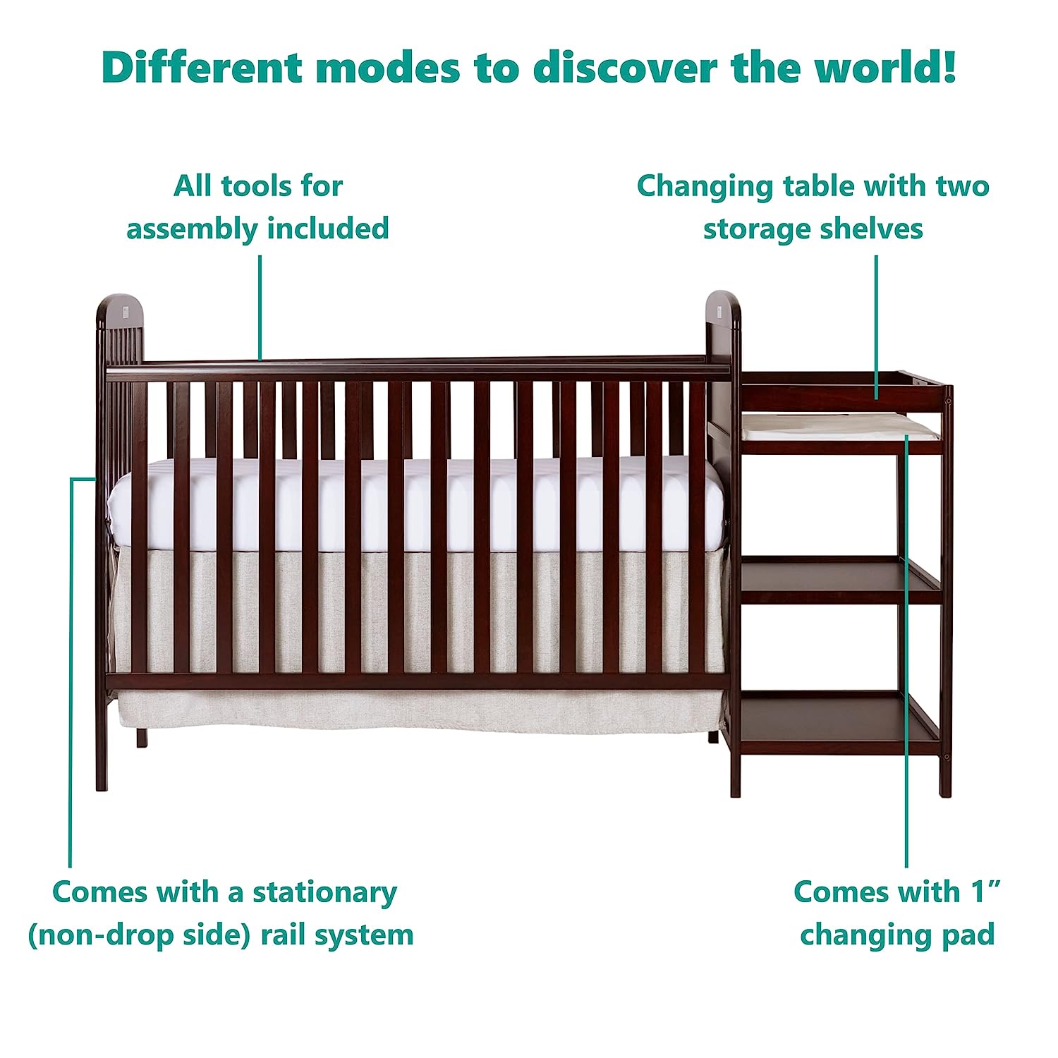 The Anna 4-In-1 Full Size Crib & Changing Table Combo is a stylish and functional investment that keeps pace with your child’s changing needs. Convert it from a crib to a toddler bed, and then a daybed (Toddler Guardrail/Stabilizer/Full Size Rail sold separately) as your child grows.The changing table with two storage shelves adds to the utility. The changing table is equipped with a custom fit 1” changing pad. There are two open storage shelves beneath the table, allowing you to keep baby essentials handy.The Anna features a sleek and modern design with clean lines. You can choose from six elegant finishes- Black, Cherry, Espresso, Natural, White & Storm Grey and match it effortlessly with any nursery theme! All Dream On Me cribs are tested to ensure all applicable ASTM, JPMA & CPSC standards are met. This Anna comes with a stationary (non-drop side) rail system for added safety. All tools for assembly are included, conversion kit sold separately. Choose any Dream On Me non-toxic, Greenguard certified standard crib mattress for the perfect fit. Maximum weight limit is 50 lbs.