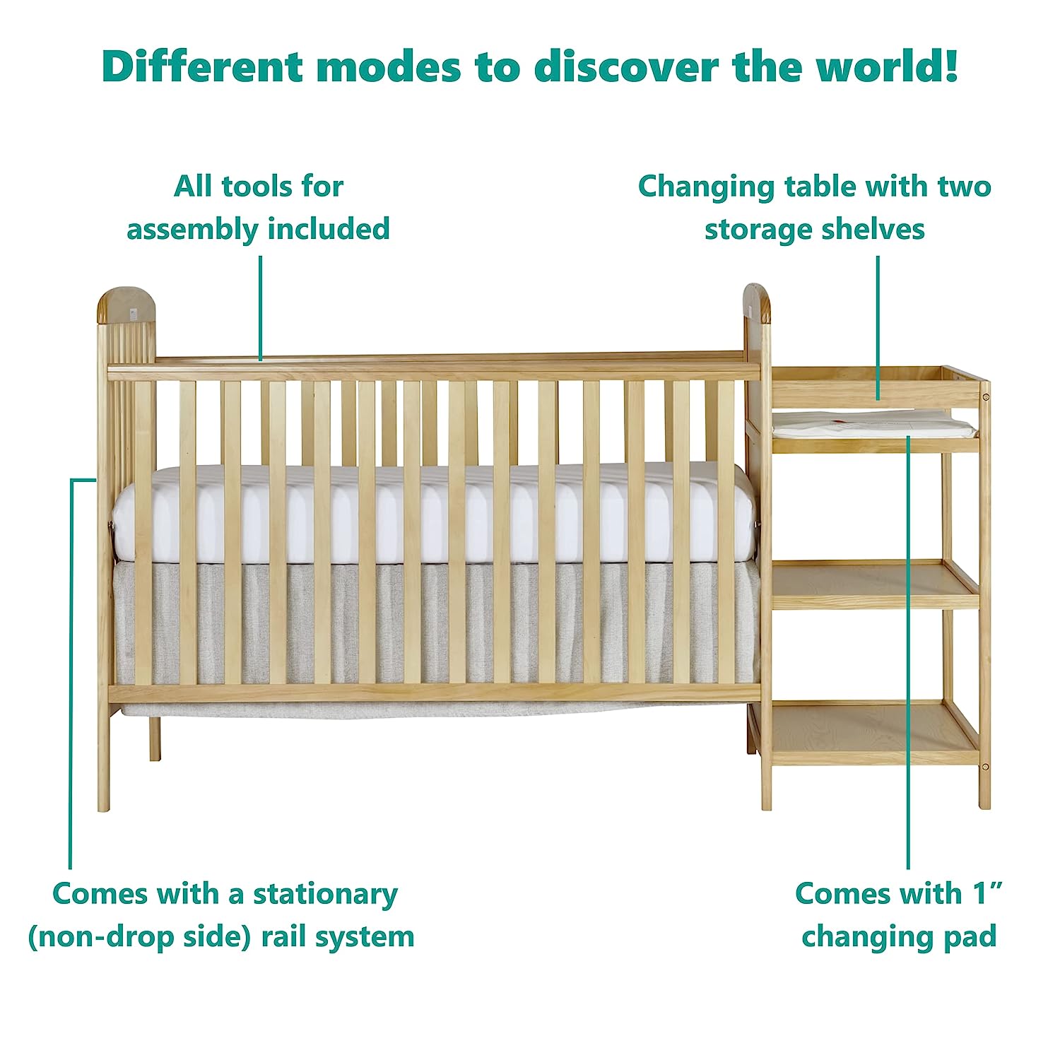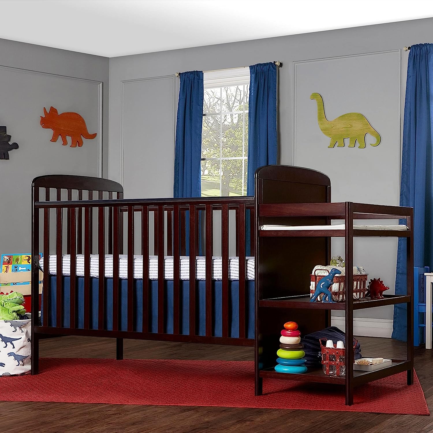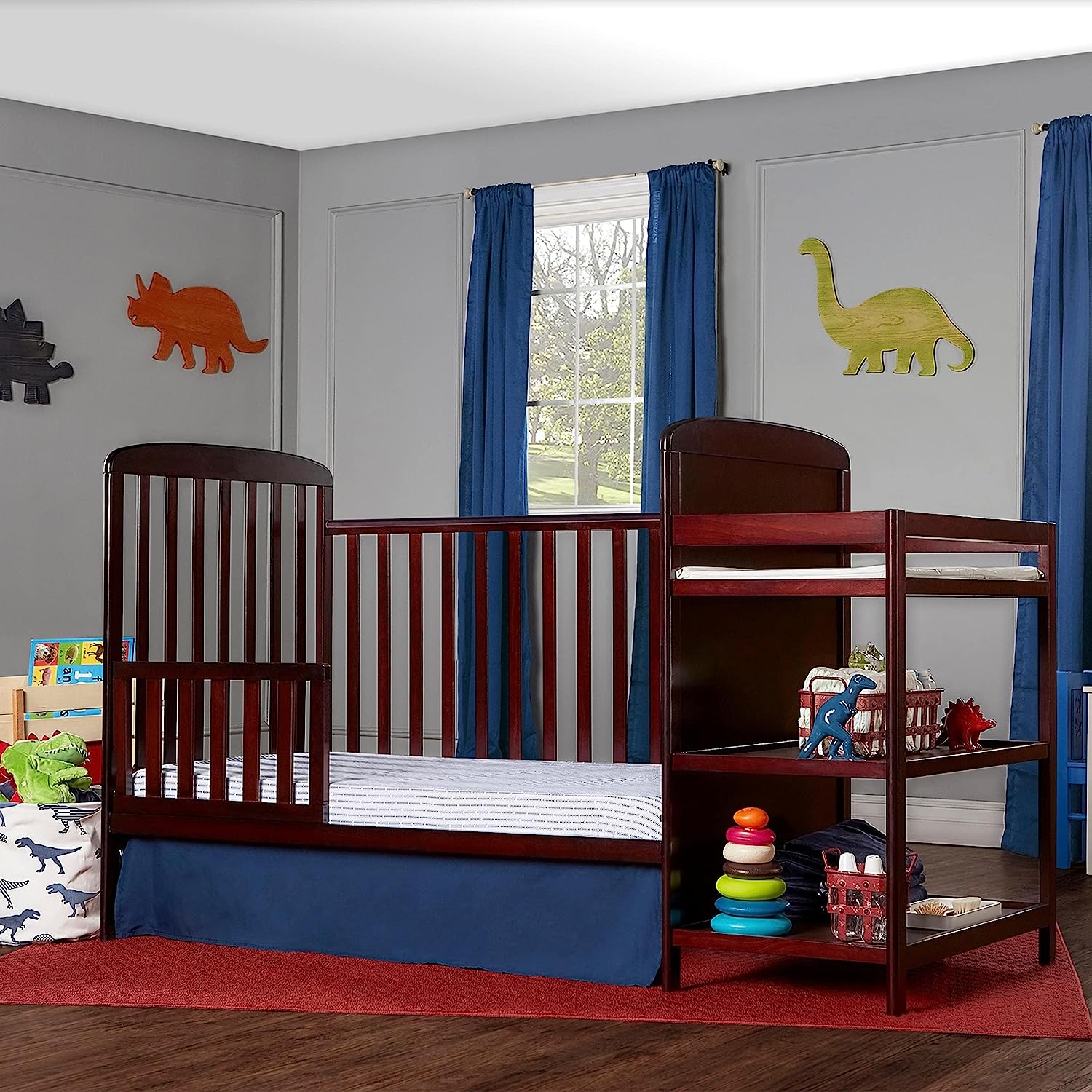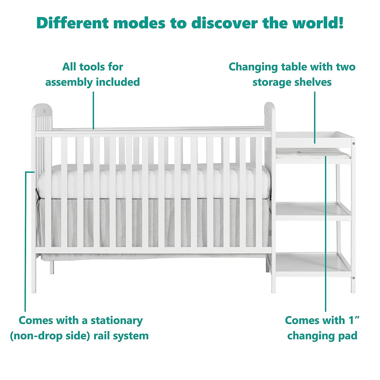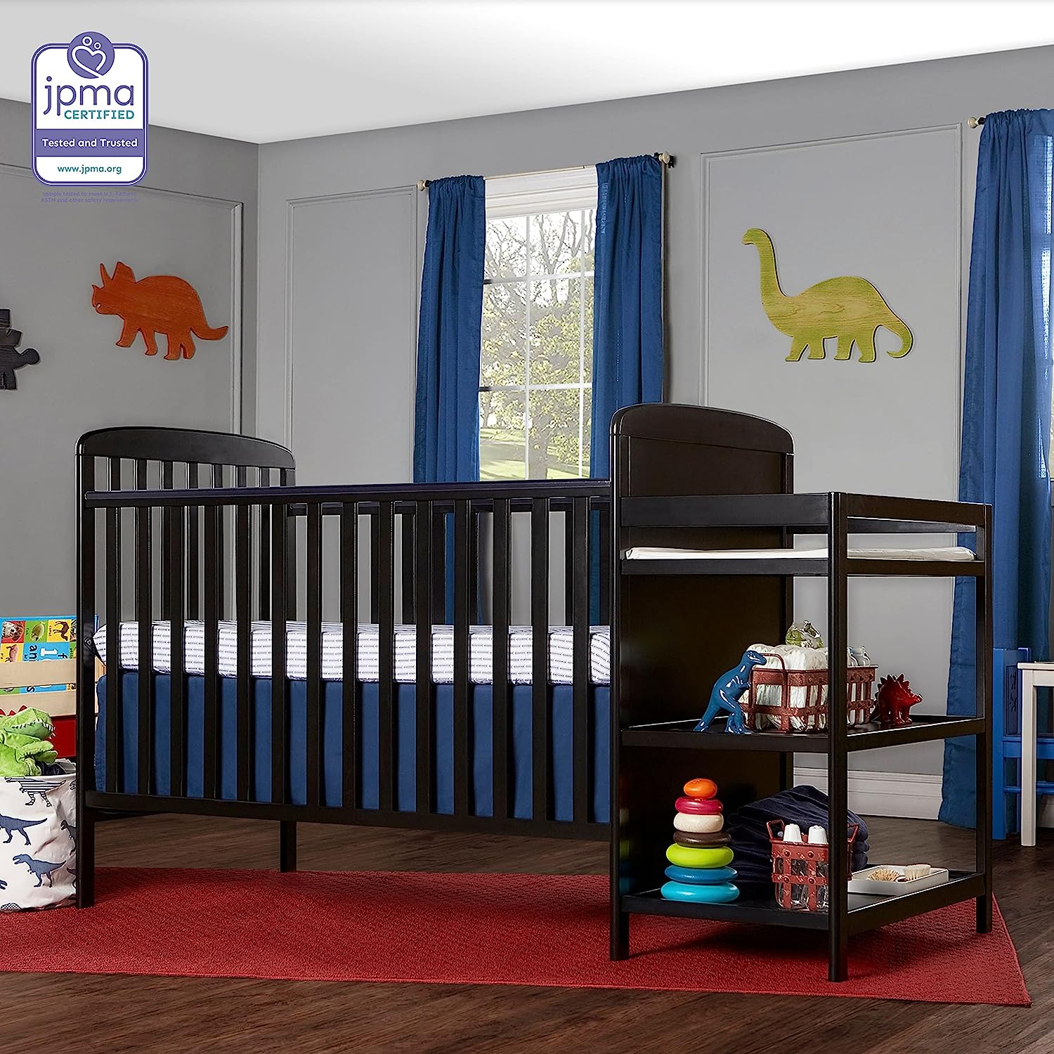 The Anna 4-In-1 Full Size Crib & Changing Table Combo is a stylish and functional investment that keeps pace with your child’s changing needs. Convert it from a crib to a toddler bed, and then a daybed (Toddler Guardrail/Stabilizer/Full Size Rail sold separately) as your child grows.The changing table with two storage shelves adds to the utility. The changing table is equipped with a custom fit 1” changing pad. There are two open storage shelves beneath the table, allowing you to keep baby essentials handy.The Anna features a sleek and modern design with clean lines. You can choose from six elegant finishes- Black, Cherry, Espresso, Natural, White & Storm Grey and match it effortlessly with any nursery theme! All Dream On Me cribs are tested to ensure all applicable ASTM, JPMA & CPSC standards are met. This Anna comes with a stationary (non-drop side) rail system for added safety. All tools for assembly are included, conversion kit sold separately. Choose any Dream On Me non-toxic, Greenguard certified standard crib mattress for the perfect fit. Maximum weight limit is 50 lbs.