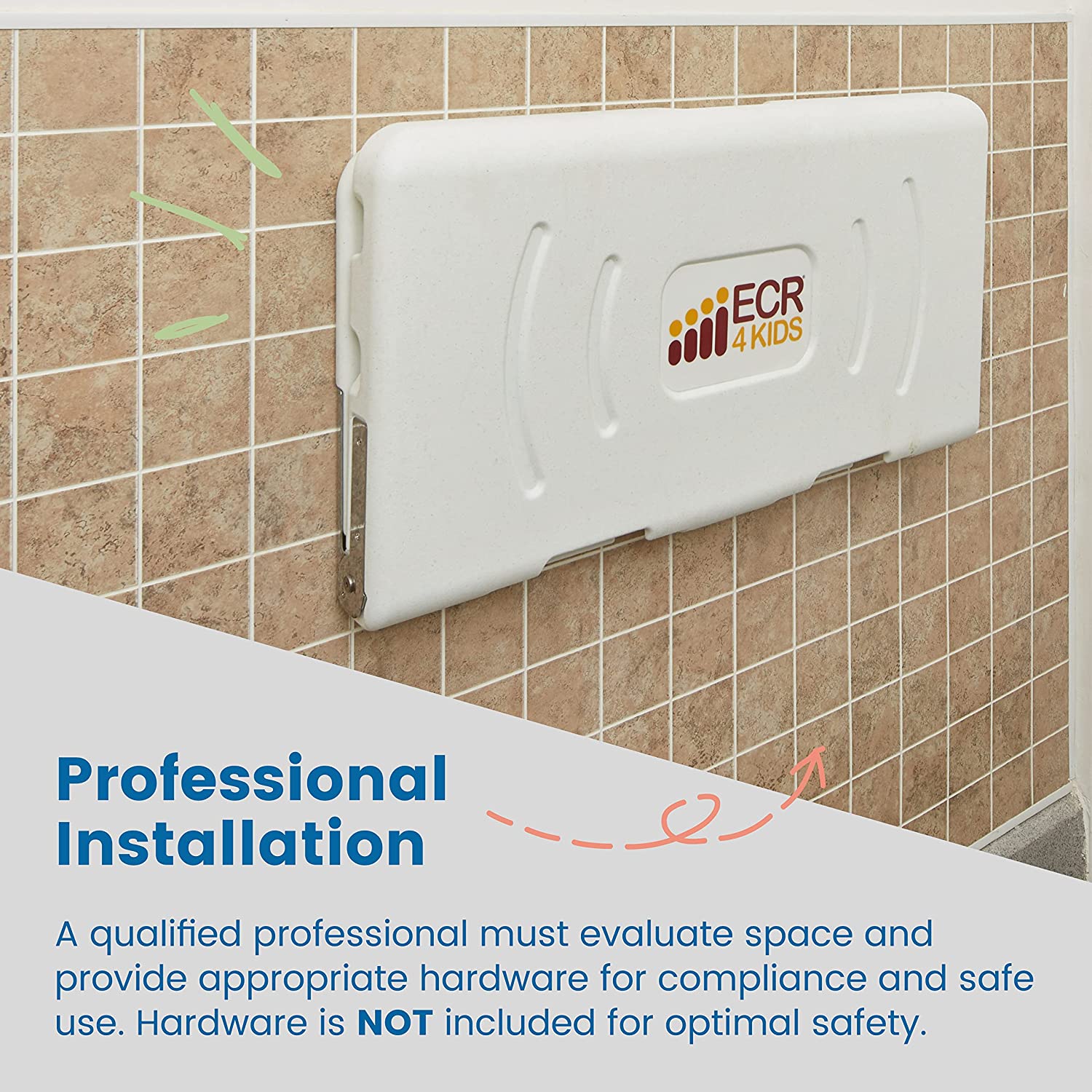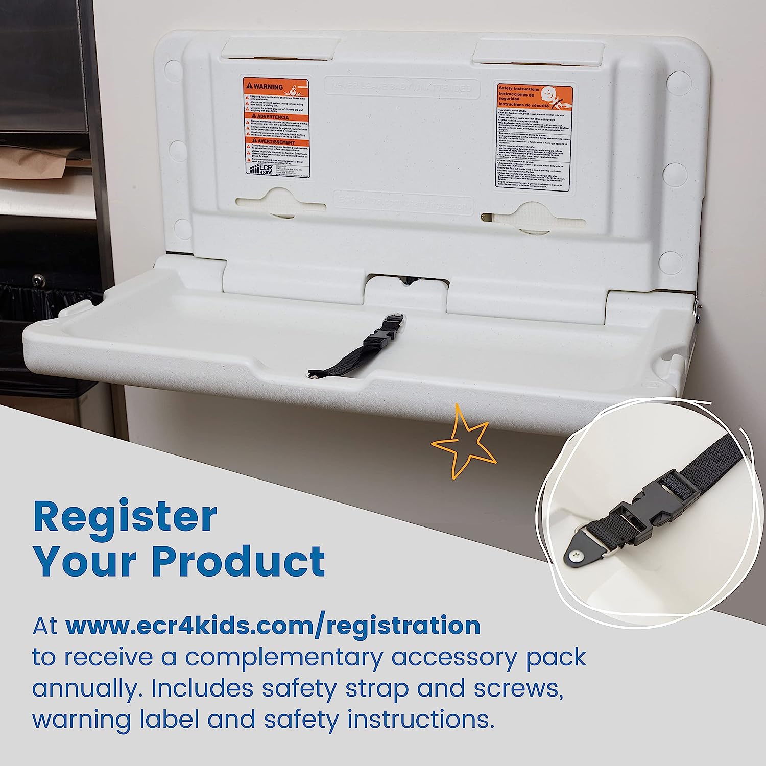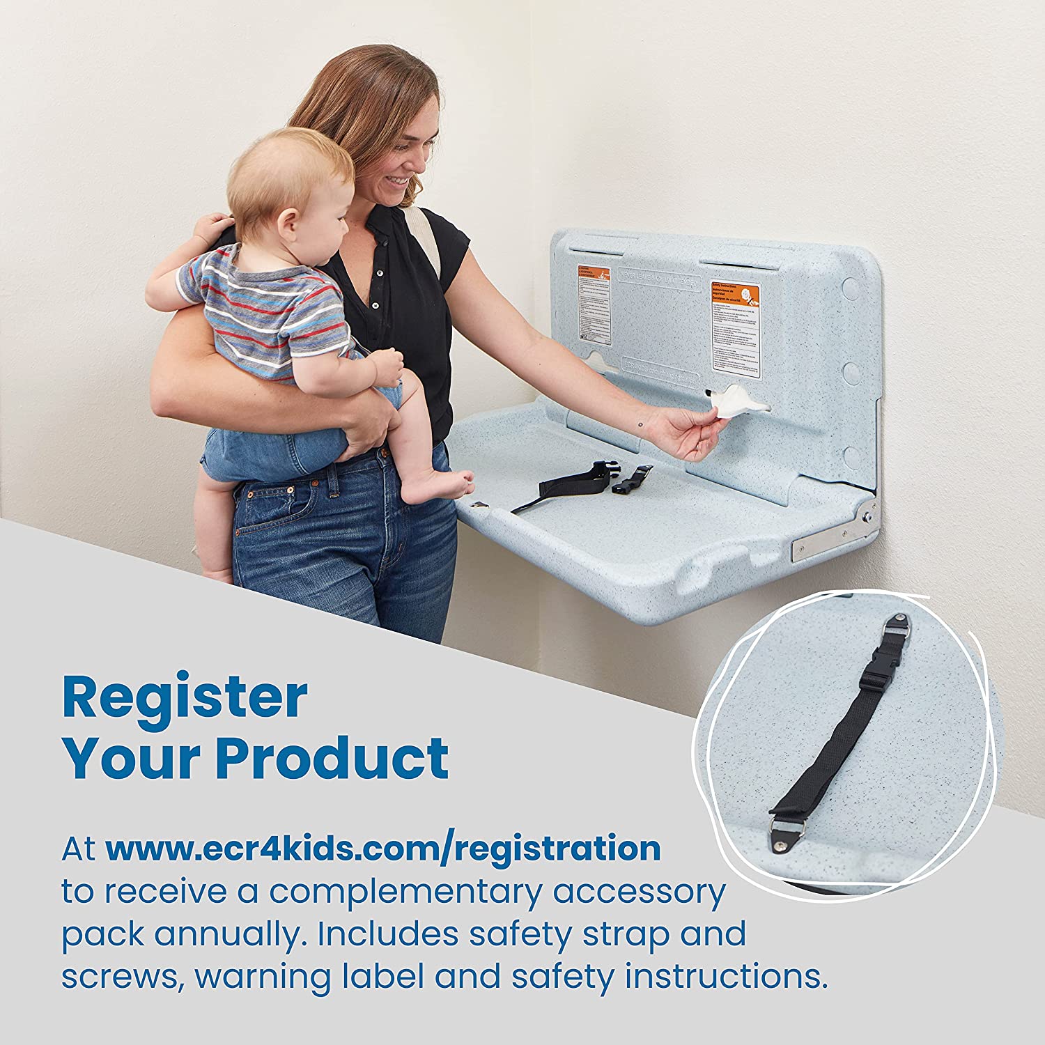 Restaurants, businesses, and other locations with public or private restrooms will appreciate the durability, safety, and style infused into this ADA-, ANSI-, and ASTM-compliant baby changing station. Developed with space-saving design, our Wall-Mounted Baby Changing Station is a horizontal fold-down diaper changing table with built-in safety straps, designed for use with infants and toddlers in commercial or institutional facilities. Smooth and comfortable concave changing surface featuring an adjustable nylon child safety strap with slide release to keep kids safely in place. Featuring a high-density polyethylene plastic for strength and durability in an attractive neutral color. Handy features include 2 diaper bag/purse hooks and 2 built-in paper liner dispensers (sold separately). A concealed pneumatic cylinder ensures slow, safe, controlled opening and closing. Tested to hold up to 100lbs, designed to hold children up to 50lbs. Due to the variety of installation options, ECR4Kids does not include hardware for installation. A qualified professional must evaluate the location and provide the appropriate hardware to ensure compliance and safe use. Register your product to receive a free accessory pack annually that includes replacement safety straps with screws, new warning labels, and safety instructions.