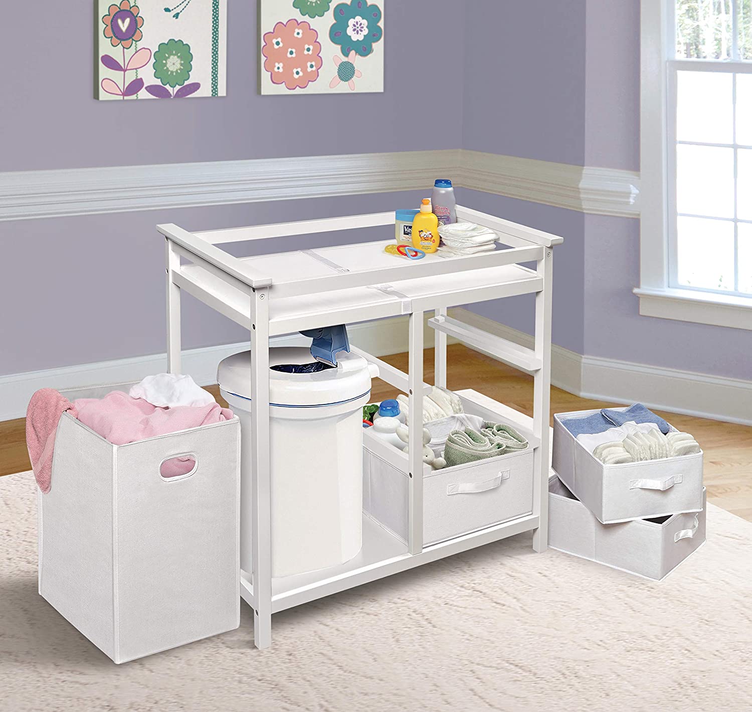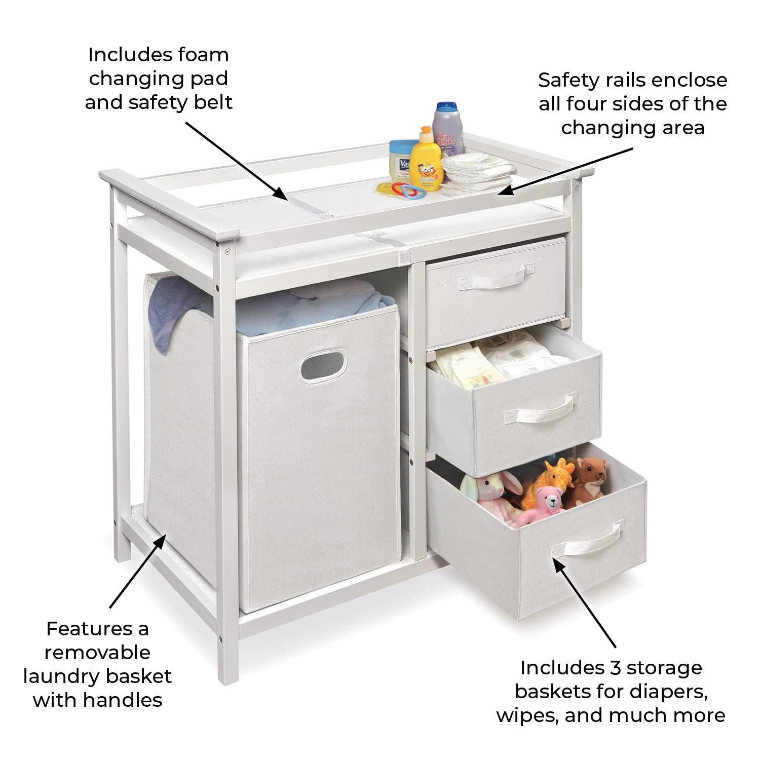 • Ample room for diaper changing on top with a laundry hamper and three storage baskets included below