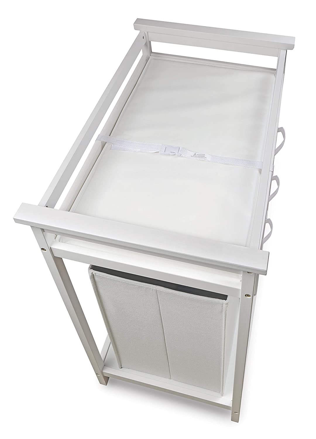 Badger Basket’s Modern Baby Changing Table with Hamper and 3 Baskets is a practical and stylish place for diaper changing and getting baby ready for the day. Includes a large hamper and three baskets. Hamper is fully removable leaving you a convenient spot in the changing table for your diaper pail. Includes a foam changing pad and safety belt, too. When Baby outgrows this table, it becomes a useful piece of furniture for organizing toys and more. Safety rails enclose all four sides around the top of the table. Metal support bar beneath the changing surface provides additional stability. Hamper and baskets fold for storage. Changing Table frame is made with multi-layer solid wood, and the shelves are engineered wood with veneer. All paints and finishes are non-toxic. Outside fabric covering on the baskets is 80% Polyester/20% Cotton. Inside lining on the baskets, including the bottom panels, is non-woven fabric. Changing pad is polyurethane foam covered with wipe clean PEVA (non-PVC) vinyl. Overall unit measures 34.25 inches W x 20.75 inches D x 34.5 inches H. Hamper measures 13.5 inches L x 13.75 inches D x 21.5 inches H. Baskets measure 14.5 inches L x 17 inches W x 7 inches H. Changing pad measures 31 inches L x 17.5 inches W x 1 inch H. All measurements approximate. Wipe and spot clean as needed. Basket color depends on color of the table (baskets are either White or Ecru). Changing table is for use with children weighing up to 30 lbs (13.6 kg). Adult assembly required. Illustrated assembly instructions included. Meets all currently applicable testing standards. Product includes a limited warranty of 30 Days Parts to the original purchaser. Product may vary slightly from shown and described. Props/accessories shown are for illustration purposes only and are not included with the product. Actual color/finish may vary slightly from screen display. This item ships in its original carton which may include a product photo.