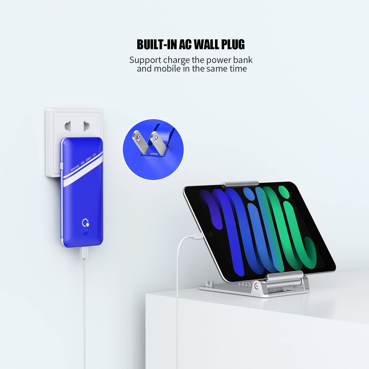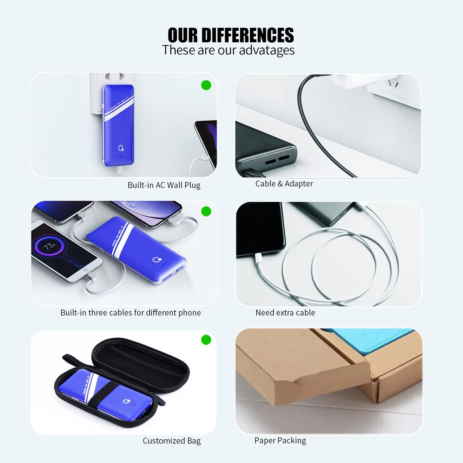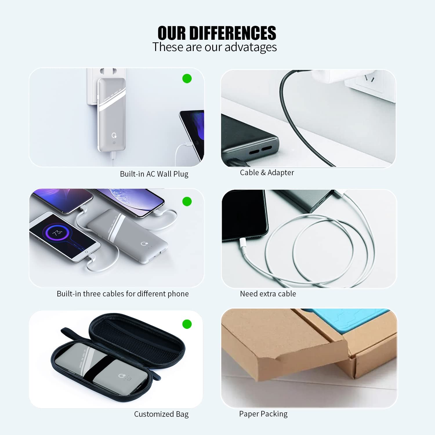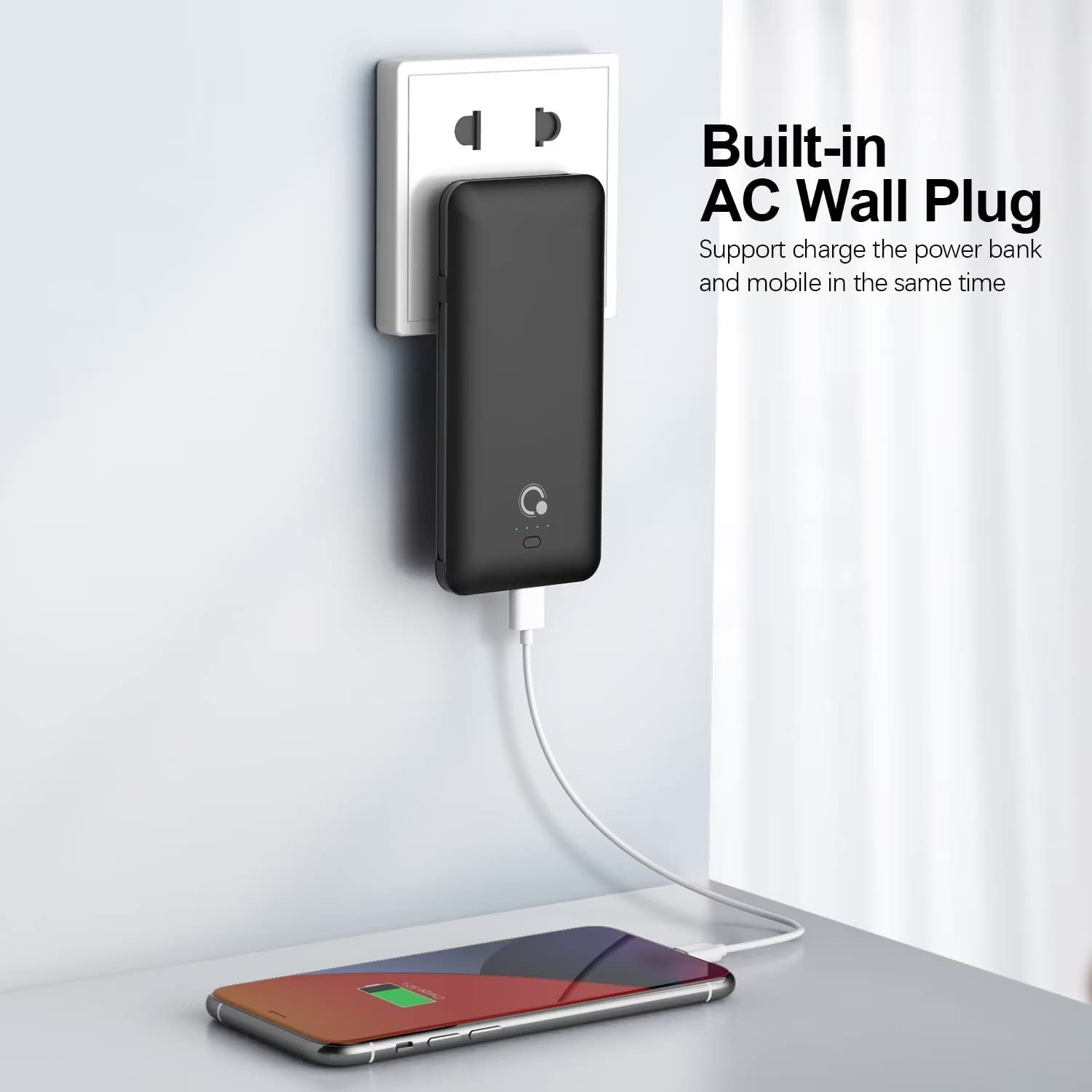 • [SLIM AND COMPACT SIZE POWER BANK]:Q External battery pack only 0.6inch, ultra-thin design, and light weight, which make it easier to carry, built-in AC plug and cables are collapsible, will not give you too much trouble when carrying out
