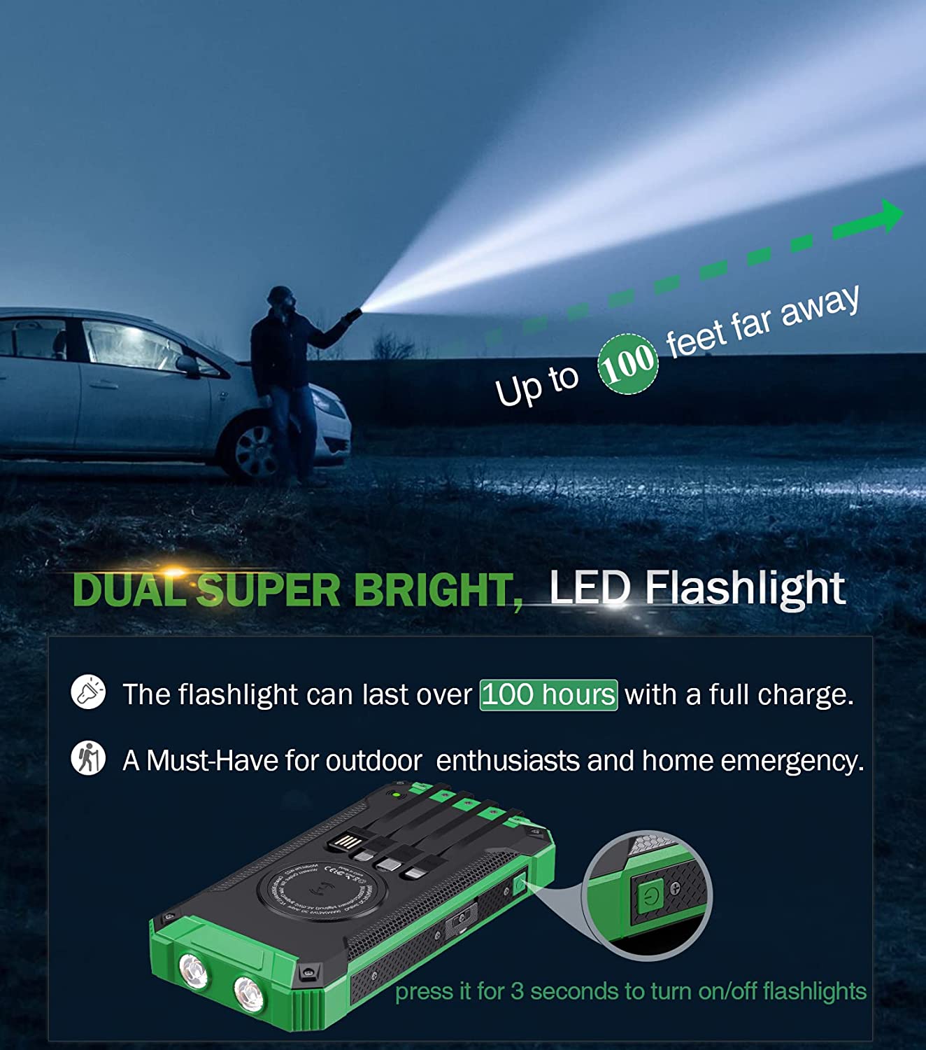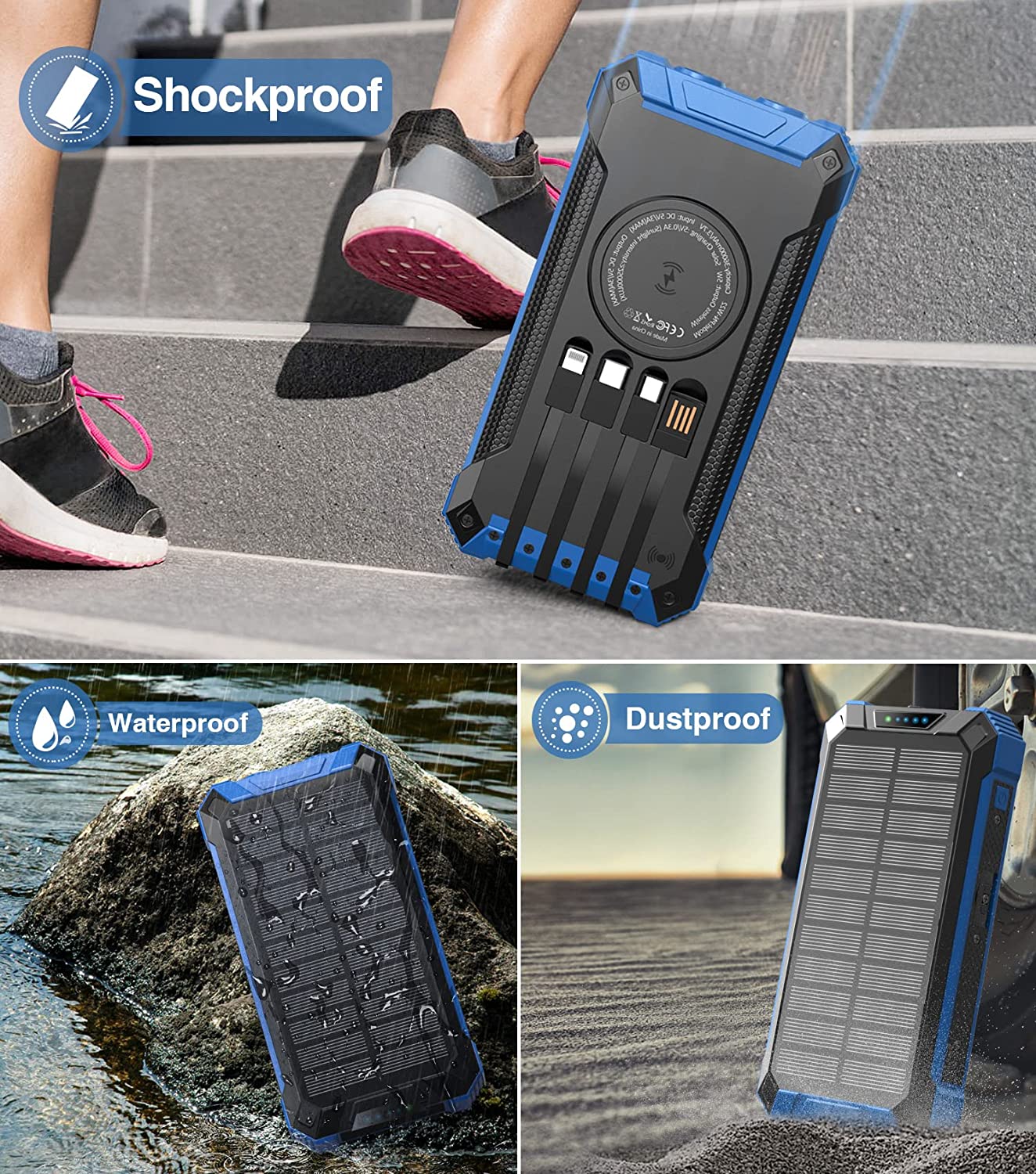 • [Sturdy&Durable Design for Outdoor] This solar battery pack is well made to be Waterproof/Shockproof/Dust-proof, which can withstand the harsh environment outdoors. It’s equipped with Dual super bright LED lights, a Must-Have tool for outdoor activities and home emergencies.