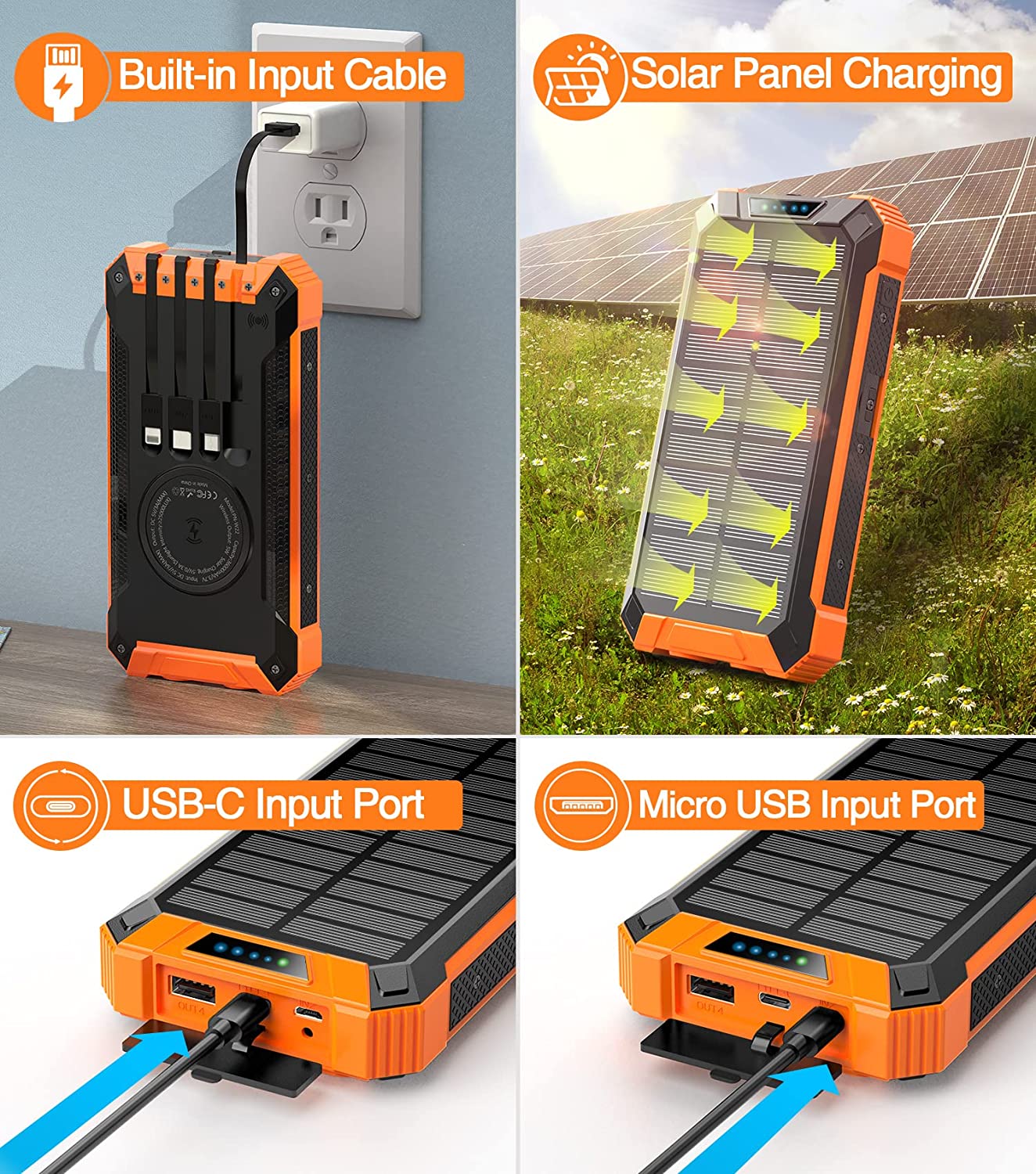 • [Power 6 Devices at Once] This solar charger is also equipped with 4 ports (Micro USB input, USB A output, USB C input/output), providing 5V/3A high-speed charging to save time. Along with 4 charging cables and wireless charging, it supports charging 6 devices simultaneously. Keep all your devices alive. Sharing with families and friends is perfect.
