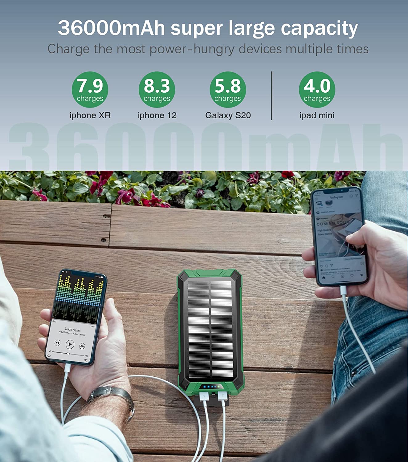 • [Super Large Capacity] With 36000mAh premium Li-polymer battery, this solar power bank can charge your devices multiple times. It can be recharged via adapter and solar power, free your worries of poweroff. Equipped with smart protection IC chip, it guarantees charging safety intelligently.