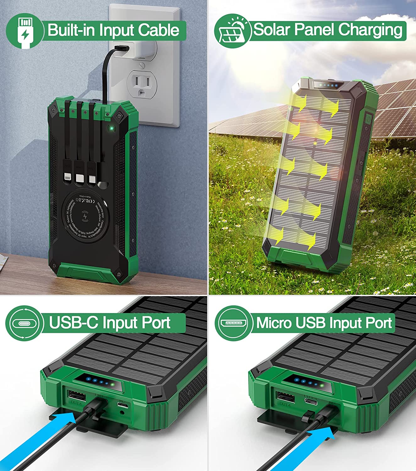 • [Built-in 4 Charging Cables] This power bank is built with 3 output cables ( Type C*1 & iOS*1 & Micro USB*1) and 1 USB-A input cable. No matter output or input, you don’t need to carry charging cables. Get rid of messy cables, charge at anytime and everywhere.