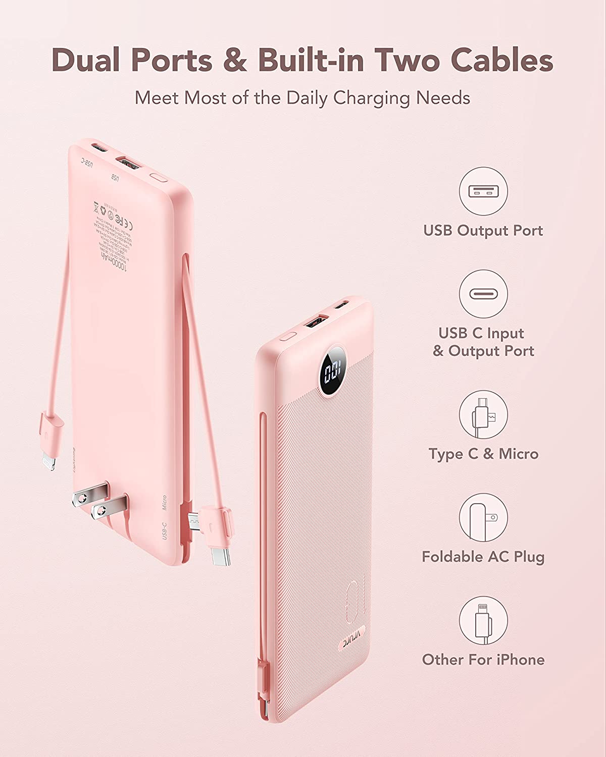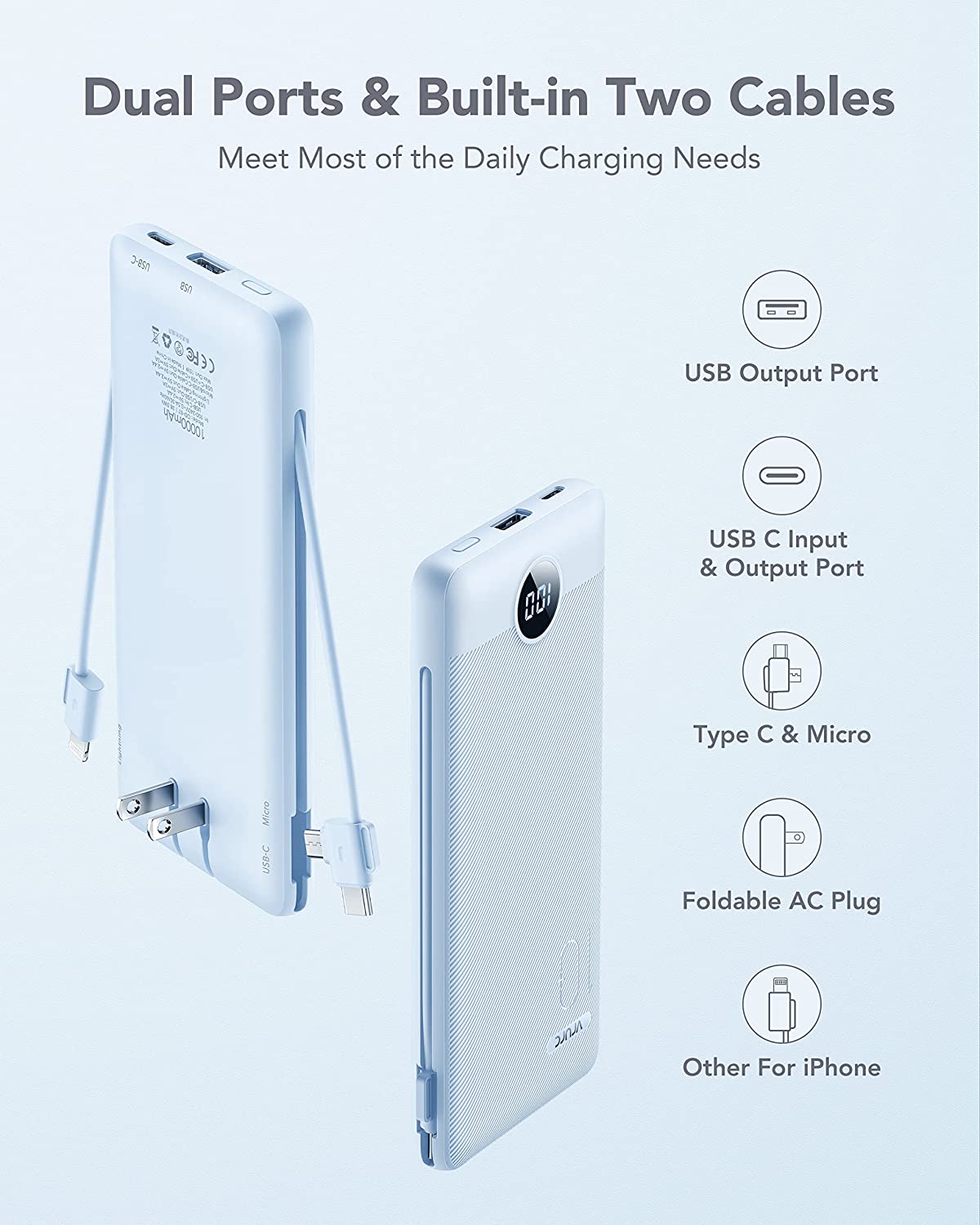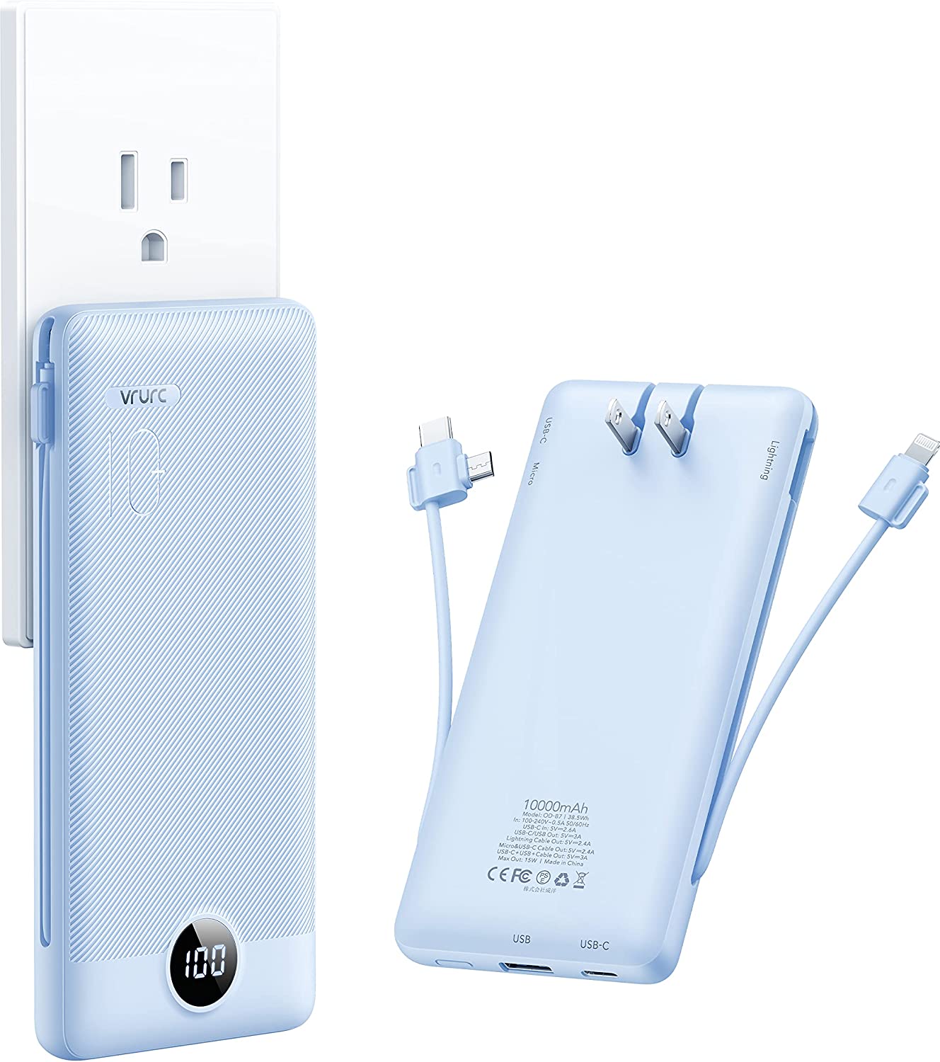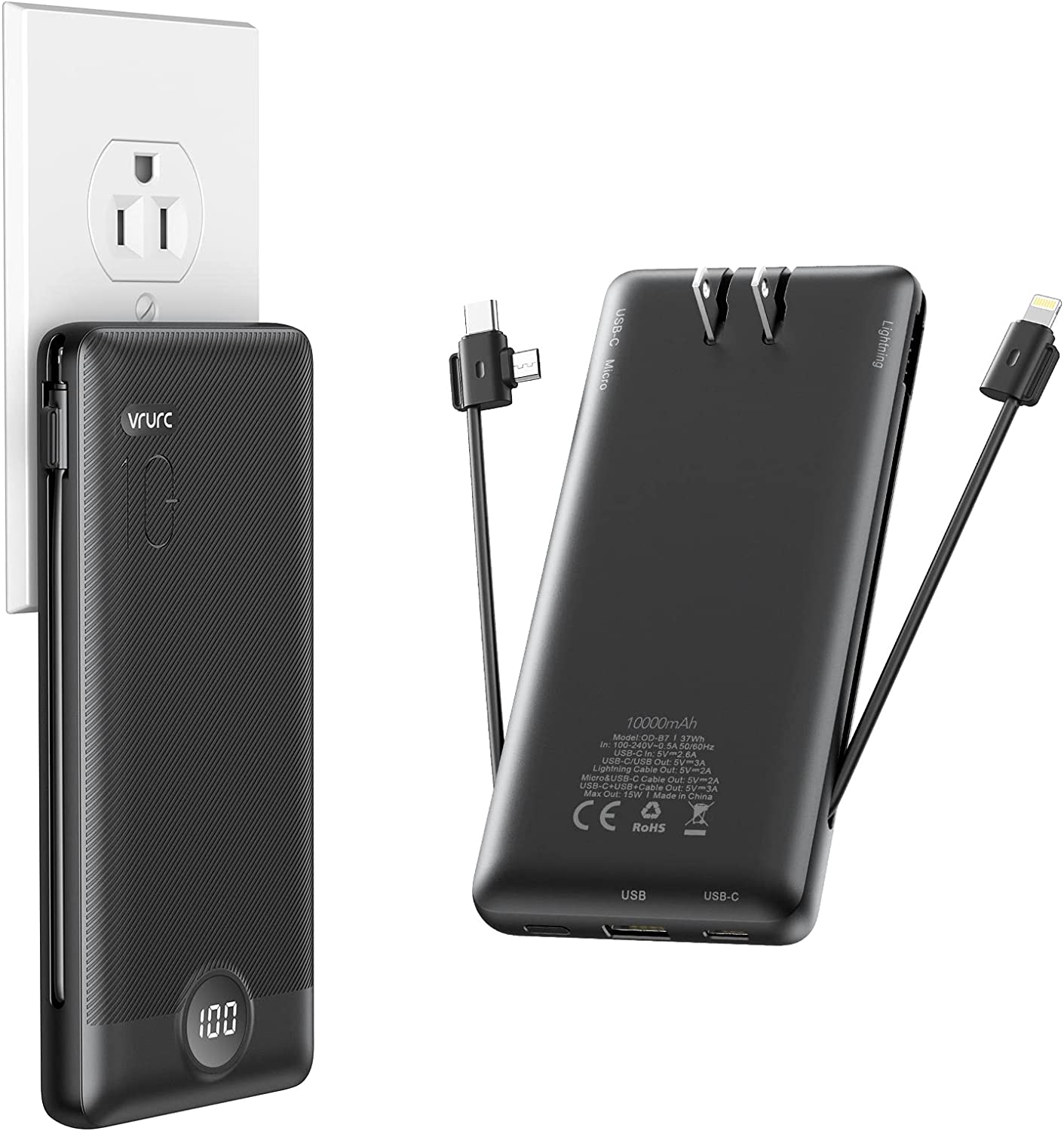 Portable Charger with Built-In Cables and AC Wall Plug,VRURC 10000mAh Phone Charger,5 Output & 2 Input LED Display External Battery Pack,Ultra Slim USB C Power Bank Compatible with Smart Devices-Black