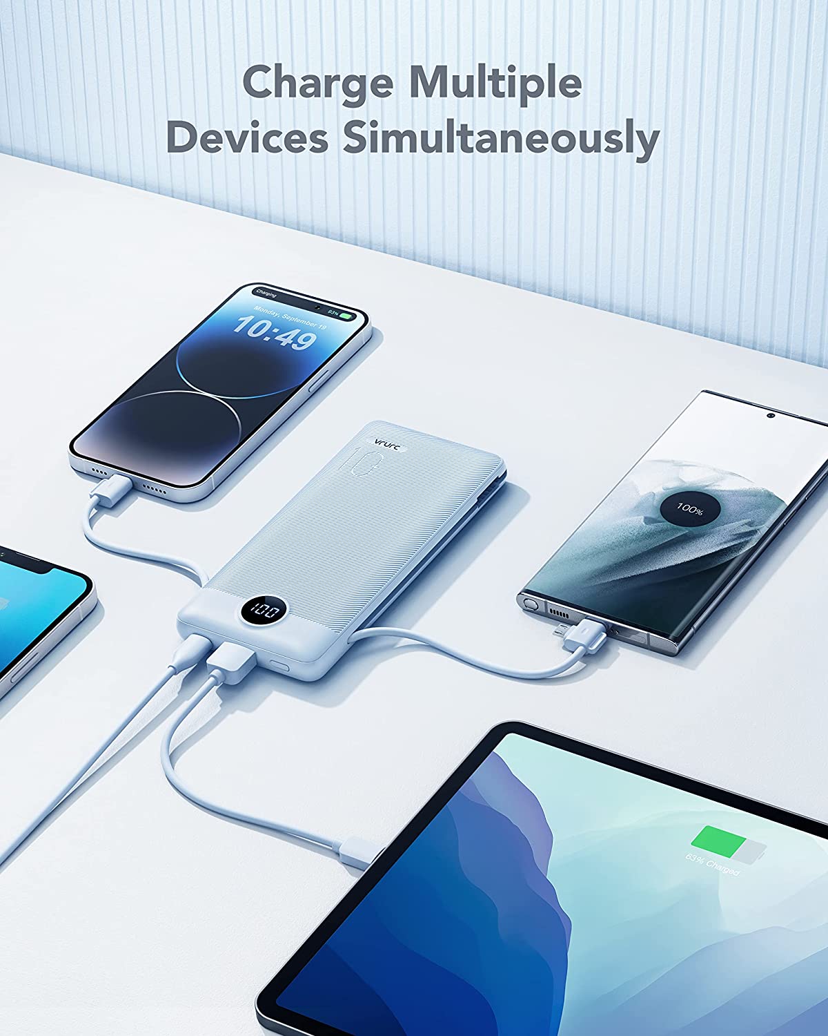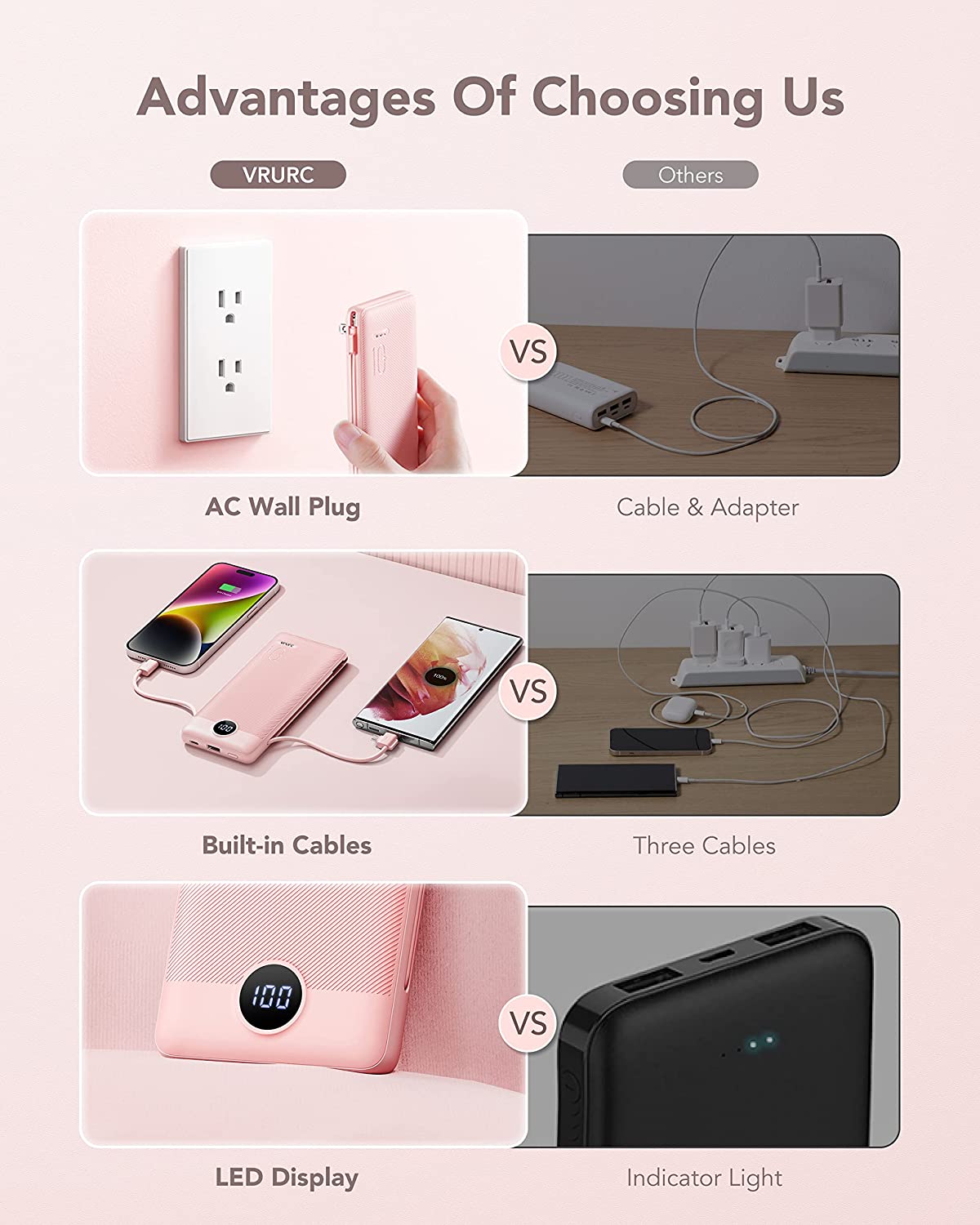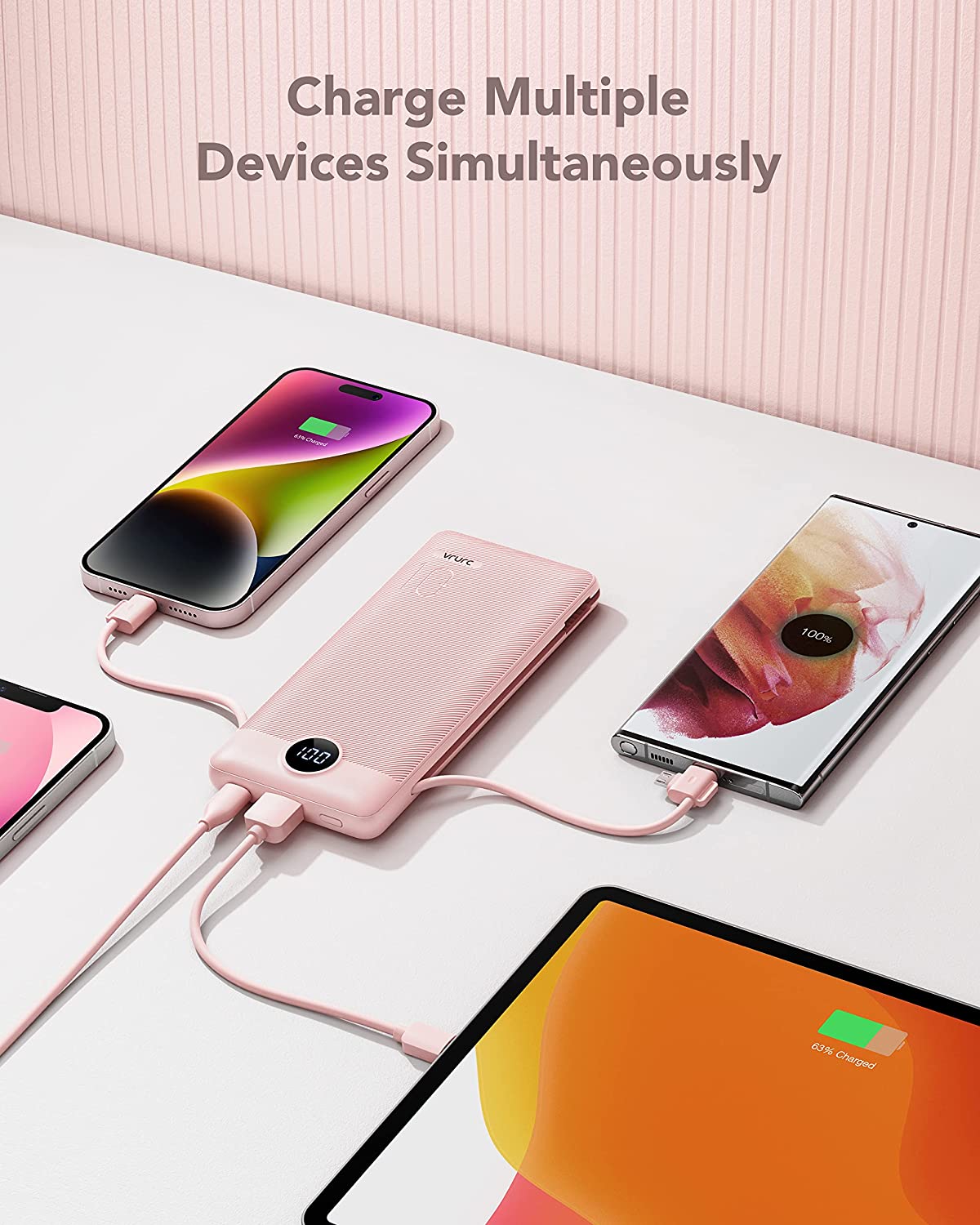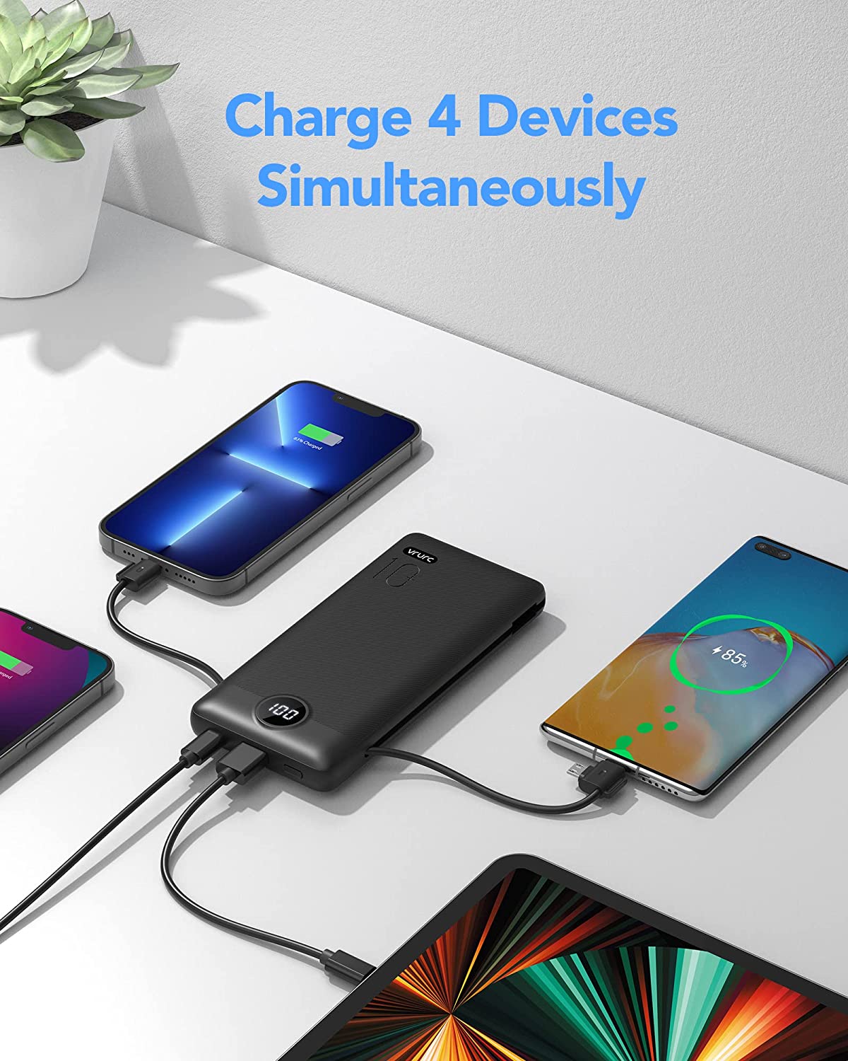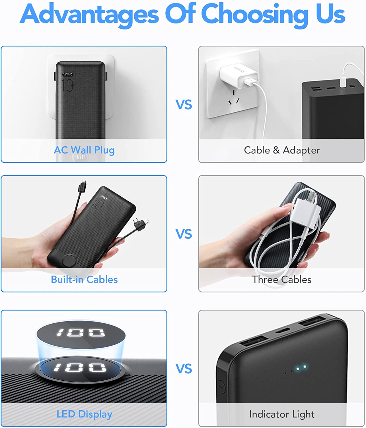 Portable Charger with Built-In Cables and AC Wall Plug,VRURC 10000mAh Phone Charger,5 Output & 2 Input LED Display External Battery Pack,Ultra Slim USB C Power Bank Compatible with Smart Devices-Black