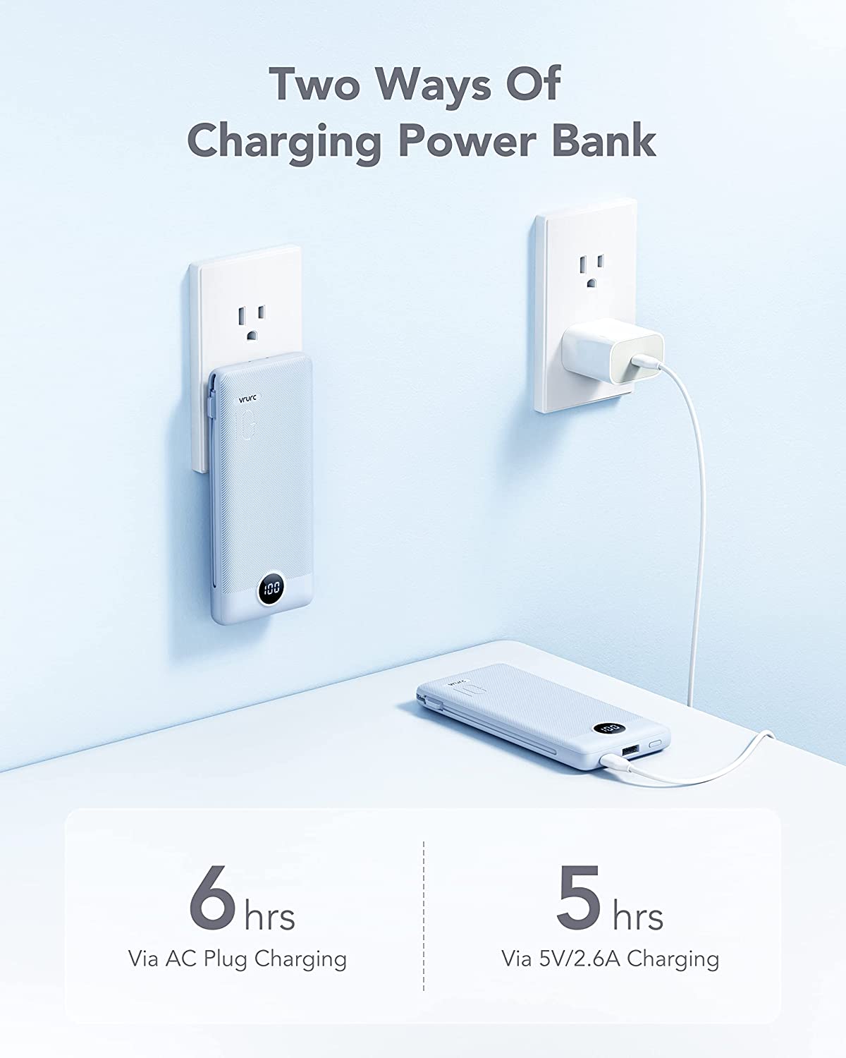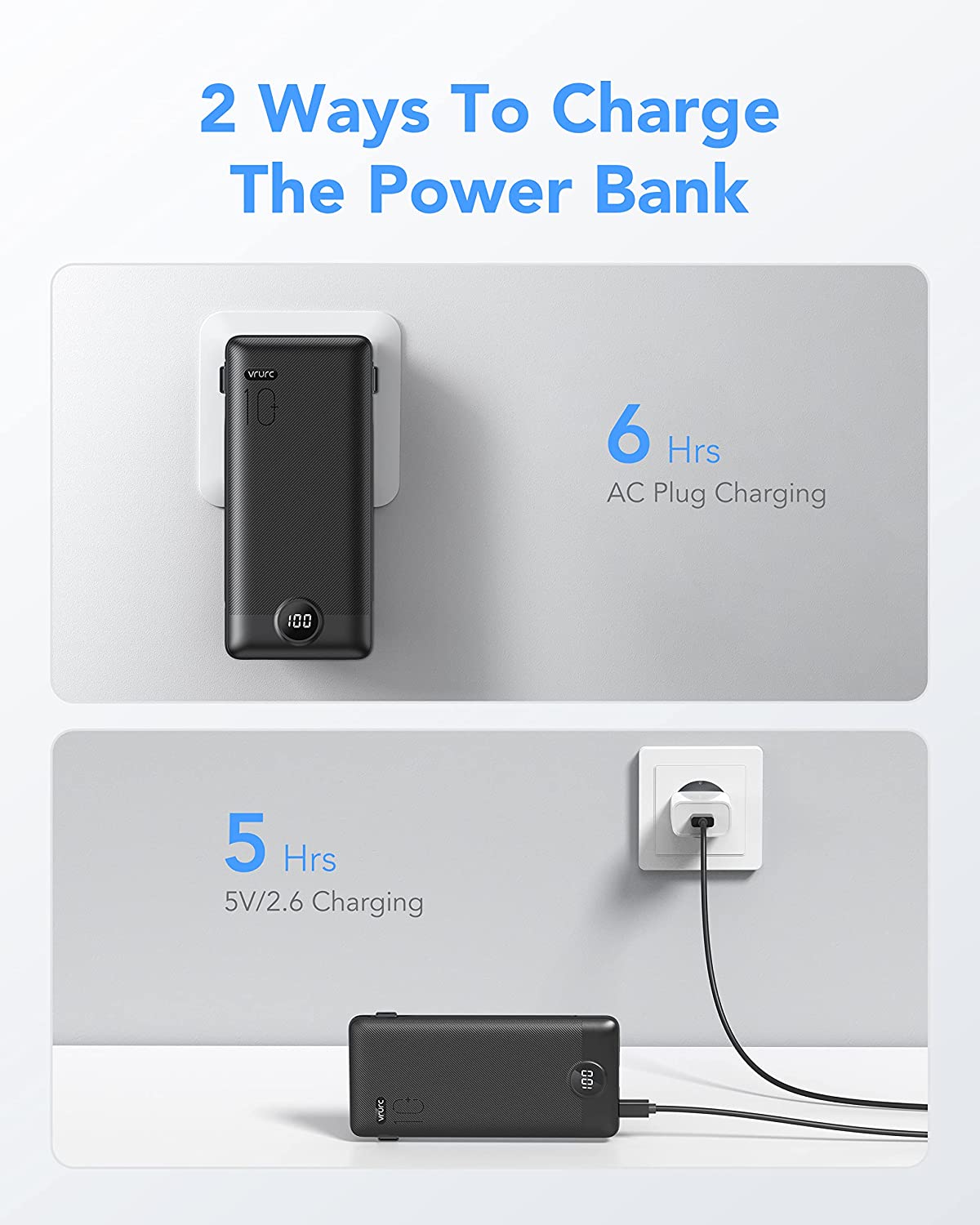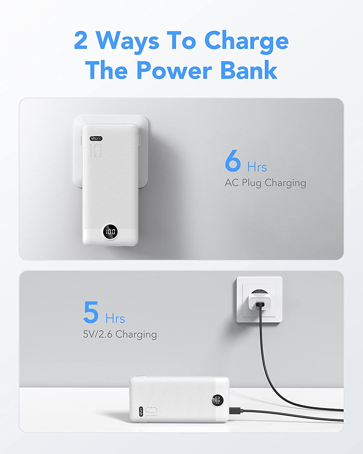 • [Two Way To Charge The Power Bank] One is charging the power bank through the AC wall plug, it will be fully charged within 6 hours. The other is using the 5V/2.6A charging cable to charge the power bank itself, it will be fully charged within 5 hours.