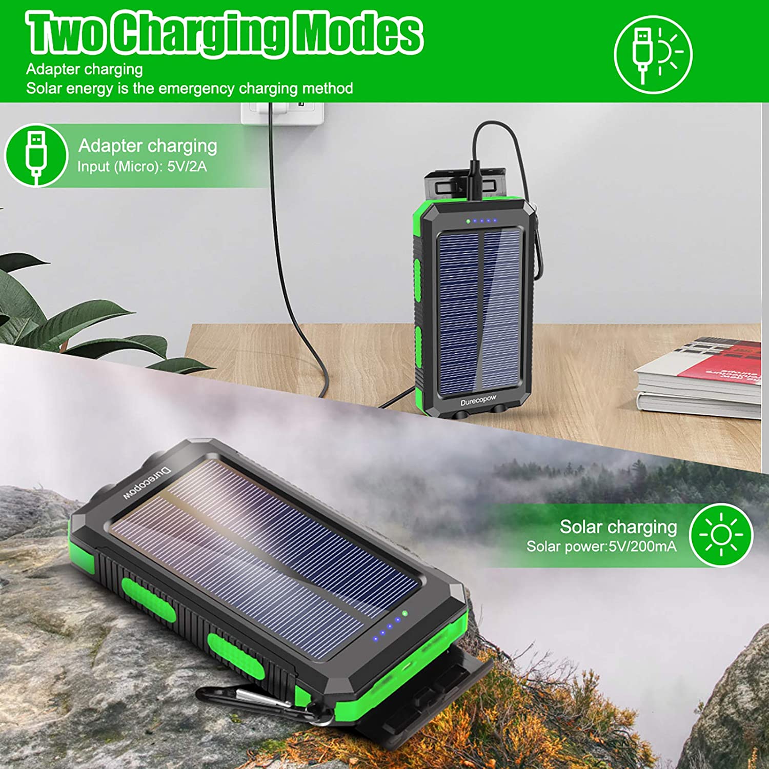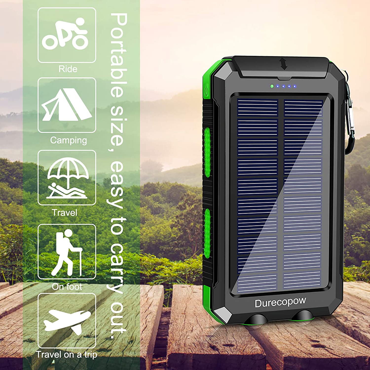 • High-Quality Portable Solar Charger - water-resistant, shock-resistant and dustproof solar phone charger, featured with carabiner, compass, and 2LED flashlight. Solar power bank provides more convenience in your daily or on your trip. Awesome for outside activities such as camping, hiking, and other emergency use. The solar USB battery pack can be regards as a nice gift.