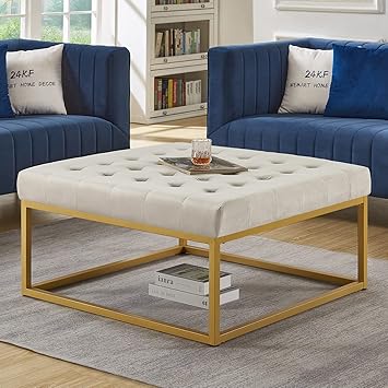 24KF Middle Century Upholstered Tufted Coffee Table with Velvet Padded Seat, Large Square Ottoman with Golden Metal Frame -Taupe